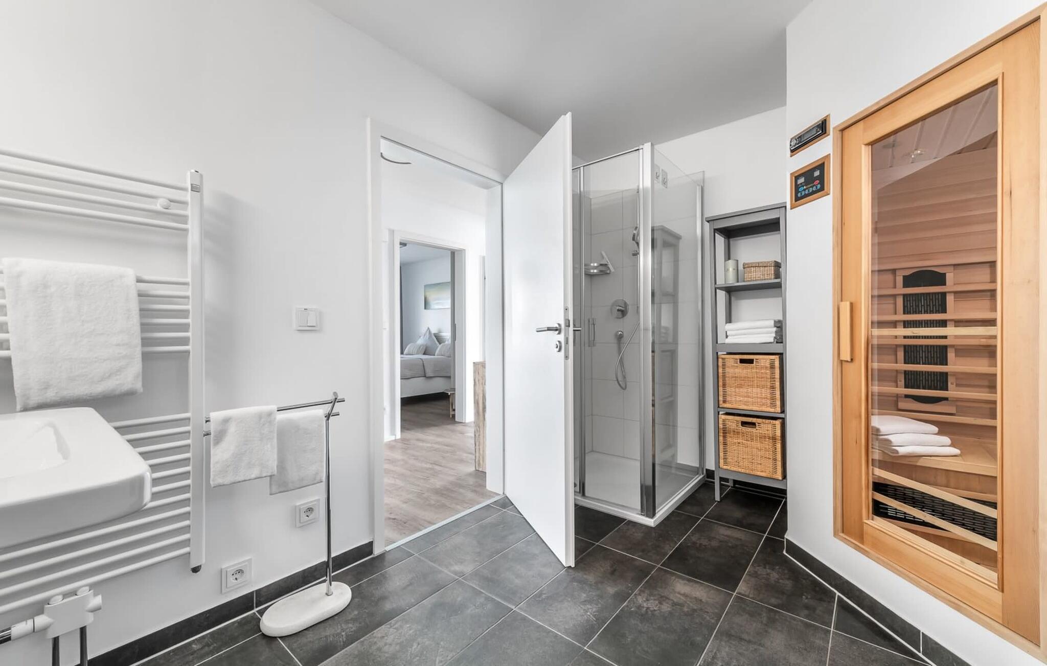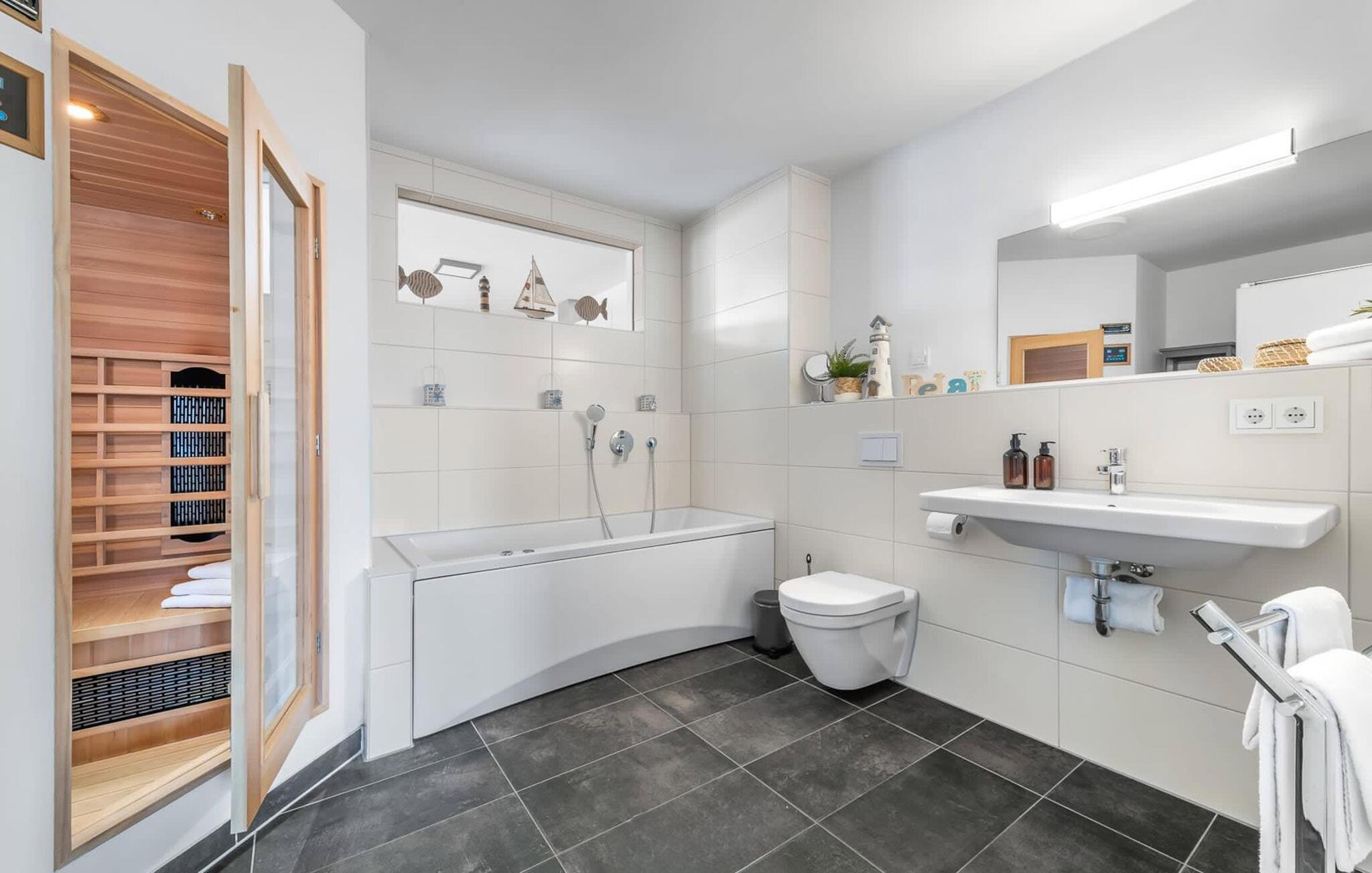 Wellness-Liebhaber kommen ganz auf ihre Kosten, InfrarotSauna (Wärmekabine) mit Hifi-Sound-System und LED-Farblichttherapie sowie eine Whirlpool-Badewanne laden nach dem Strandspaziergang zum Entspannen ein. Für zusätzlichen Komfort sorgt eine Dusche.