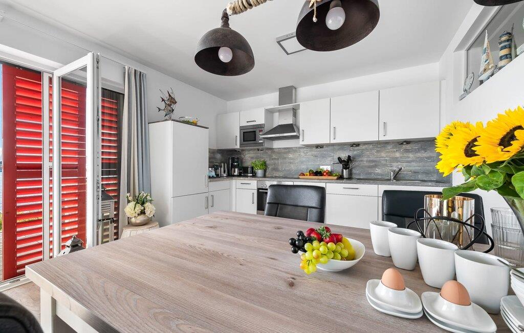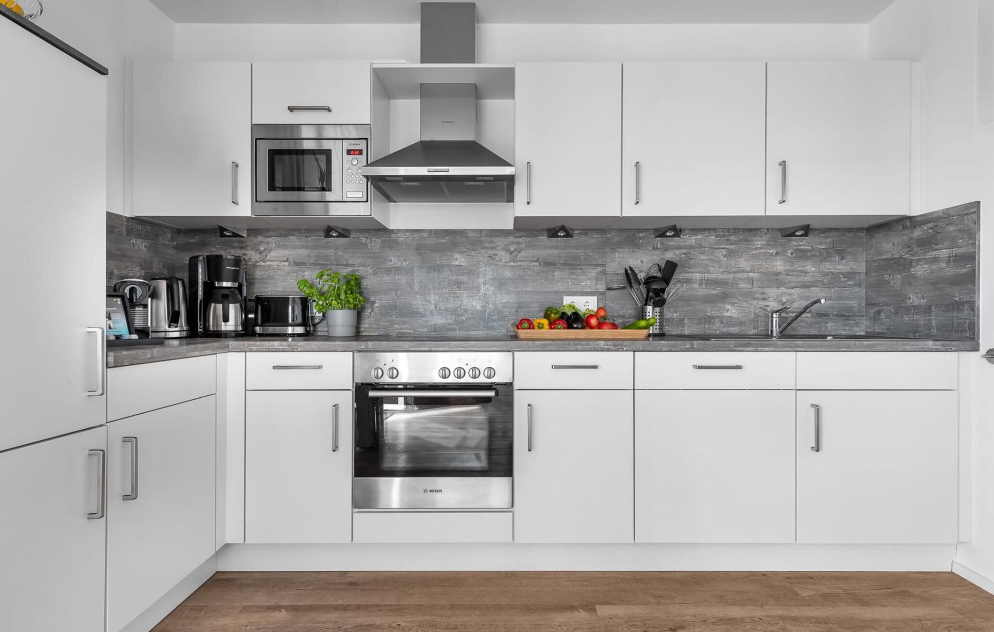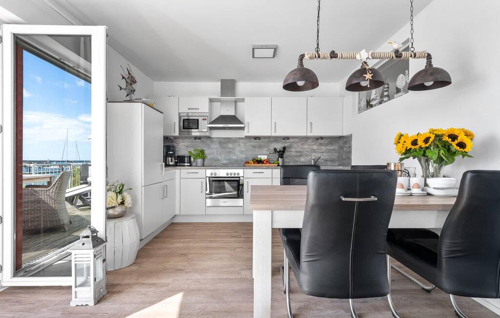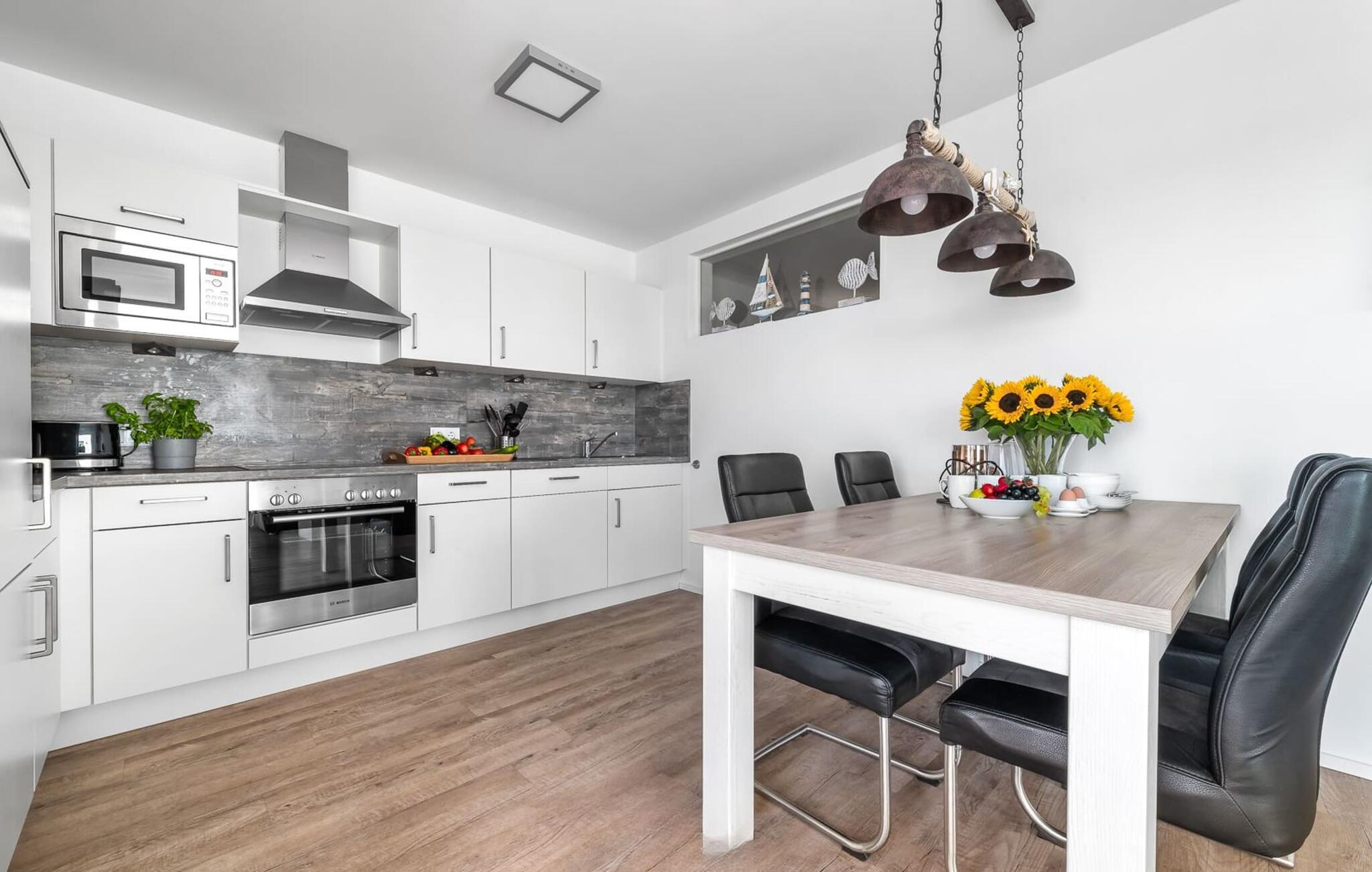 Im Urlaub ist Zeit für kreatives Kochen, die rundum ausgestattete Wohnküche lässt hierbei keine Wünsche offen. Frühstücken direkt am Wasser, Urlaubsfeeling pur.