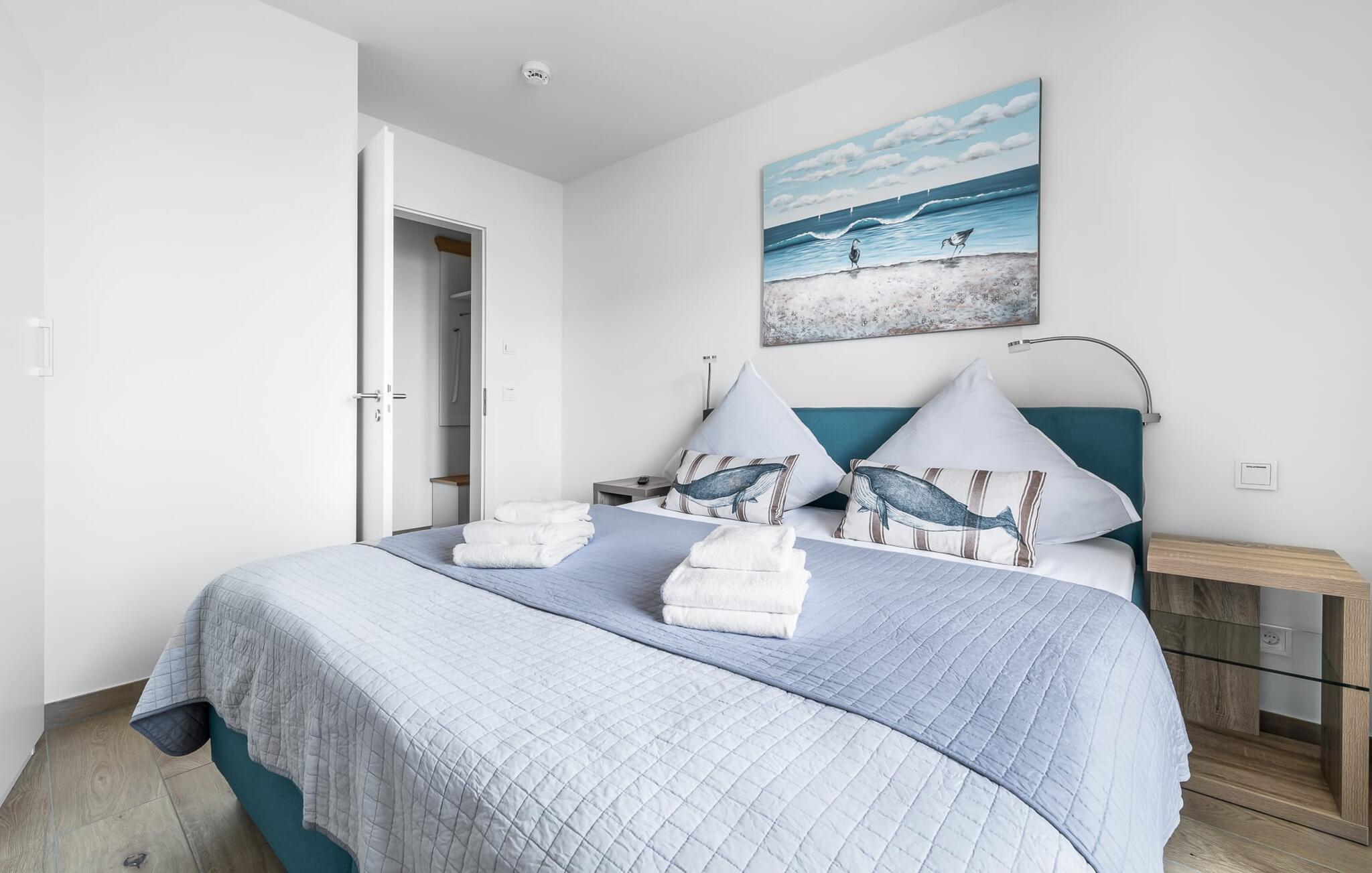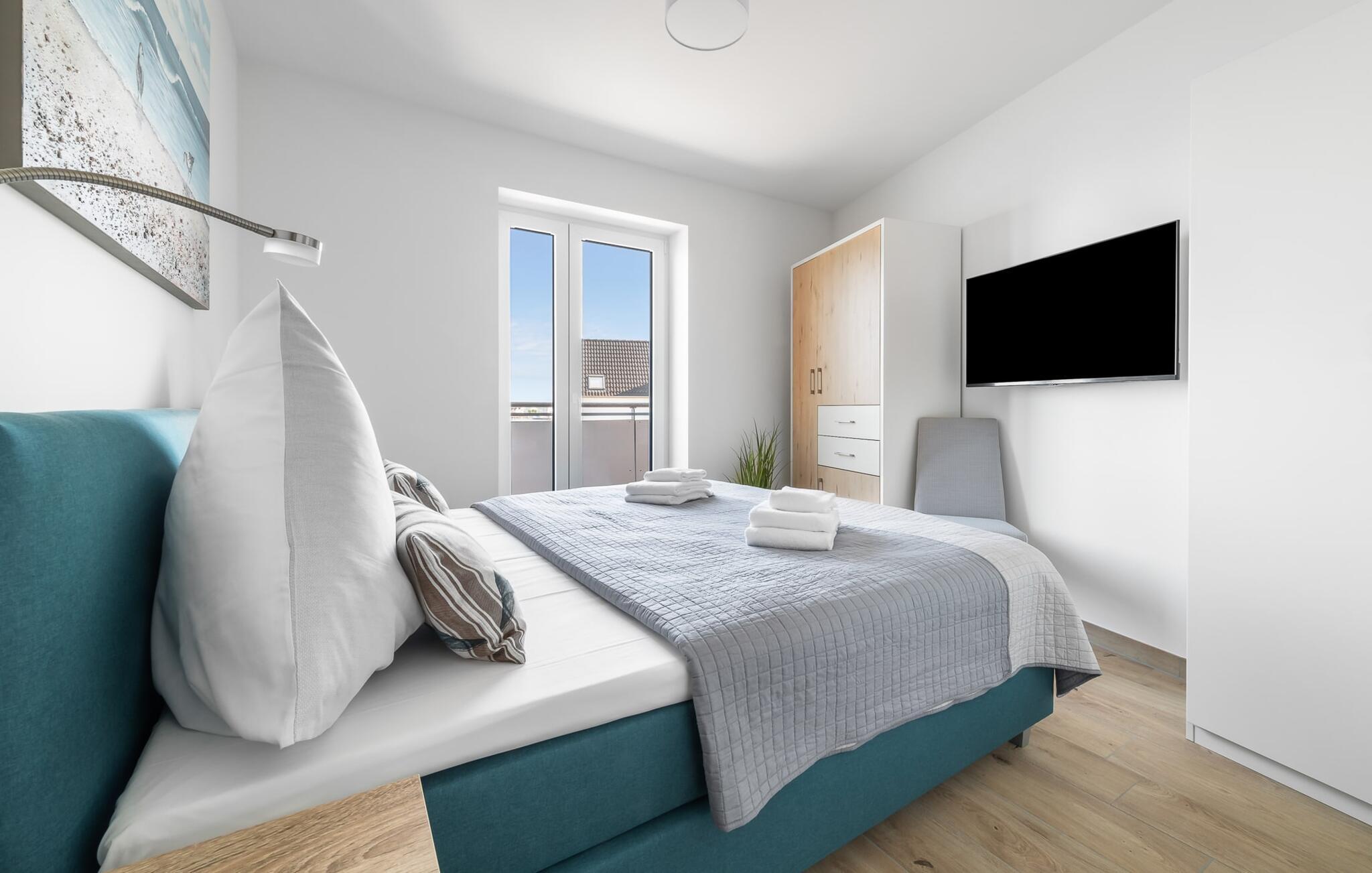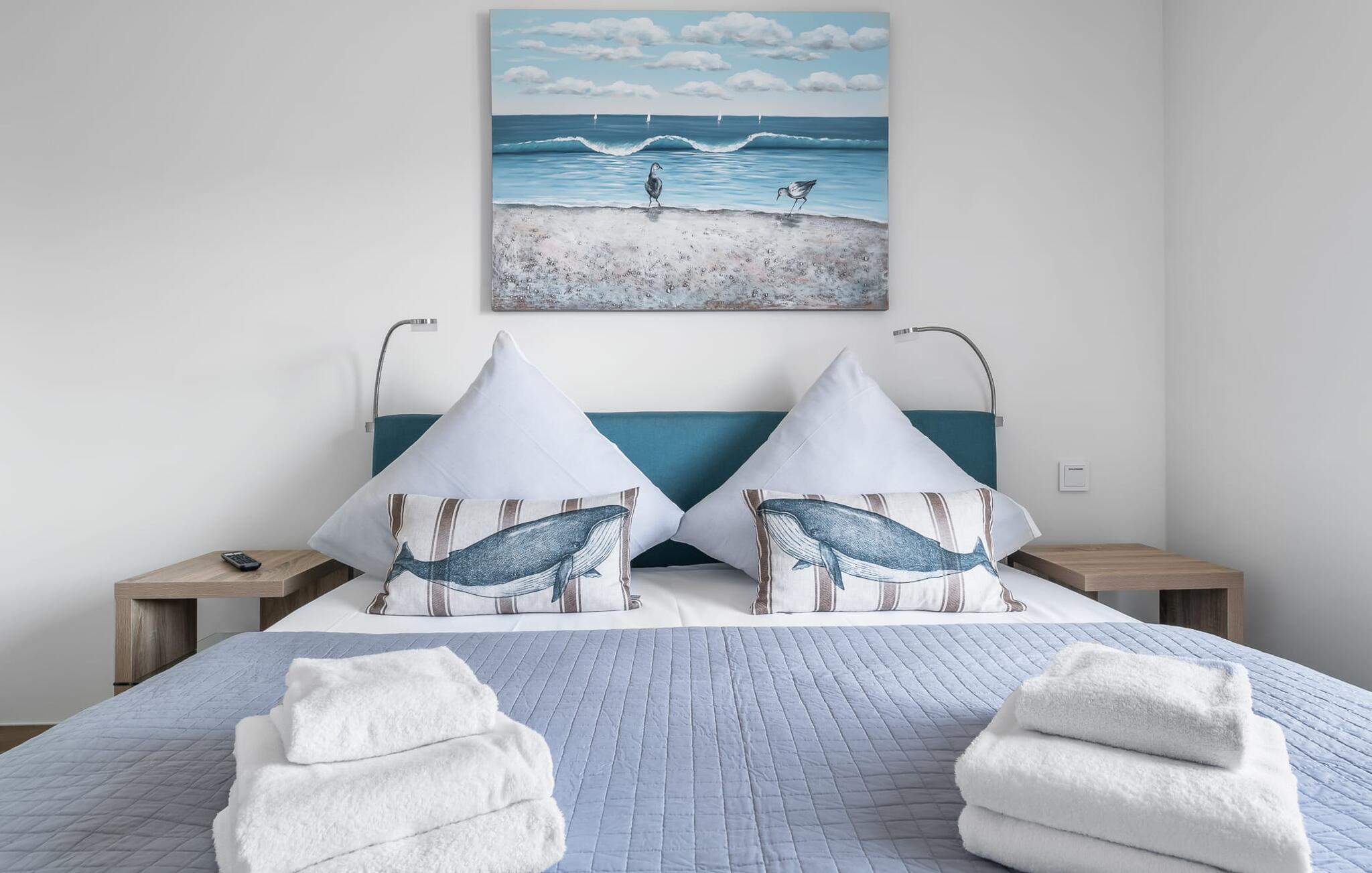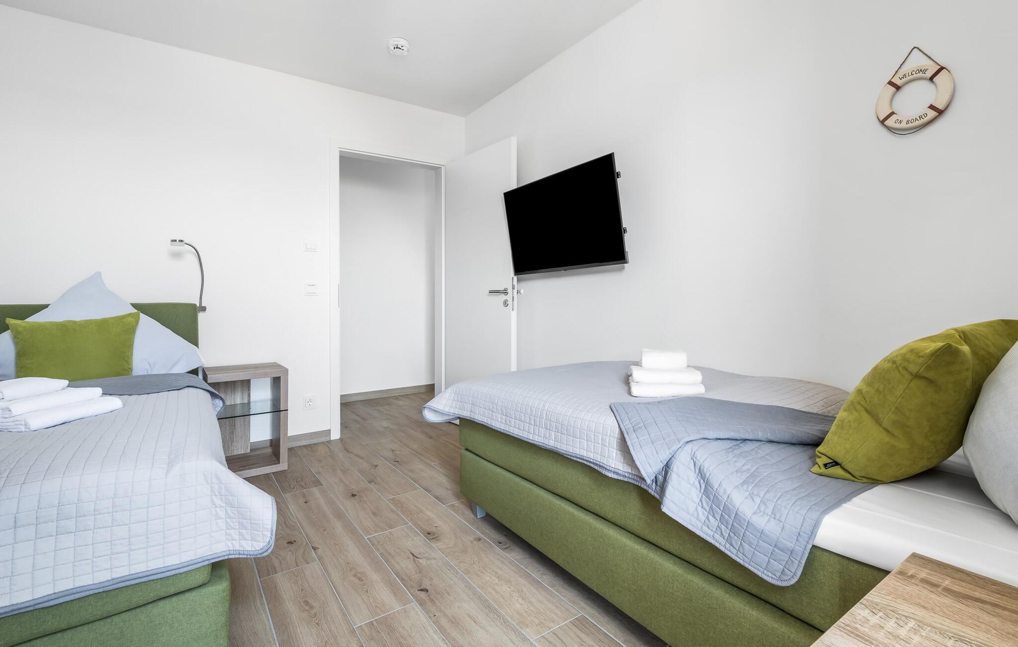 Ebenfalls hochwertig und geschmackvoll eingerichtet sind die beiden Schlafzimmer. Sollte das Wetter mal zu grau für den Blick nach draußen sein, steht euch in beiden Schlafzimmern ein Fernseher zur Unterhaltung zur Verfügung. Das Hauptschlafzimmer bietet ein Doppelbett, das zweite Schlafzimmer ist mit zwei Einzelbetten ausgestattet.