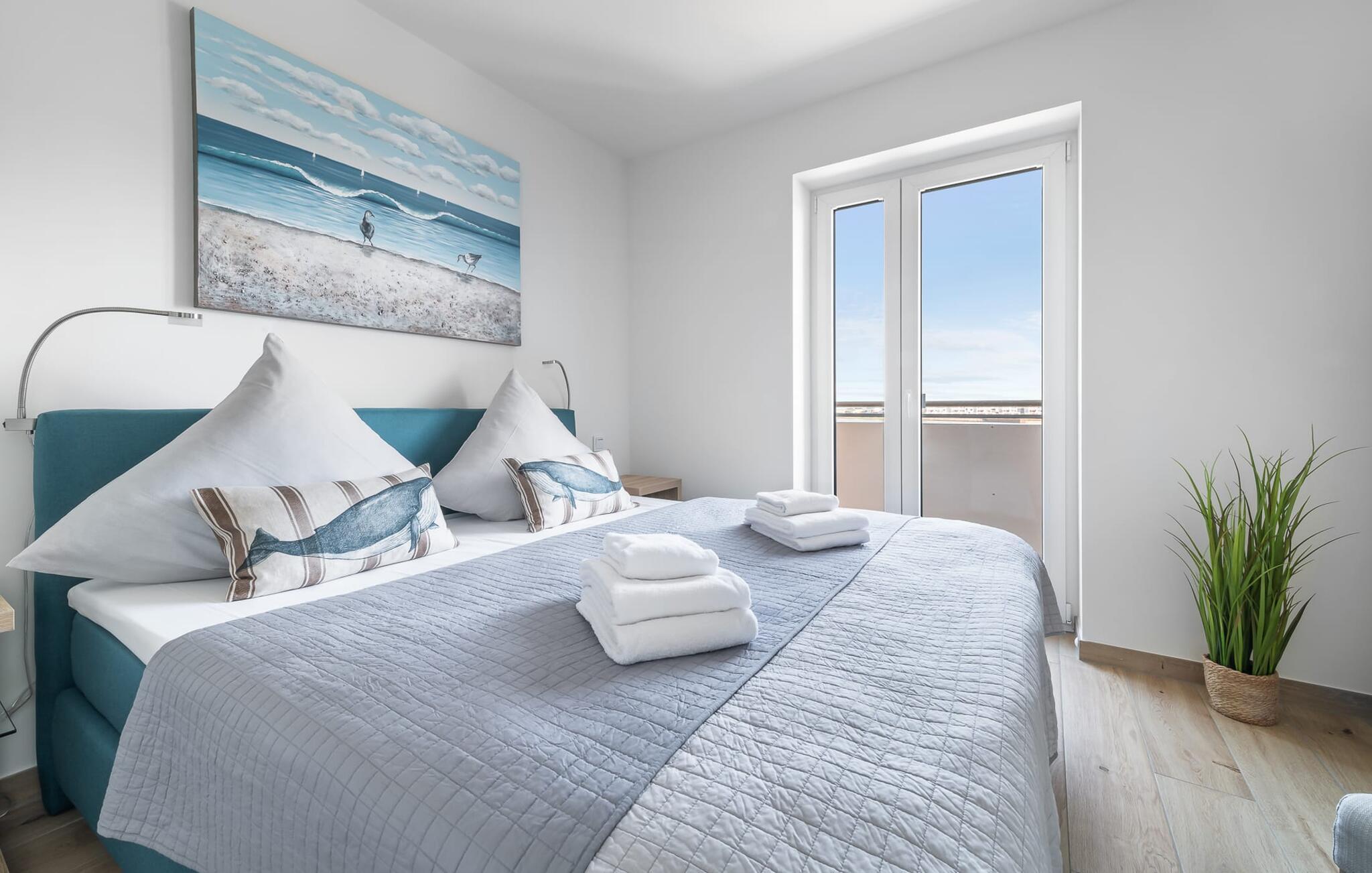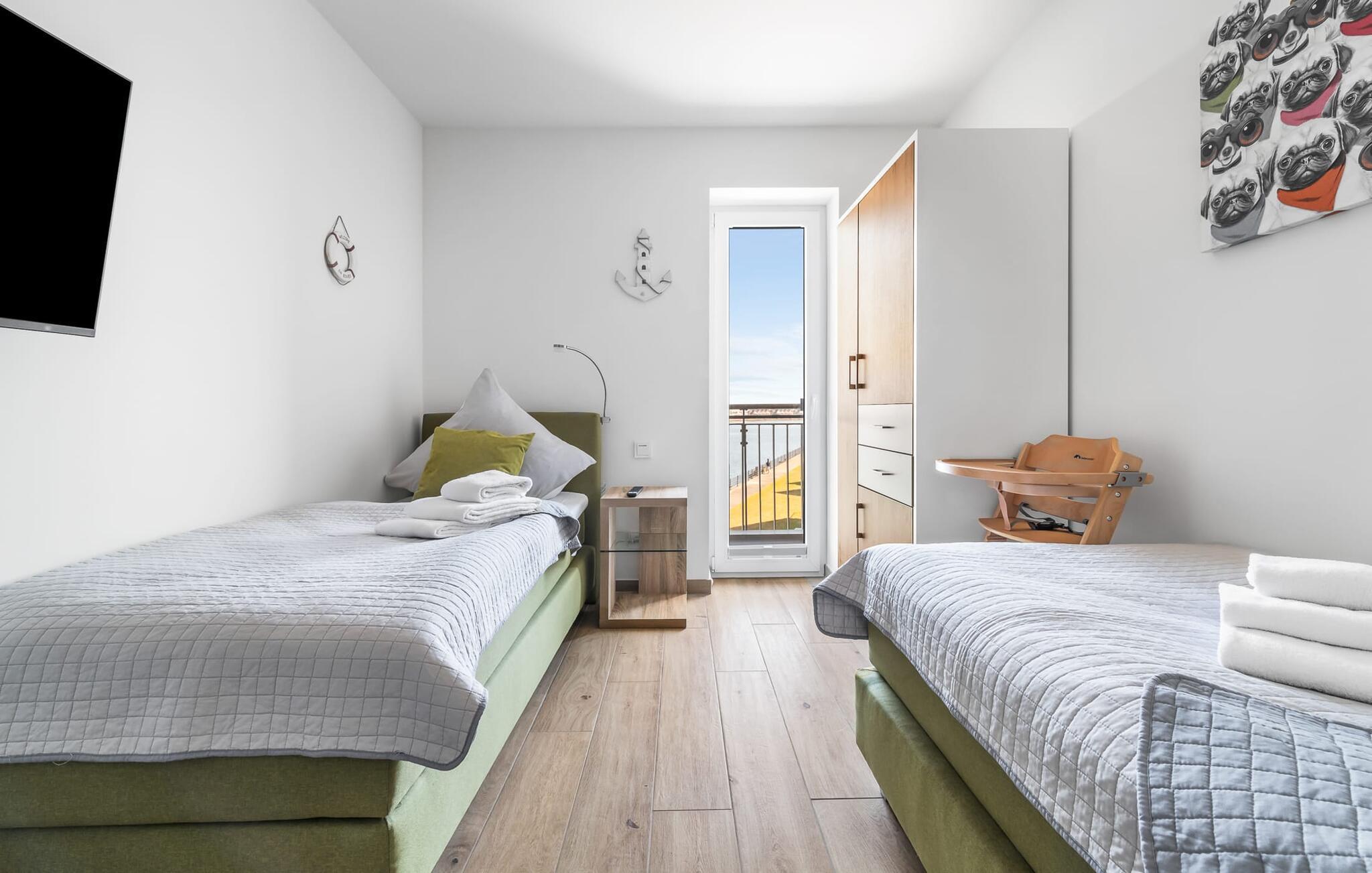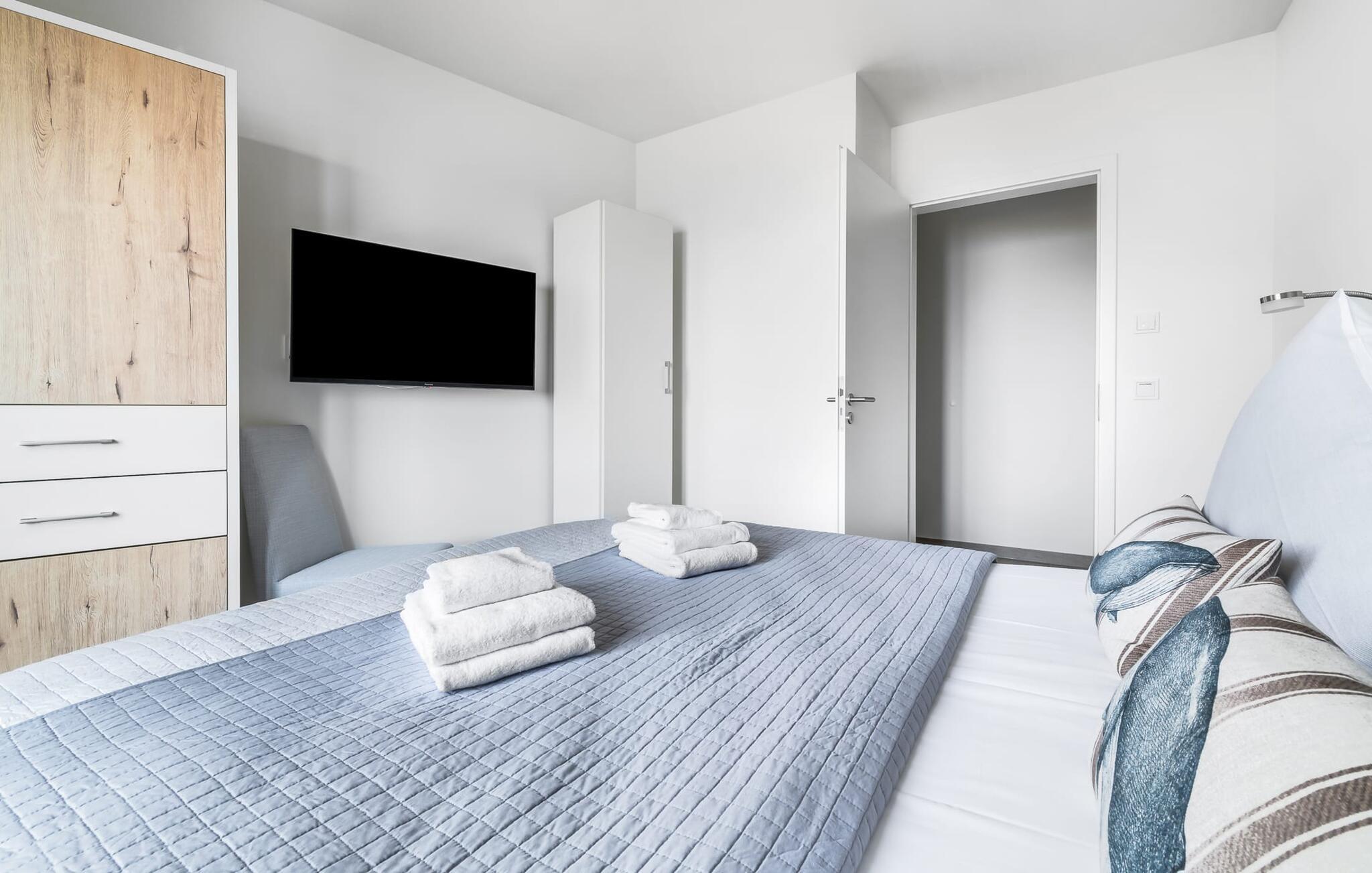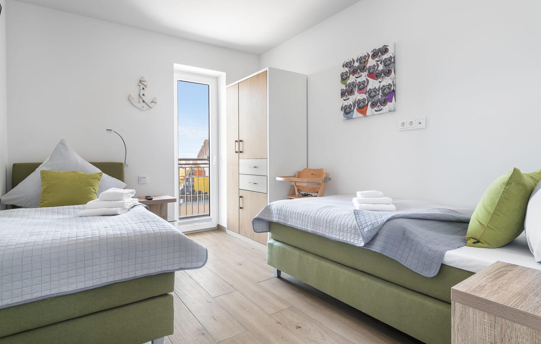 Ebenfalls hochwertig und geschmackvoll eingerichtet sind die beiden Schlafzimmer. Sollte das Wetter mal zu grau für den Blick nach draußen sein, steht euch in beiden Schlafzimmern ein Fernseher zur Unterhaltung zur Verfügung. Das Hauptschlafzimmer bietet ein Doppelbett, das zweite Schlafzimmer ist mit zwei Einzelbetten ausgestattet.