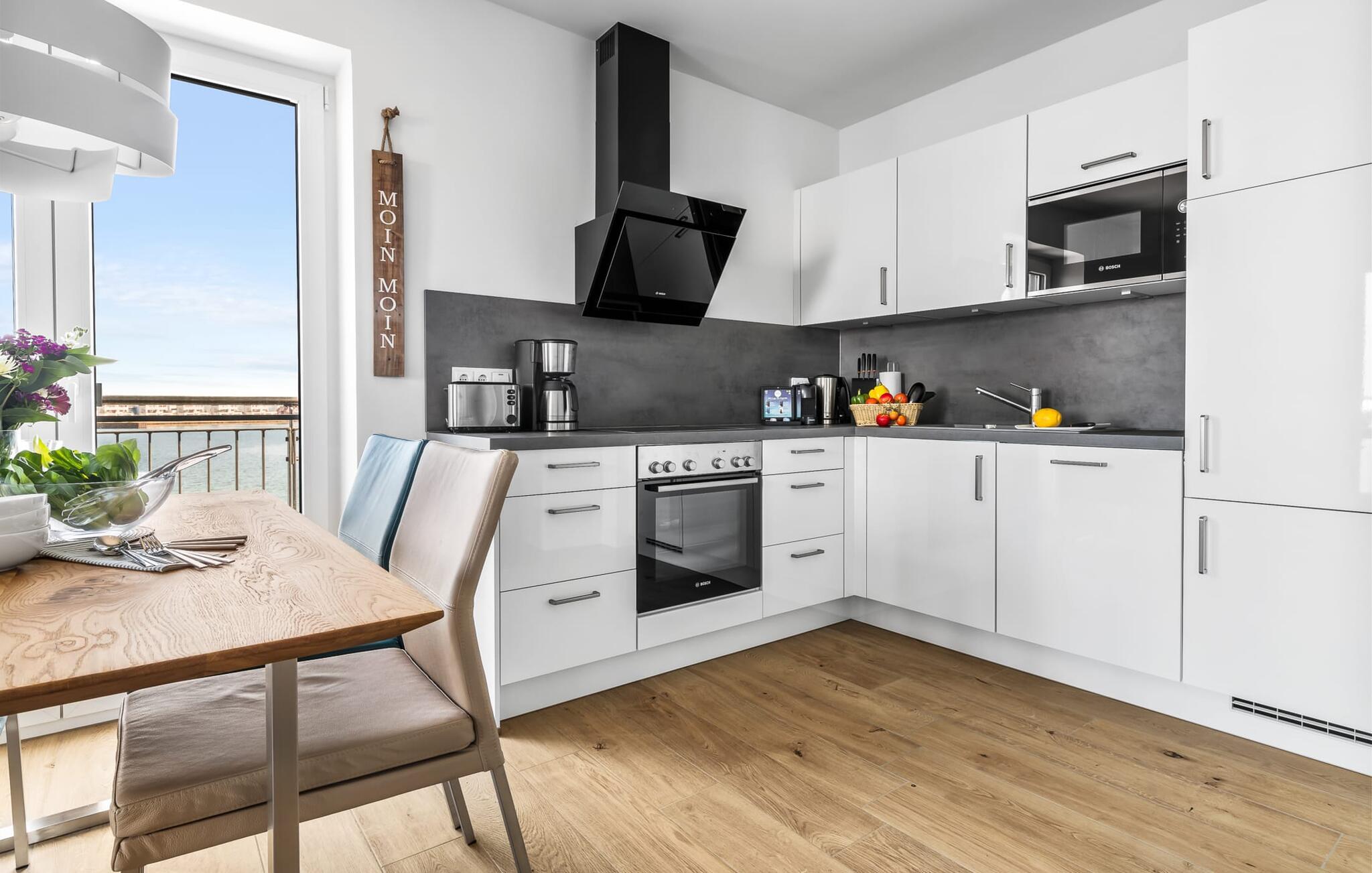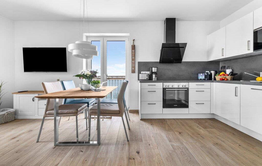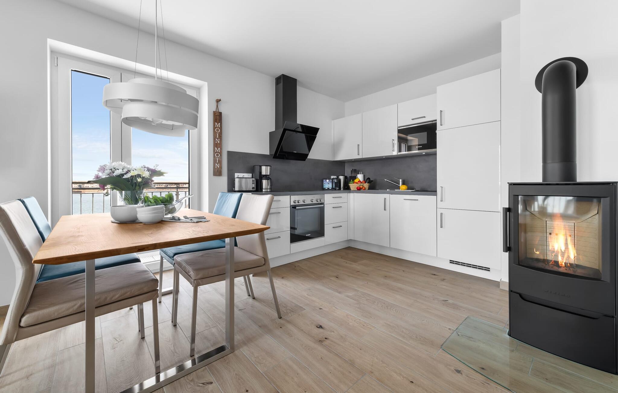 Der offene Wohn-/Essbereich mit integrierter, hochwertig ausgestatteter Küche gestaltet sich aufgrund der bodentiefen Fensterfront lichtdurchflutet und bietet einen einzigartigen Blick aufs Wasser. Egal ob bei Sonnenschein auf der Terrasse oder bei Schietwetter in der EsseckePlatz ist für die ganze Familie für gemeinsame Zeit vorhanden.