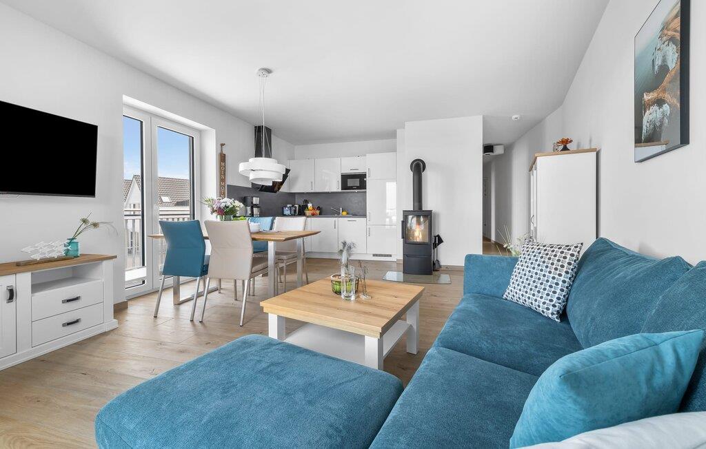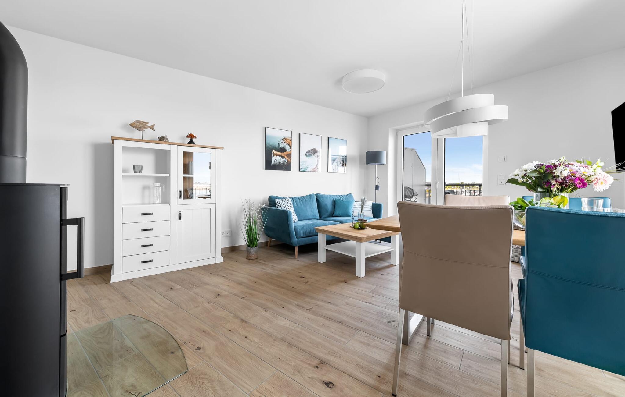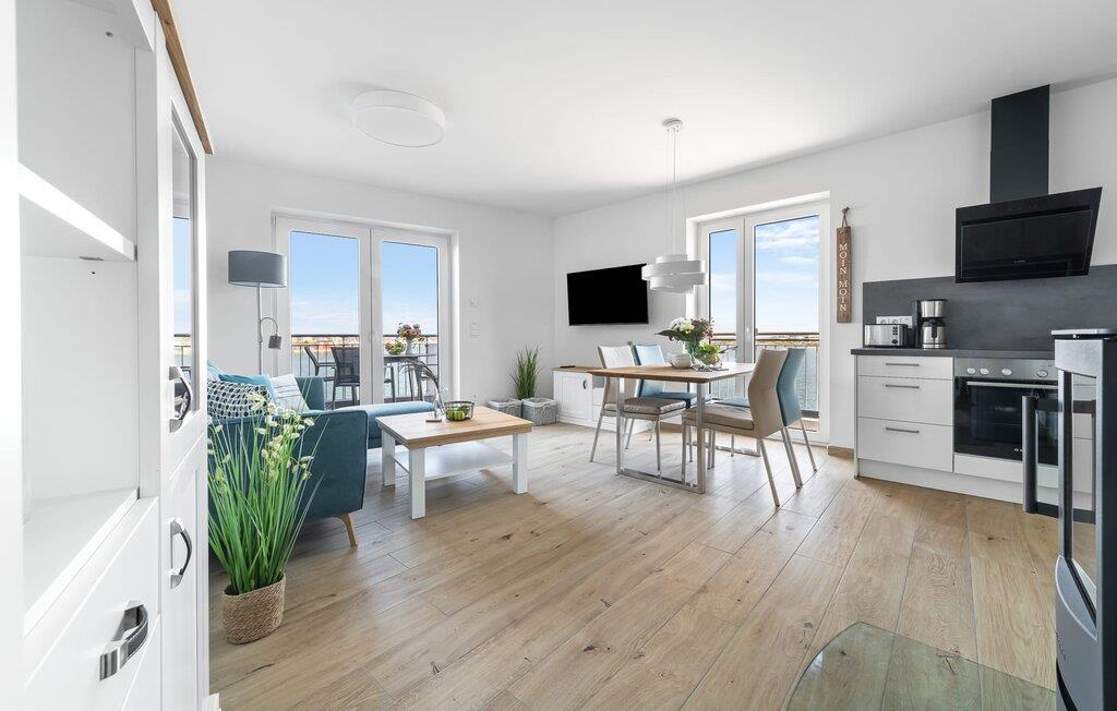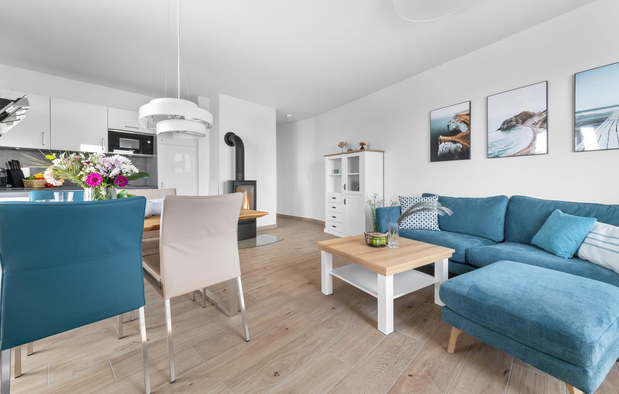 Der offene Wohn-/Essbereich mit integrierter, hochwertig ausgestatteter Küche gestaltet sich aufgrund der bodentiefen Fensterfront lichtdurchflutet und bietet einen einzigartigen Blick aufs Wasser. Egal ob bei Sonnenschein auf der Terrasse oder bei Schietwetter in der EsseckePlatz ist für die ganze Familie für gemeinsame Zeit vorhanden.