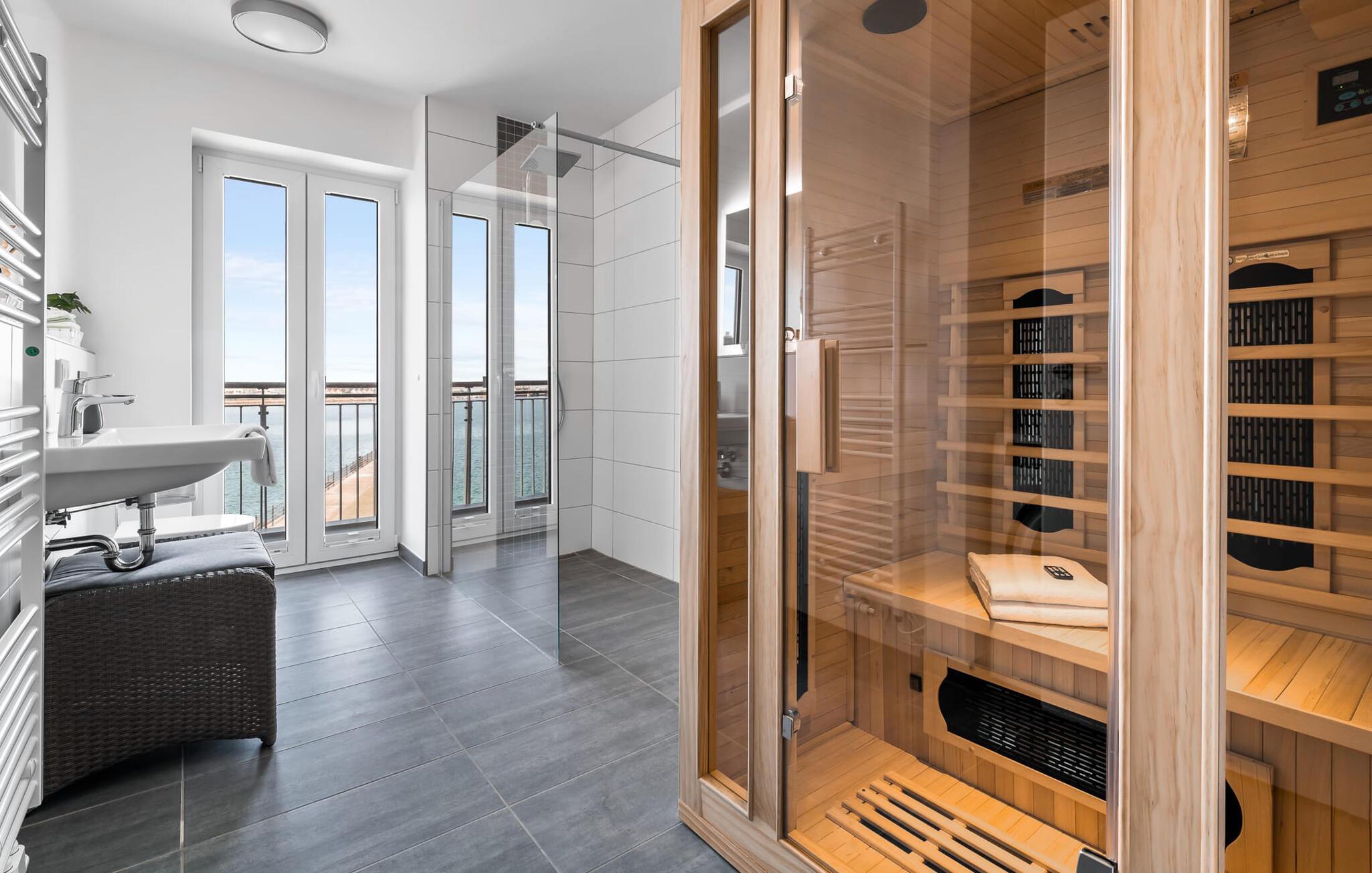 Ein ganz privates Wellnesserlebnis habt ihr im Badezimmerneben großzügiger Regendusche steht euch eine Infrarotsauna zur Verfügung, um die Entspannung nach einem anstrengenden Urlaubstag wieder zu euch zurückzuholen.