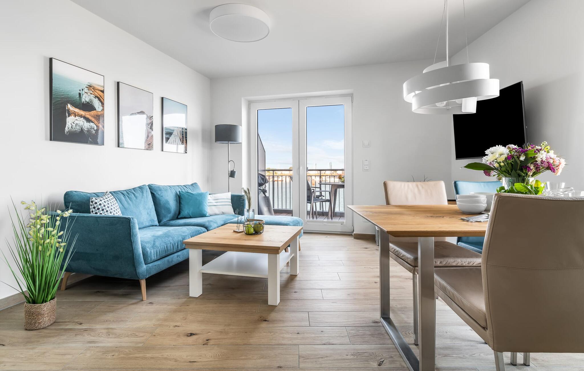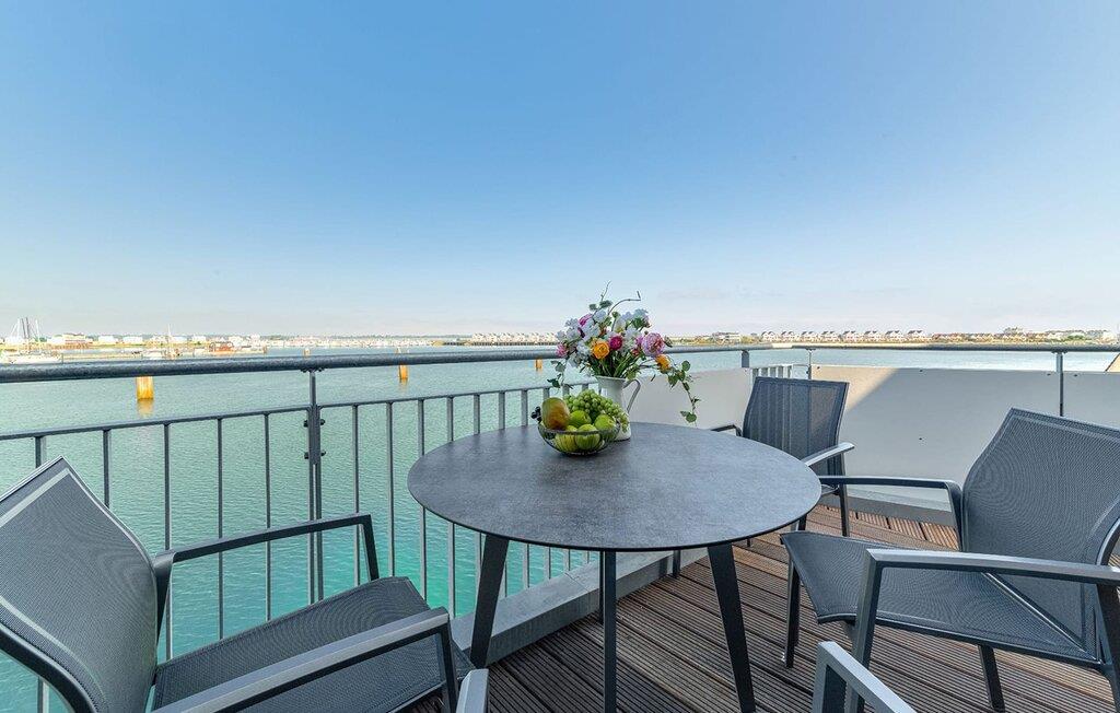 Die Ferienwohnung Ankerglück in Olpenitz bietet einen traumhaften Hafenblick und eine große Terrasse zum Entspannen.