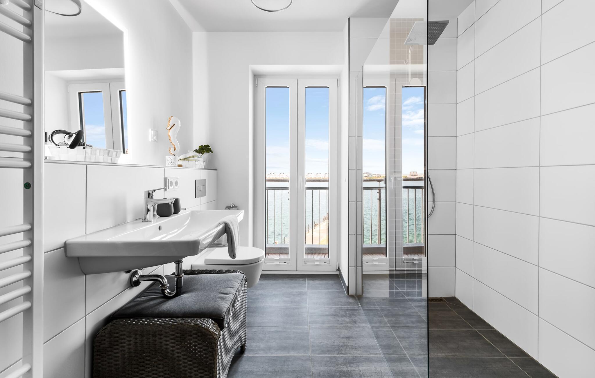 Fangen wir doch gleich mit dem Highlight der Wohnung an, die Rundumterasse, die von jedem Raum zugänglich ist. Dank der nord-west-Ausrichtung lässt sich hier rund um die Uhr die Seele baumeln lassen. Ob morgens mit der ersten Tasse Kaffee oder abends mit letztem Cocktail vor dem Zubettgehenman startet definitiv erholt in den (nächsten) Tag.