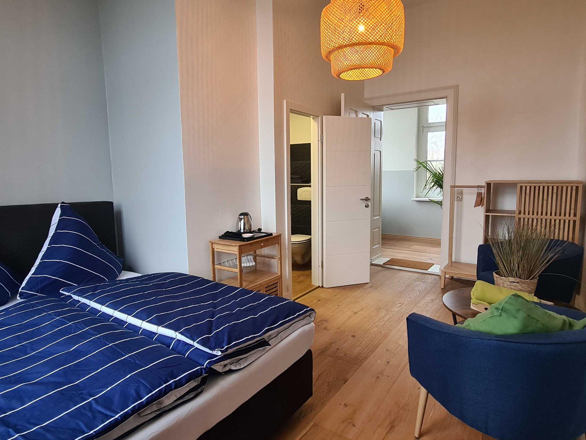 Modernes Doppelzimmer im denkmalgeschützten Alten Lazarett in Anklam, ideal für Radfahrer und Geschäftsreisende.