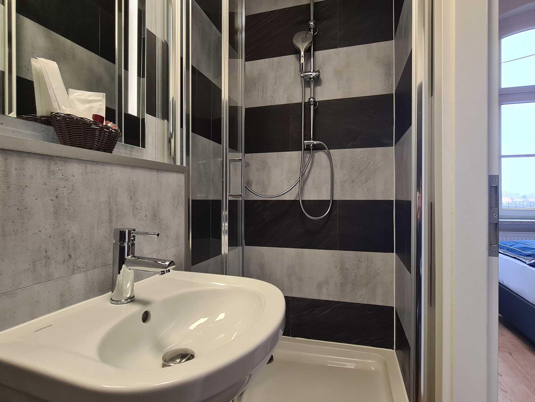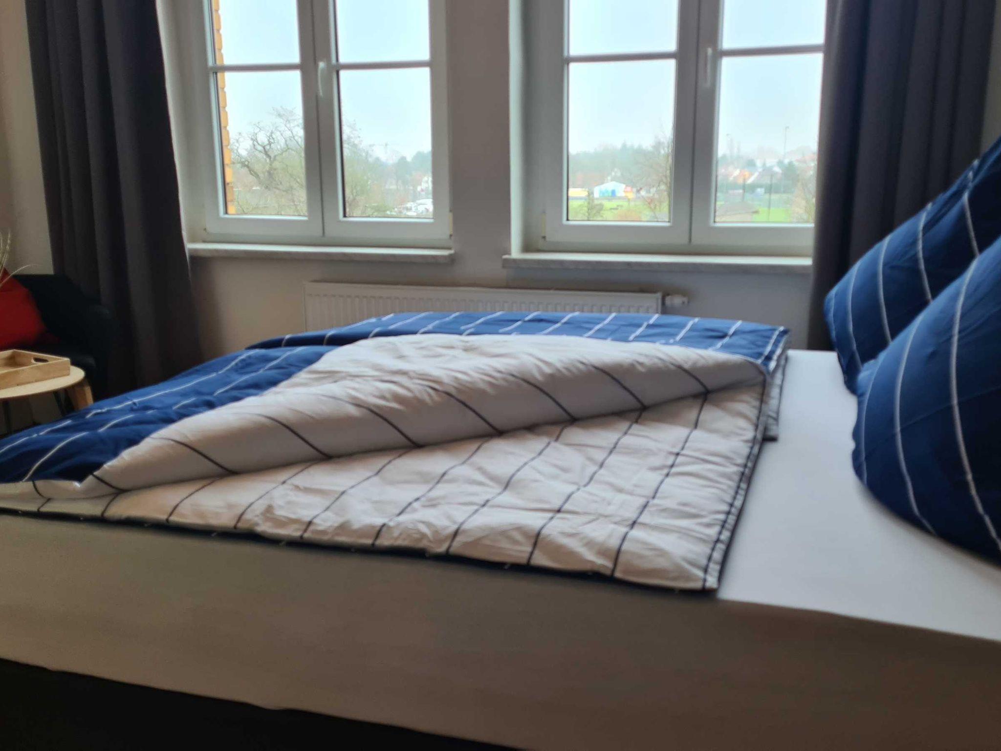 Modernes Doppelzimmer im historischen Alten Lazarett Gästehaus in Anklam, ideal für Geschäftsreisende und Radfahrer.