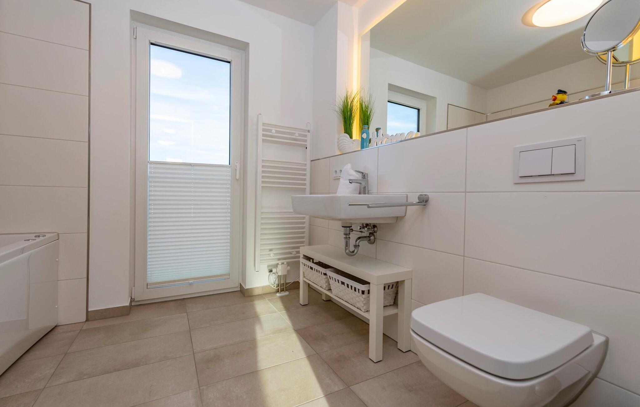 Im ersten Obergeschoss befindet sich das große Badezimmer mit Hafenblick und Relax-Whirlwanne.