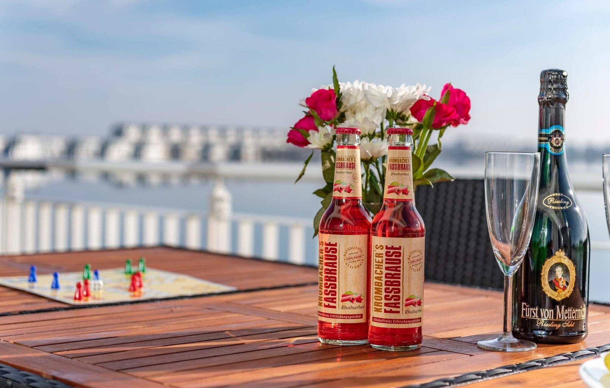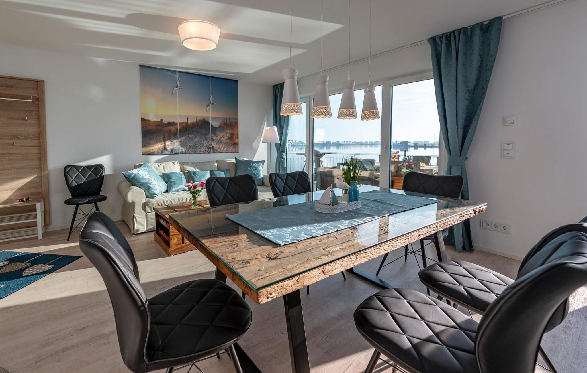 Auf drei Wohnebenen lässt es sich in diesem Ferienhaus entspannen. Lichtdurchflutet gestaltet sich der Wohn- und Essbereich des Ferienhauses. Durch die bodentiefe Fensterfront fällt der Blick auf den Segel- und Sportboothafen des OstseeResorts mit spannendem Hafenkino, wenn Segeljachten und Motorboote in die Hafeneinfahrt steuern. Zum Verweilen lädt die direkt angrenzende große und windgeschützte Terrasse ein, die das Gefühl vermittelt, man würde auf dem Wasser schweben. Bei romantischen Urlaubsmahlzeiten oder einem geselligen Grillabend lässt sich hier die Idylle der Ostsee genießen.