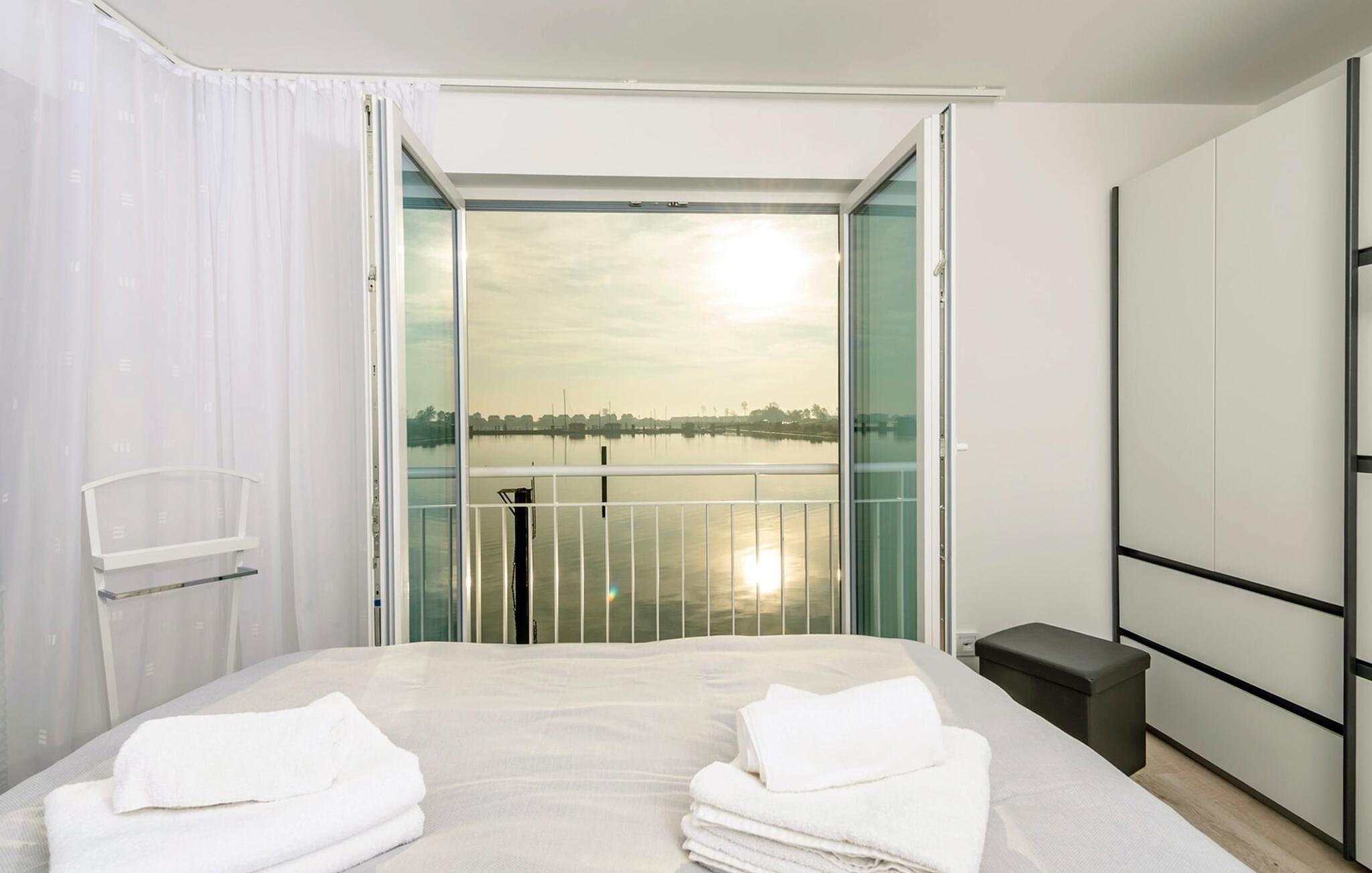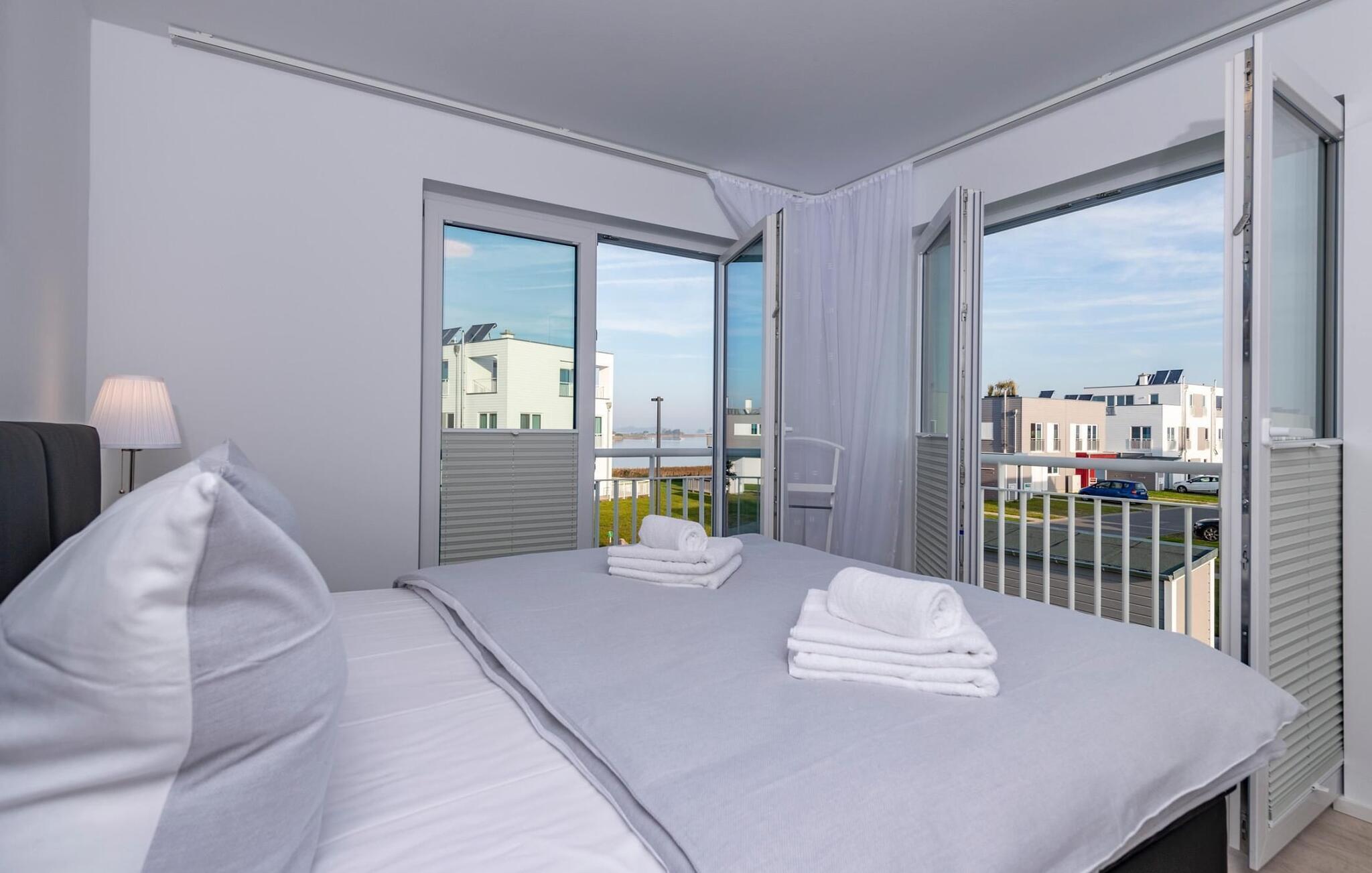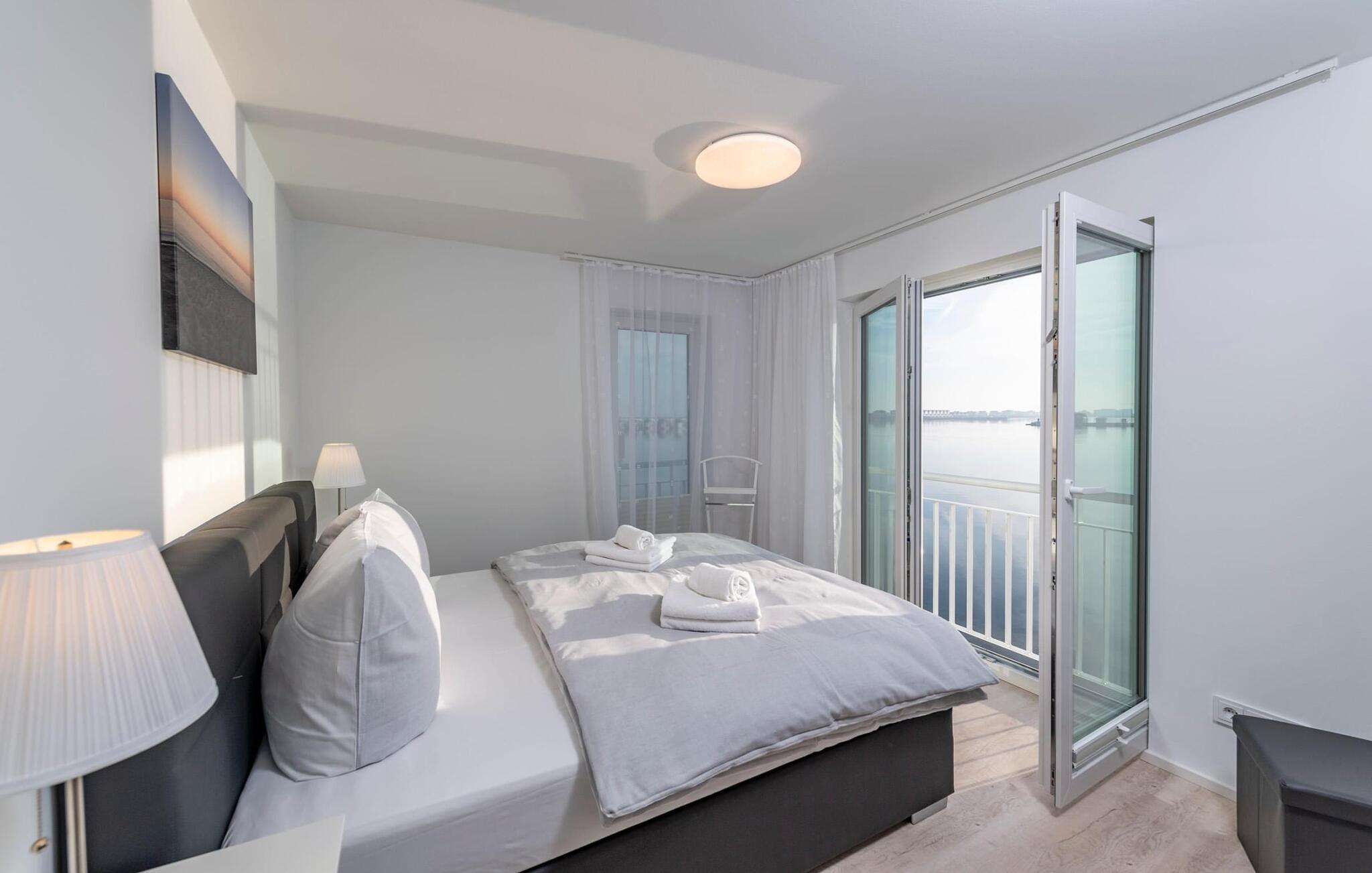 Das Ferienhaus bietet Platz für 7 Erwachsene und nach Bedarf auch für 6 Erwachsene mit 2 Kindern. Beide Schlafzimmer befinden sich im ersten Obergeschoss und verfügen über Doppelbetten (160 x 200 cm). Das Hauptschlafzimmer ist zum Hafen hin ausgerichtet und punktet mit einem phänomenalen Wasserblick. Beide Schlafzimmer sind verdunkelbar. Eine Schlafcouch im Studio (120 x 200 cm) bietet zwei Kindern oder einem Erwachsenen einen komfortablen Schlafplatz bei traumhaften Aussichten. Zwei weitere Schlafplätze befinden sich im Wohnbereich auf einer gemütlichen Schlafcouch (140 x 200 cm), ebenfalls mit direktem Ostseeblick. Natürlich stehen auch Babybett und Hochstuhl für einen weiteren Baby-Passagier bereit.