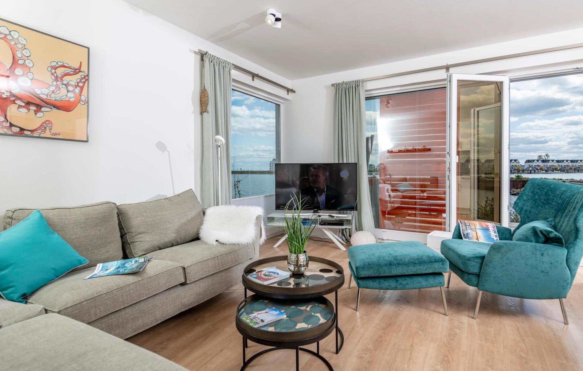 Die moderne Einrichtung hat Meerescharme. Stilvoll eingerichtet und hochwertig ausgestattet ist in diesem Ferienobjekt voller Urlaubskomfort garantiert. Traumhafte Aussichten eröffnen sich aus dem Wohnbereich und auf der angrenzenden Terrasse mit Blick über die Marina. Hafenkino sorgt hier für Unterhaltung während eines geselligen Grillabends oder romantischen Candle-Light-Dinners. Windgeschützt und gemütlich wird es im Strandkorb mit Blick aufs Meer.