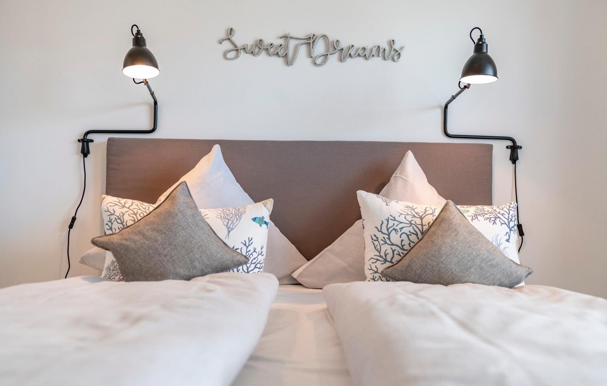 Die beiden Schlafzimmer sind mit hochwertigen Boxspringbetten ausgestattet. Der Tiefschlaf ist hier garantiert, denn hochwertige Verdunklungsvorhänge sorgen für Nachtgefühl. Beide Schlafzimmer bieten Zugang zur zweiten Terrasse und verfügen jeweils über einen zusätzlichen TV.