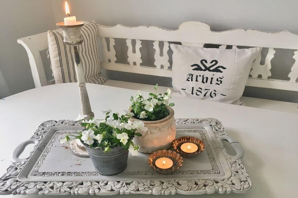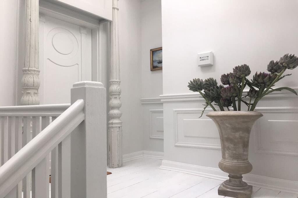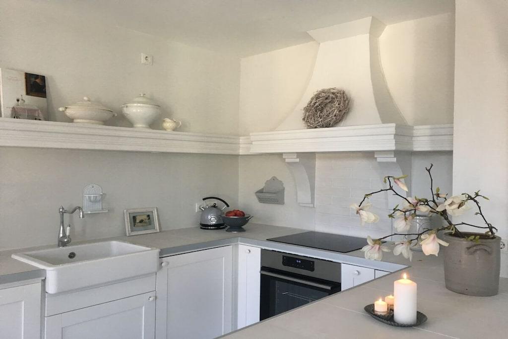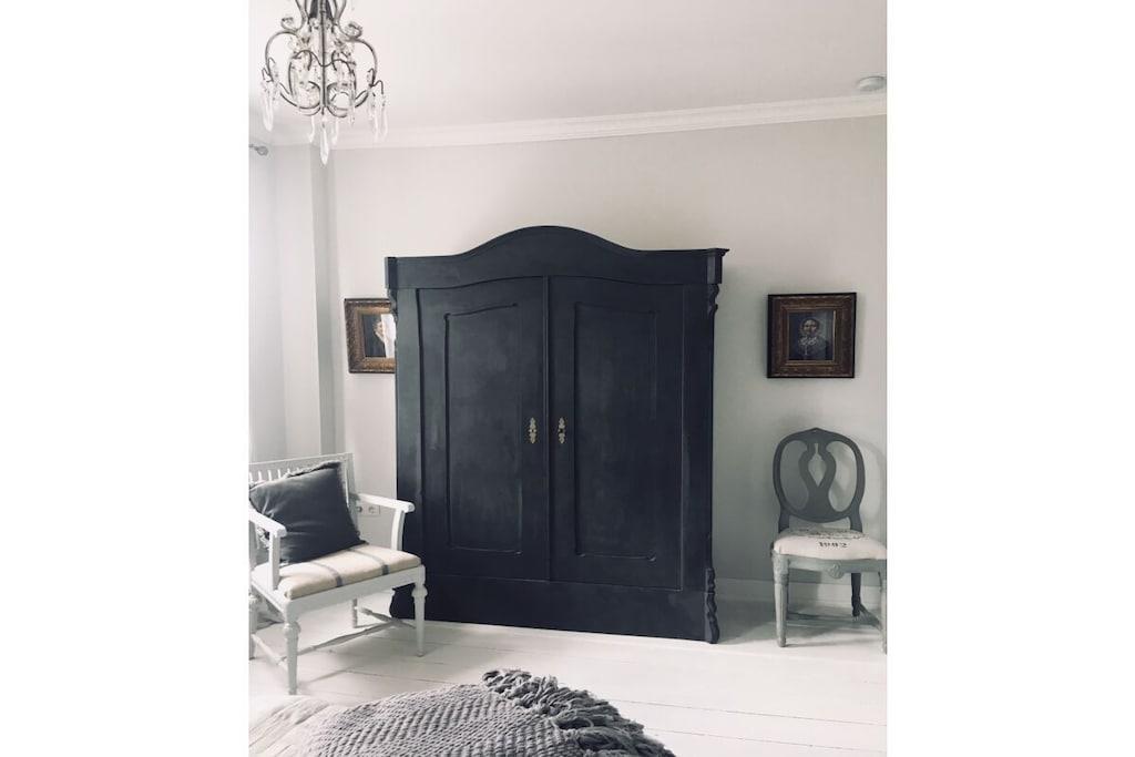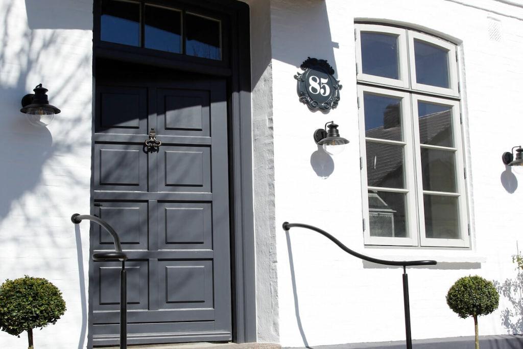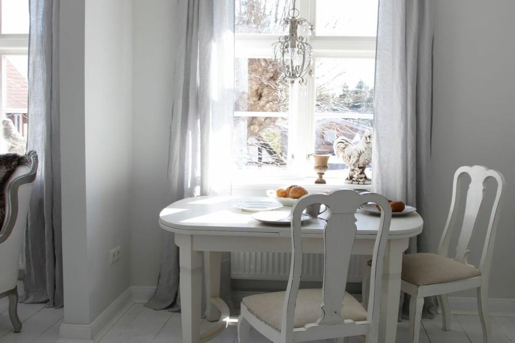 Romantisch wohnen auf besondere Art. Helle & lichtdurchflutete Ferienwohnung im 1. OG im Stil des Shabby Chic. Nordische Antiquitäten in hellen Tönen, wunderschöne Stoffe und gemütliche Sitzmöglichkeiten machen diese Ferienwohnung zu etwas ganz besonderem. 2019/20 wurde das denkmalgeschützte Stadthaus " Der Arnisser", in dem sich die Wohnung befindet, aufwändig saniert, ohne seinen historischen Charme eingebüßt zu haben. Vom Flur der Wohnung gelangen Sie in das großzügige und helle Wohn-Esszimmer mit offener, komfortabler Küche. Die Wohnung verfügt über einen kleinen Abstellraum der als Garderobe fungiert. Im Wohnzimmer befindet sich ein Schlafsofa mit den Maßen 140cmx200cm. Vom Schlafzimmer aus haben Sie einen Blick auf die Schlei und Marina bis nach Kappeln. Das traumhafte Doppelbett mit den extra hohen & sehr bequemen Matratzen sorgt für einen erholsamen Schlaf. Das helle Duschbad im nostalgischen Stil verfügt über eine Regendusche, Föhn & Handtücher.