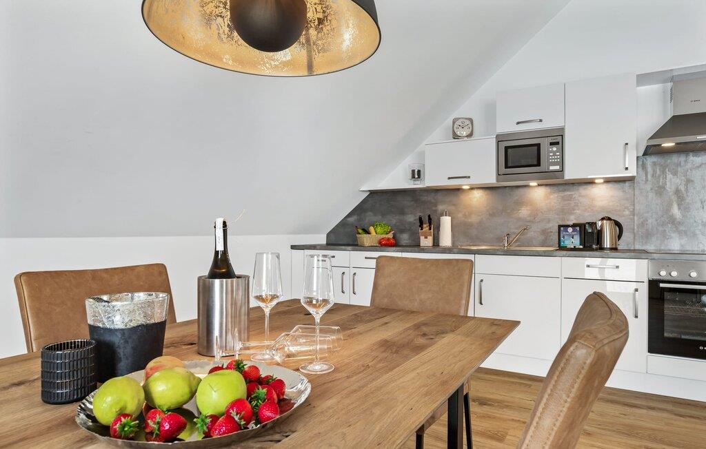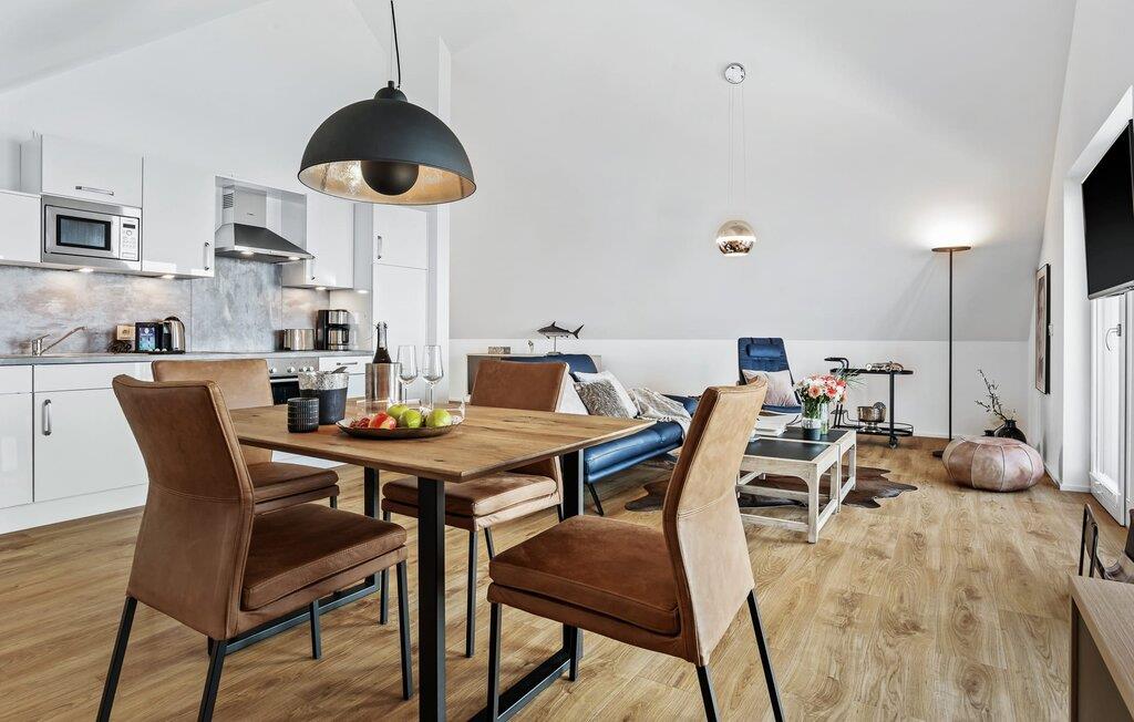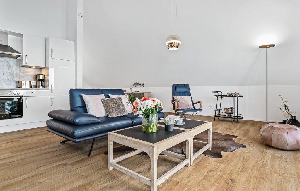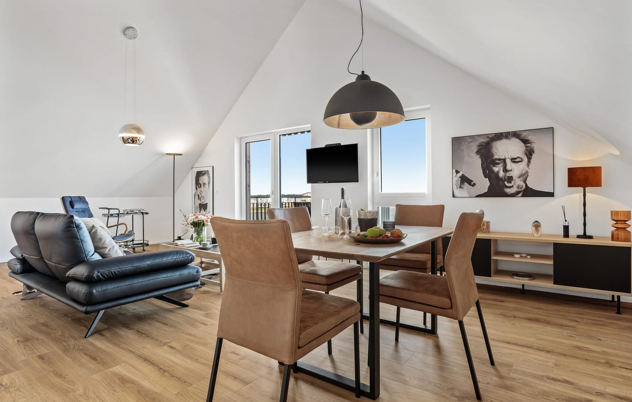Die im Loftstyle gehaltene Ferienwohnung ist hell und freundlich und strahlt Gemütlichkeit aus. Wohlfühlen fällt hier nicht schwer! Die integrierte Küchenzeile im Wohn-/Essbereich ist vielseitig ausgestattet und lädt zum gemeinsamen Kochen ein. Im Wohnbereich lädt das bequeme Sofa zum Verweilen ein und ein Fernseher sorgt für Abwechslung zum Hafenkino.