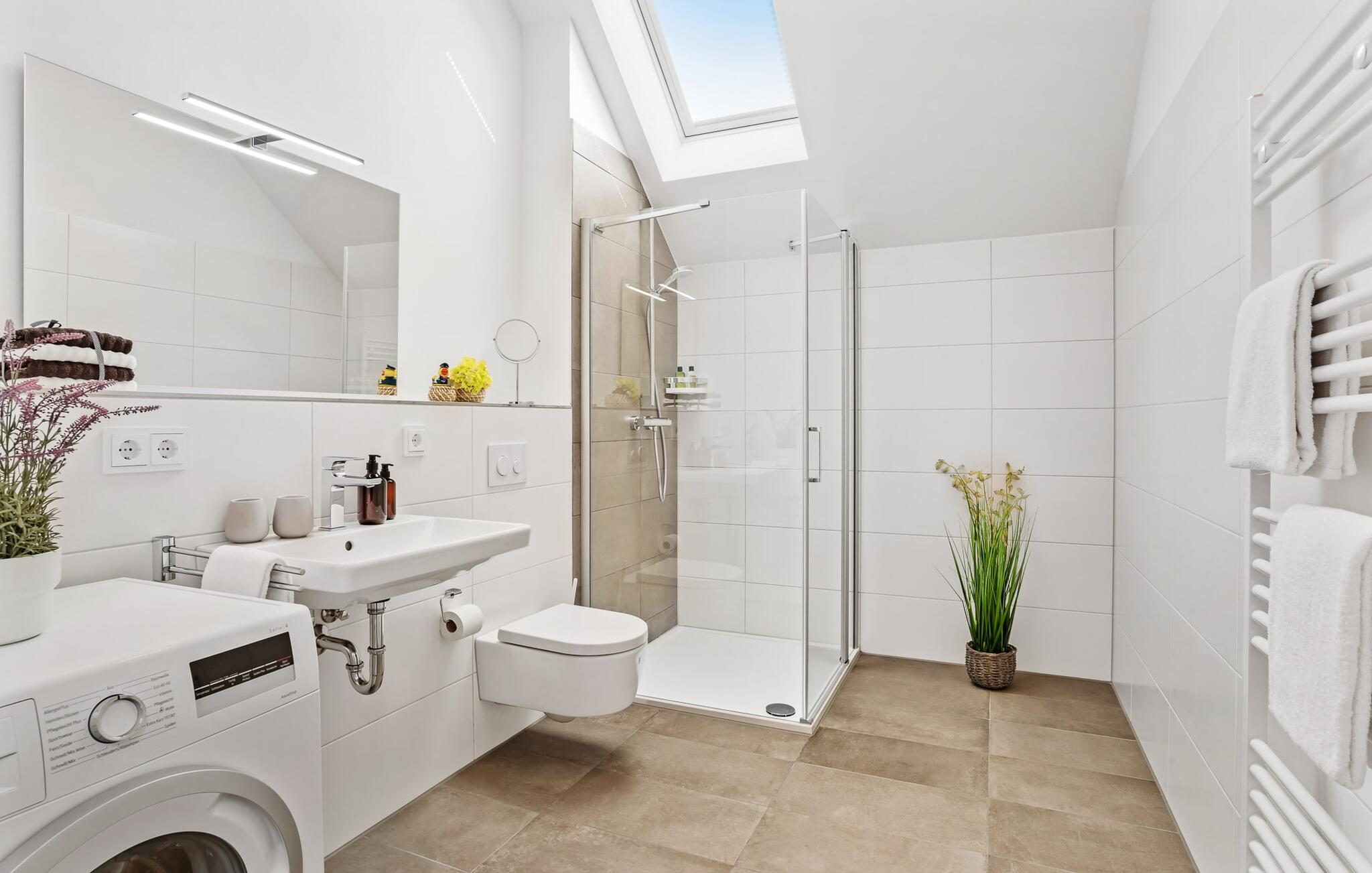 Im Bad befindet sich neben allem Nützlichen eine bodengleiche Dusche für den gelungenen Start in einen neuen Urlaubstag.