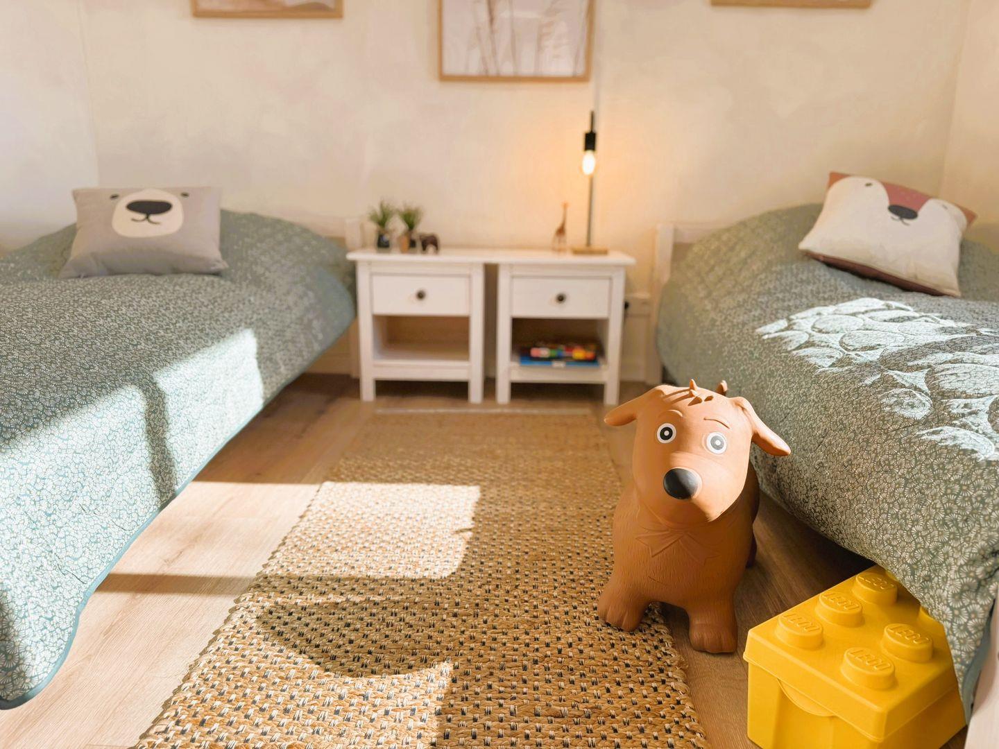 Ein Zimmer mit Doppelbett (180 x 200 cm) und TV sowie ein weiteres Zimmer mit zwei Einzelbetten (jeweils 90 x 200 cm).