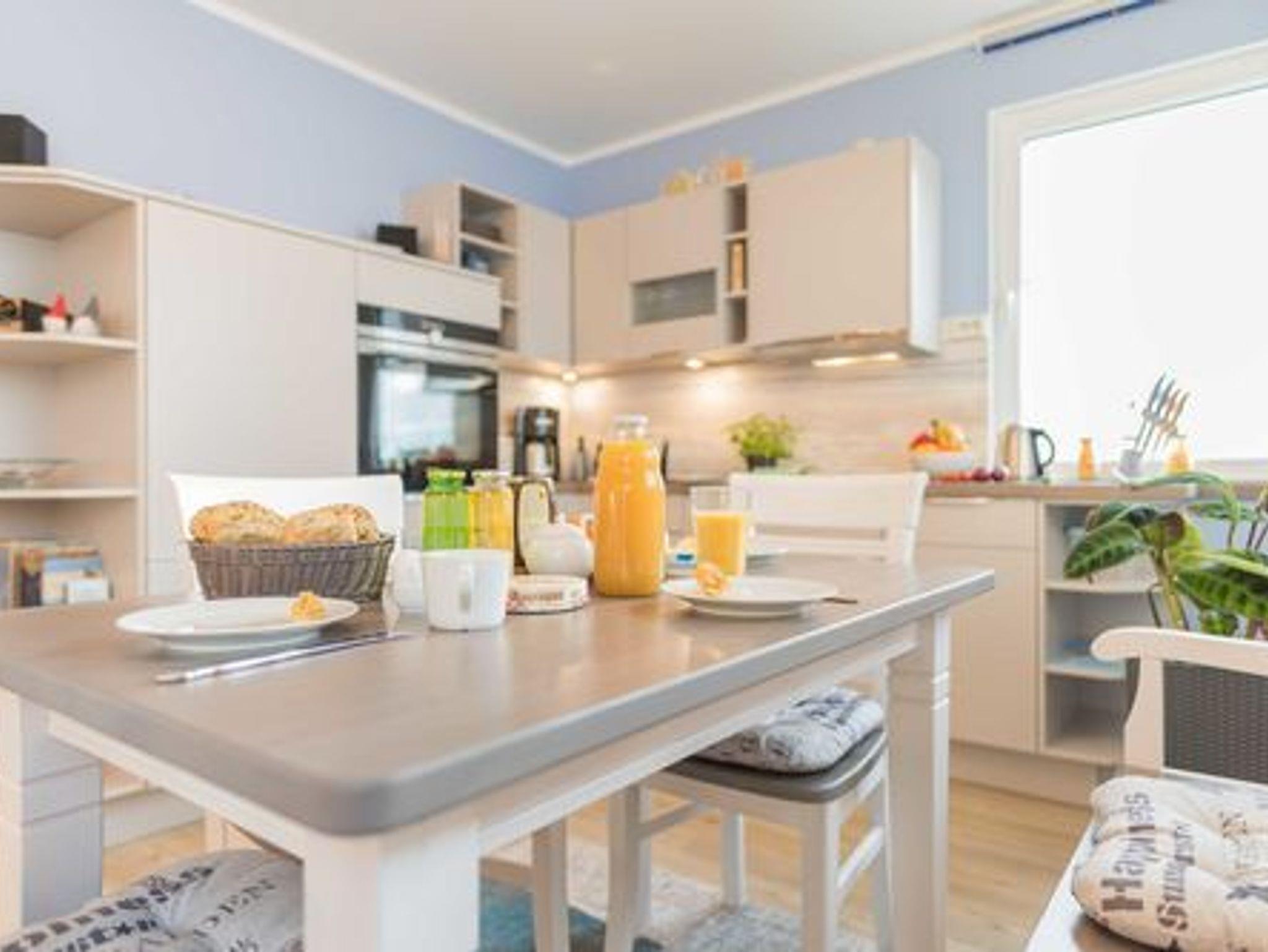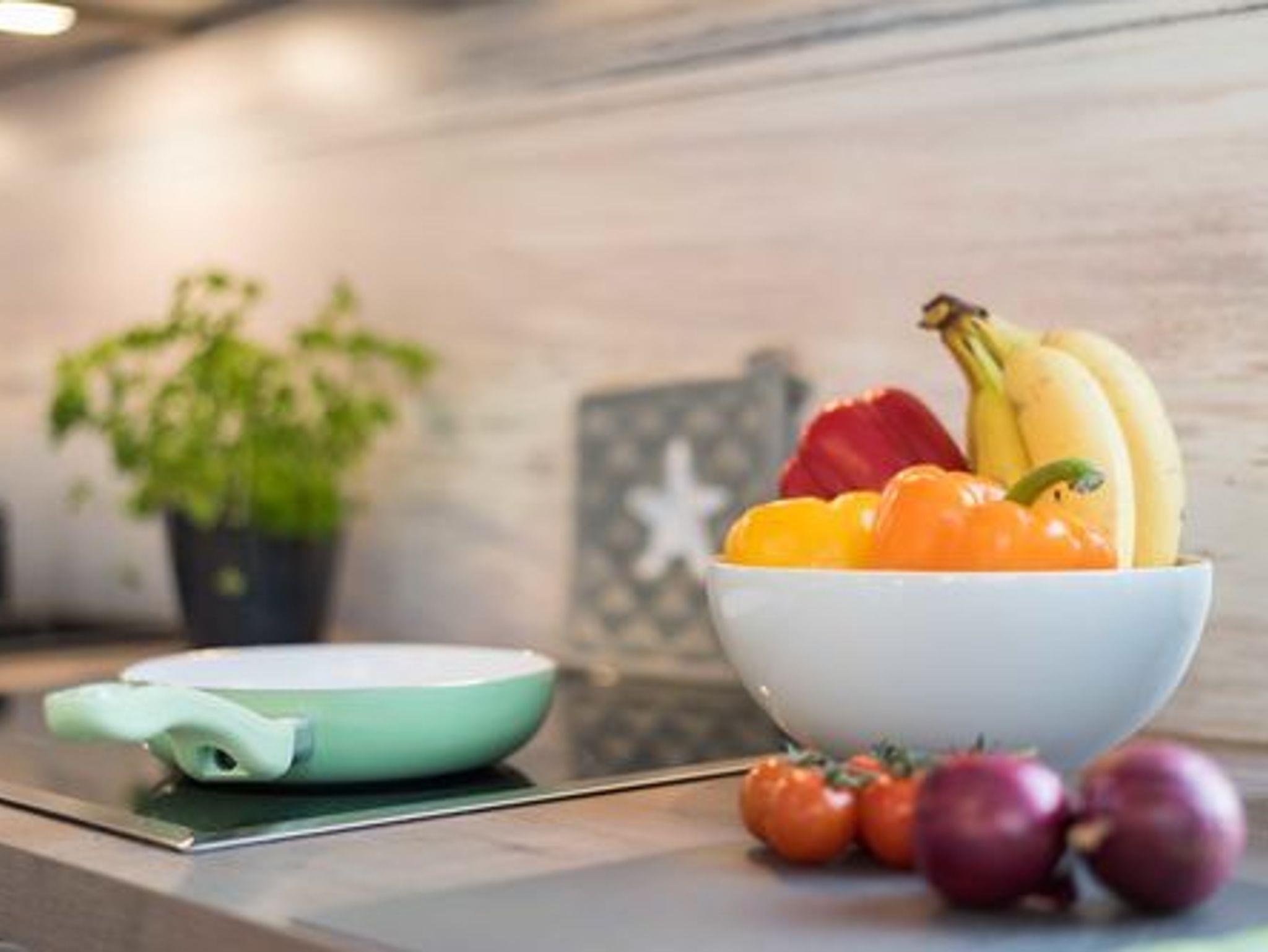 Der offene Wohn- und Essbereich mit integrierter Einbauküche bietet alles für eine entspannte Selbstversorgung: Kühlschrank mit Tiefkühlfach, Cerankochfeld, Backofen-Mikrowellen-Kombination, Kaffeemaschine, Wasserkocher, Toaster, Eierkocher sowie ausreichend Geschirr und Gläser. Eine gemütliche Essecke, eine komfortable Sitzgruppe, TV, Musikanlage, Bücher und Spiele sorgen für angenehme Urlaubstage.