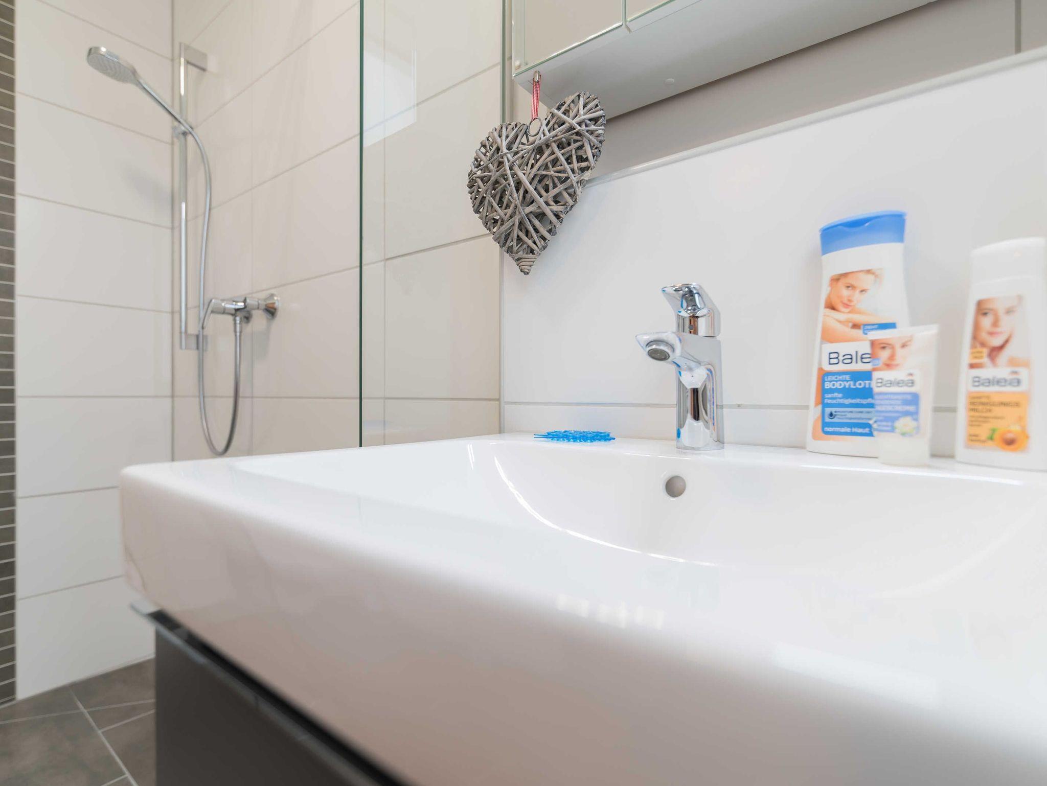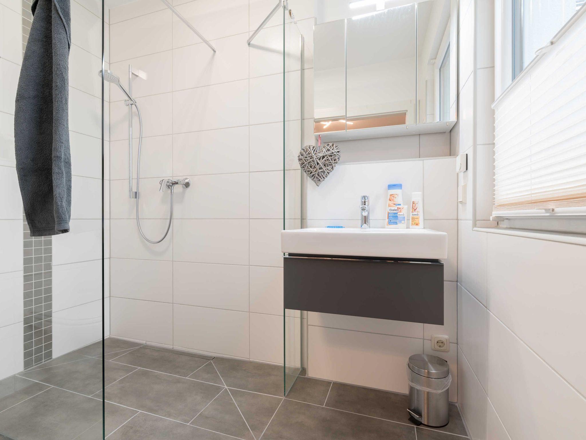 Das moderne Bad ist mit einer ebenerdigen, offenen Dusche, Handtuchheizkörper und Föhn ausgestattet. Alle Türen sind 1 m breit, sämtliche Räume sind schwellenfrei.