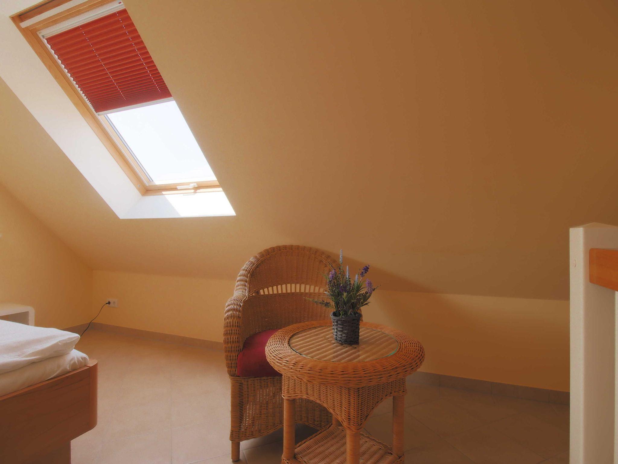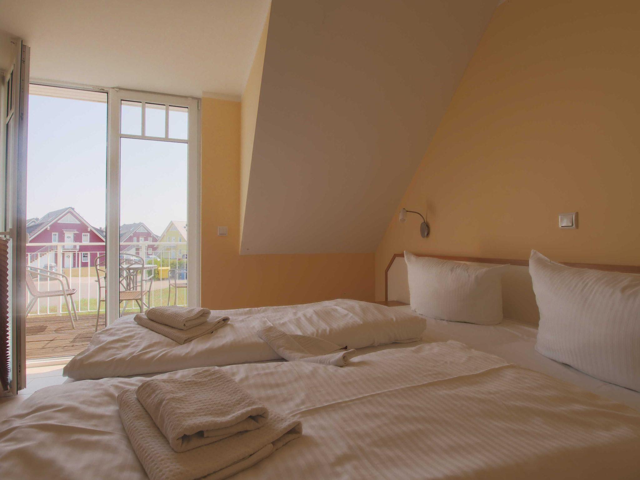 Die Ferienwohnung befindet sich im linken Obergeschoss und hat eine Größe von 65 Quadratmetern. Sie verfügt über zwei separate Schlafzimmer, jedes mit einem großen Doppelbett und einem Kleiderschrank ausgestattet. Das zweite Schlafzimmer befindet sich auf der oberen Ebene und ist über eine innenliegende Treppe erreichbar. Es verfügt außerdem über einen Schlafsessel. Die Küche ist mit einem Geschirrspüler, Backofen und Kaffeemaschine ausgestattet. Im Badezimmer gibt es eine Dusche und eine Waschmaschine. Zwei Balkone gehören zur Wohnung, einer ist vom Wohnbereich aus zugänglich, der andere vom Schlafzimmer auf der Wohnebene. Handtücher und Bettwäsche werden in der Erstausstattung gestellt. Für eine gemütliche Atmosphäre sorgt ein schöner Kaminofen, besonders in der kalten Jahreszeit oder bei entspannten Abenden. Haustiere sind gegen Aufpreis erlaubt. Ein PKW-Stellplatz steht während des Aufenthaltes zur Verfügung.