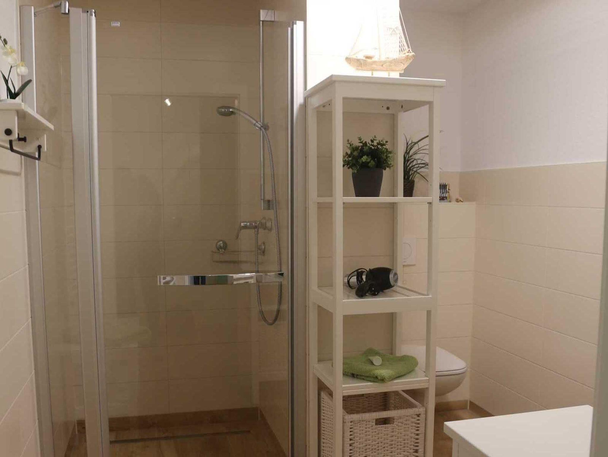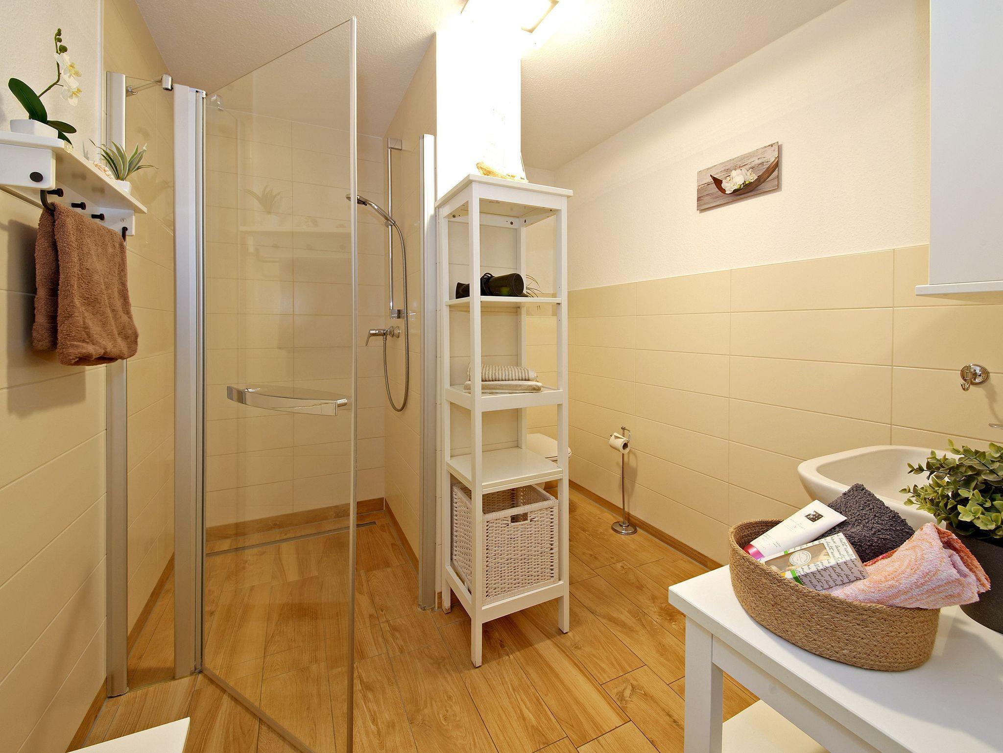 Das moderne Badezimmer verfügt über eine bodengleiche Dusche, Handtuchwärmer und Föhn. Im Schlafzimmer befindet sich ein komfortables Doppelbett (1,80 m x 2,00 m). Bodentiefe Fenster sorgen für viel Tageslicht, die Fußbodenheizung im Wohnbereich für zusätzlichen Komfort.