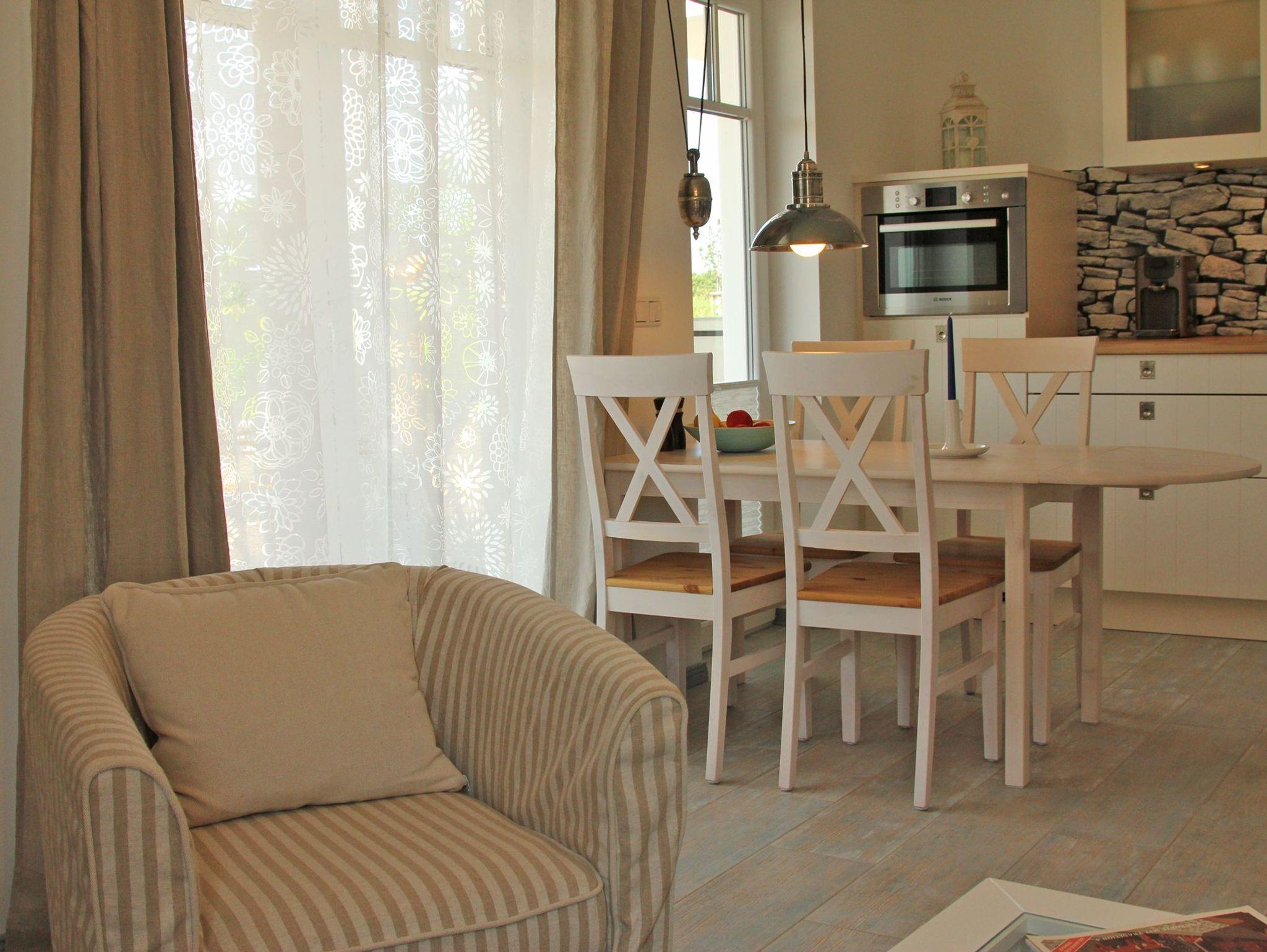 Die Küche ist in den Wohnraum integriert und mit hochwertigen Markengeräten ausgestattet. Direkt an die Terrasse und den Garten schließt sich der Park von Börgerende mit Spielplatz und Fitness Parcours an.