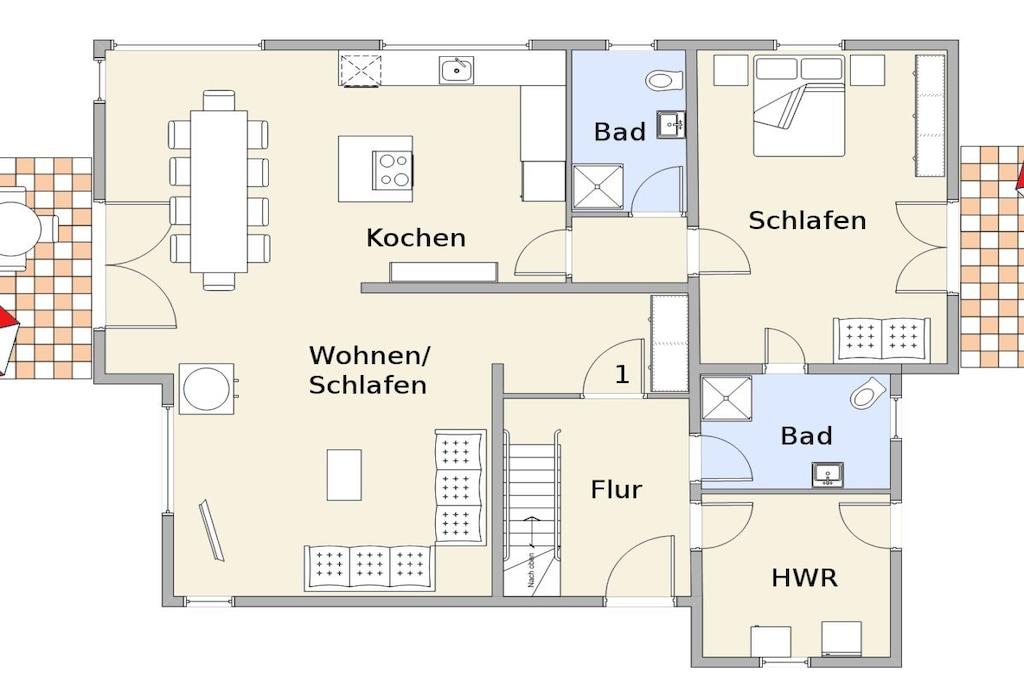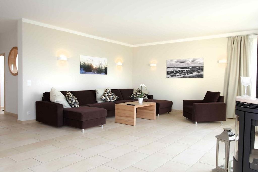Große Ferienwohnung am Meer mit Garten und schöner Terrasse, stilvoll, maritim und erstklassig. 2 Bäder. Der Wohn- und Essbereich ist sehr großzügig: die Küche mit dem Kochblock ist zum Essbereich geöffnet. In dem sehr großen Wohnzimmer finden Sie eine bequeme Eckcouch, um auch einmal entspannt Fernsehen zu schauen. In die Couch ist ein hochwertiges Schlafsofa integriert. Insgesamt können in der Wohnung sechs Personen bequem schlafen. Sie wohnen auf 90 m² mit 1 Schlafzimmer und 1 Wohnzimmer, komplett ausgestattete Ferienwohnung, alles was man für einen beglückenden Urlaub wünscht.