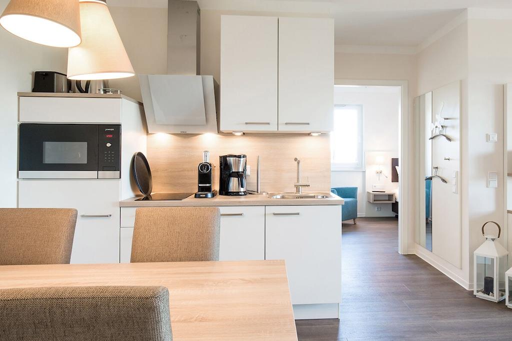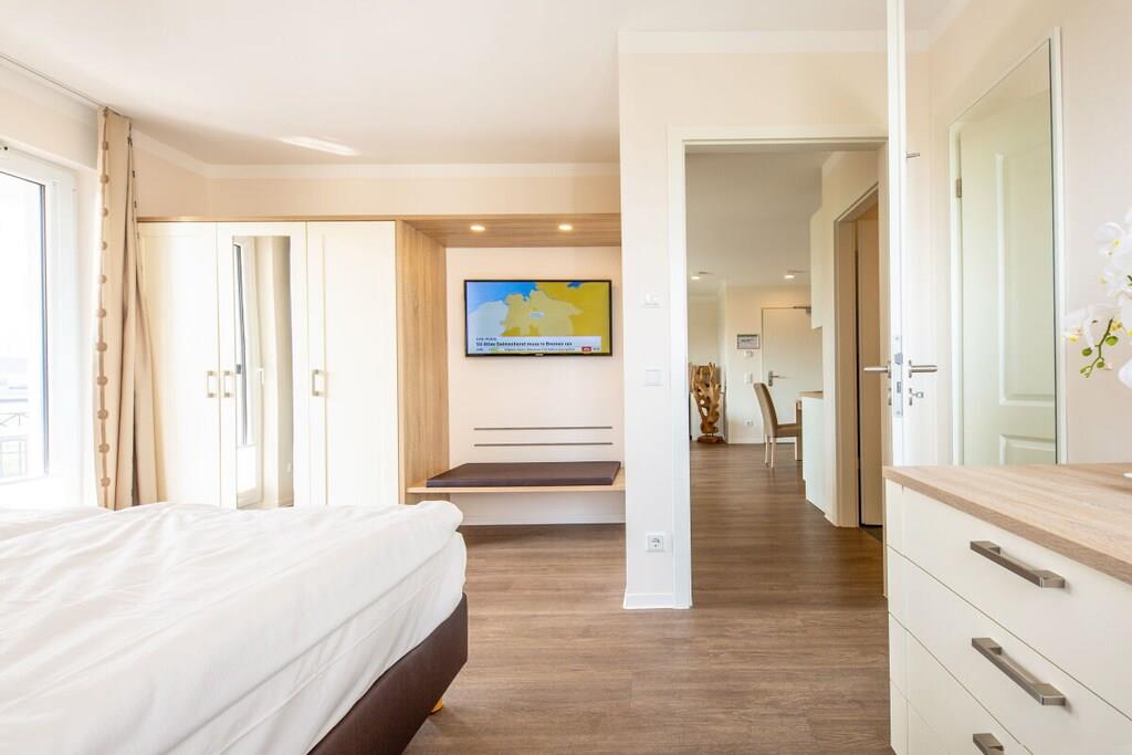 Das 58 m² Zwei-Zimmer-Nichtraucher-Apartment 2-50 ist für bis zu 4 Personen geeignet. Sie haben eine voll ausgestattete Küche, zwei TV's, Couchgarnitur mit Schlaffunktion (1,50x2,00), Schreibtisch, grosses Boxspringbett (1,80x2,00) mit zusätzlichem Topper, Schranksafe und ein grosses Bad mit Regendusche. Genießen Sie den von beiden Zimmern begehbaren sonnigen grossen Süd-Balkon mit Ostseeblick. Auch aus dem Schlafzimmerfenster haben Sie den Blick bis zur Ostsee. Freuen Sie sich auf die Vorteile einer grossen Ferienwohnung in Verbindung mit den Annehmlichkeiten und dem Service eines Hotelbetriebes, Rezeption, eine grosszügige Wellnesslandschaft mit Pool, Saunen und Erlebnisduschen sowie einem hoteleigenen Restaurant.