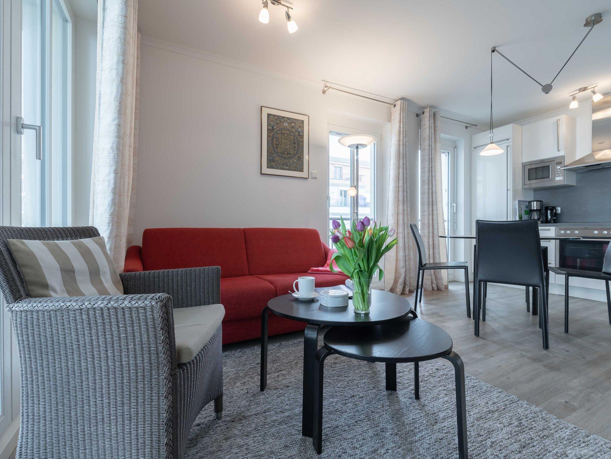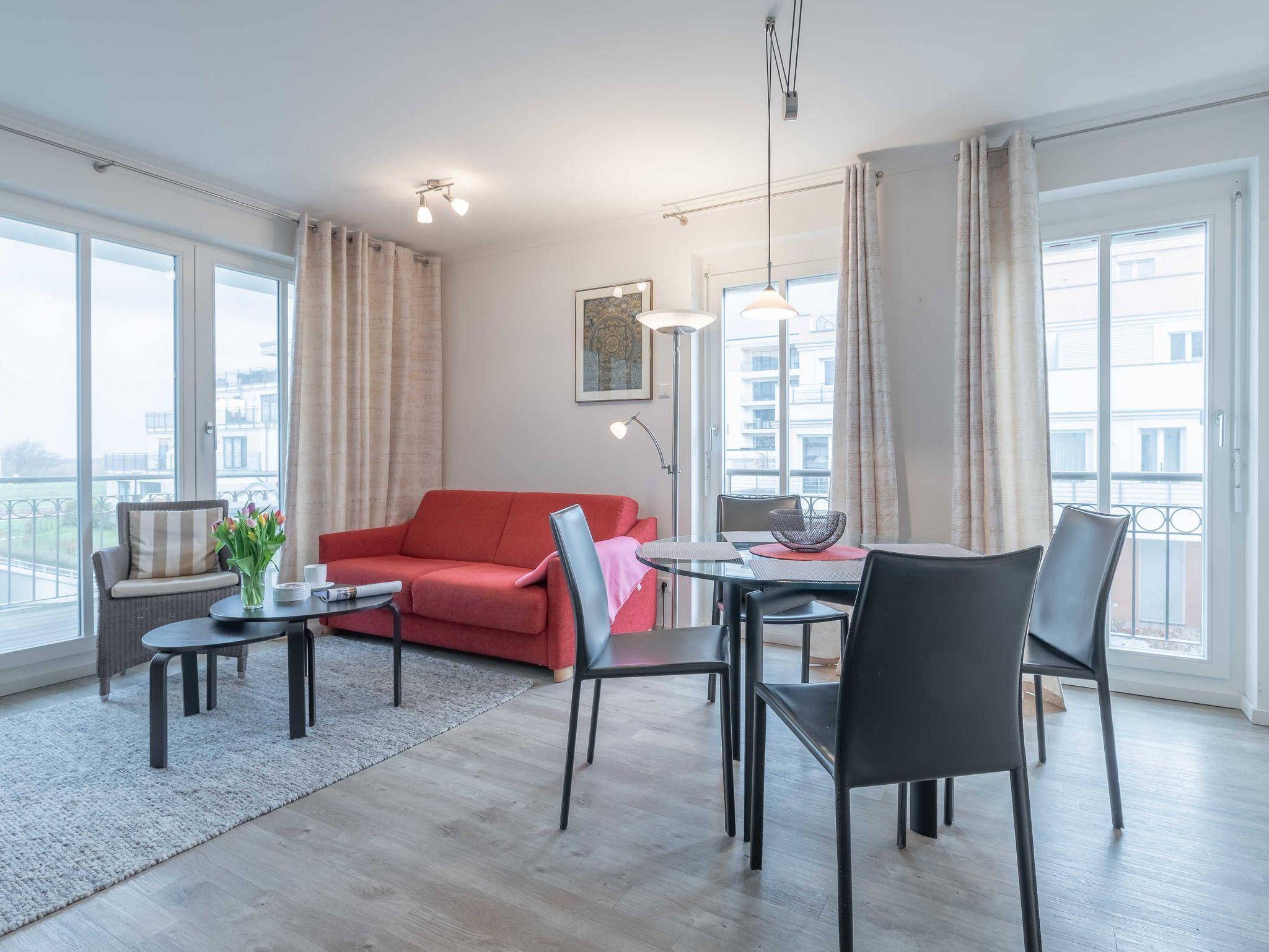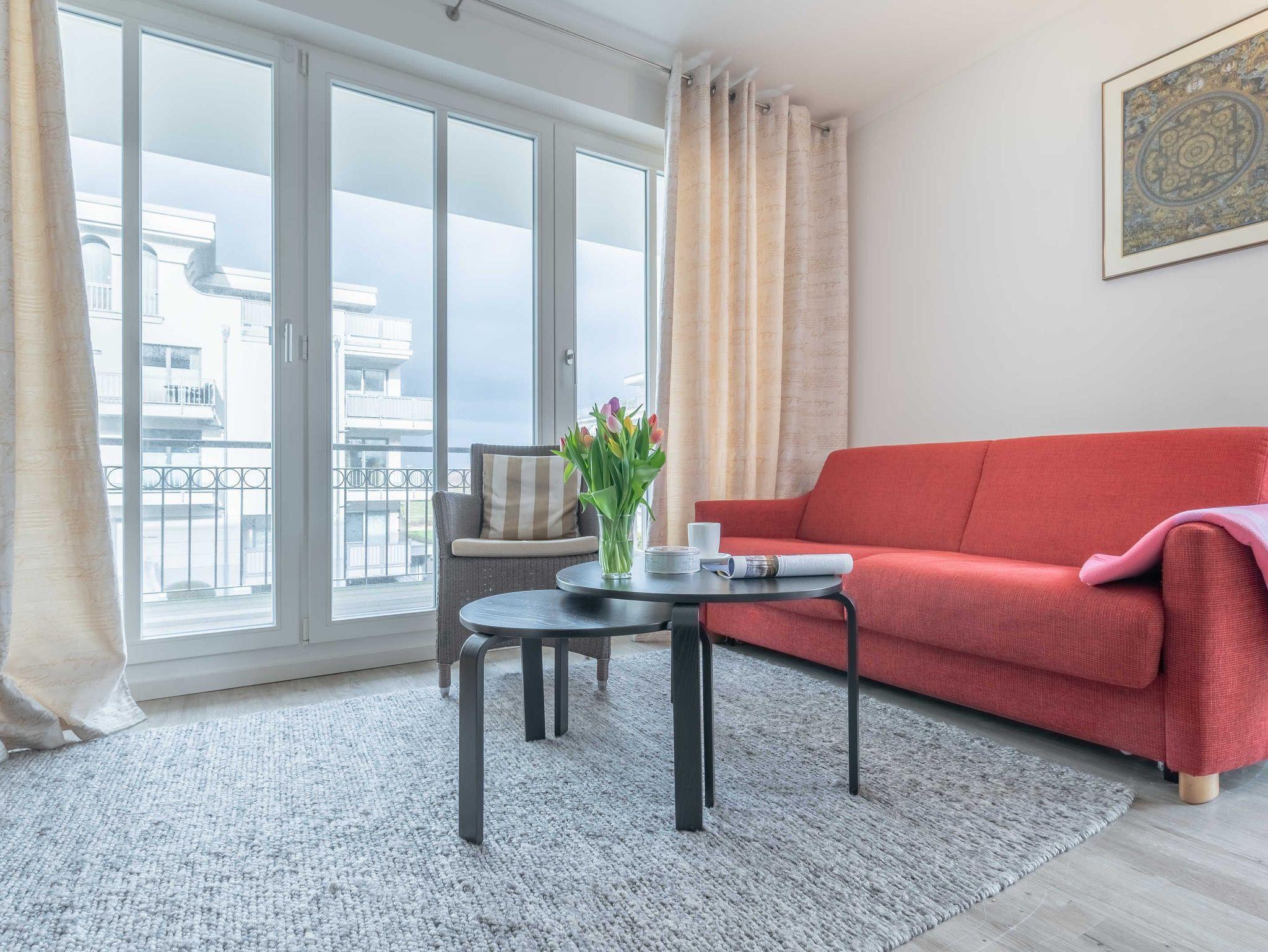 Verbringen Sie entspannte Urlaubstage in dieser geschmackvoll, für drei Personen eingerichteten Zwei-Zimmer-Wohnung. Auf dem großzügigen, nach Norden ausgerichteten Balkon mit Blick zur Ostsee können Sie wunderbar relaxen und Ihr Frühstück oder ein Glas Wein am Abend genießen. Im Wohnraum erwarten Sie eine bequeme, ausziehbare Couch, ein Sessel sowie ein großer Flat Screen-Fernseher, Stereoanlage und DVD-Player. Der Essbereich ist mit einem stilvollen Esstisch und passenden Stühlen ausgestattet und besticht mit direktem Blick auf den gleichfarbigen Kaminofen (Kaminholz muss selbst organisiert werden.). Die offene Küche ist mit Geschirrspüler, Kühlschrank mit Gefrierfach, Backofen mit Cerankochfeld und Mikrowelle sowie diversen Kochutensilien ausgestattet. Zwei bis zum Boden reichende Fenster lassen viel Licht in den Raum. Vor beiden Fenstern sind schräg stellbare Markisoletten als Sonnenschutz angebracht. Das Schlafzimmer empfängt Sie mit einem großen Doppelbett (getrennte Matratzen / je 90 x 200 cm) und einem viertürigen Schrank aus Holz und Glaselementen. Das großzügige, elegante Duschbad verfügt über eine bodengleiche Dusche und einen großen Waschtisch mit großem Spiegel.