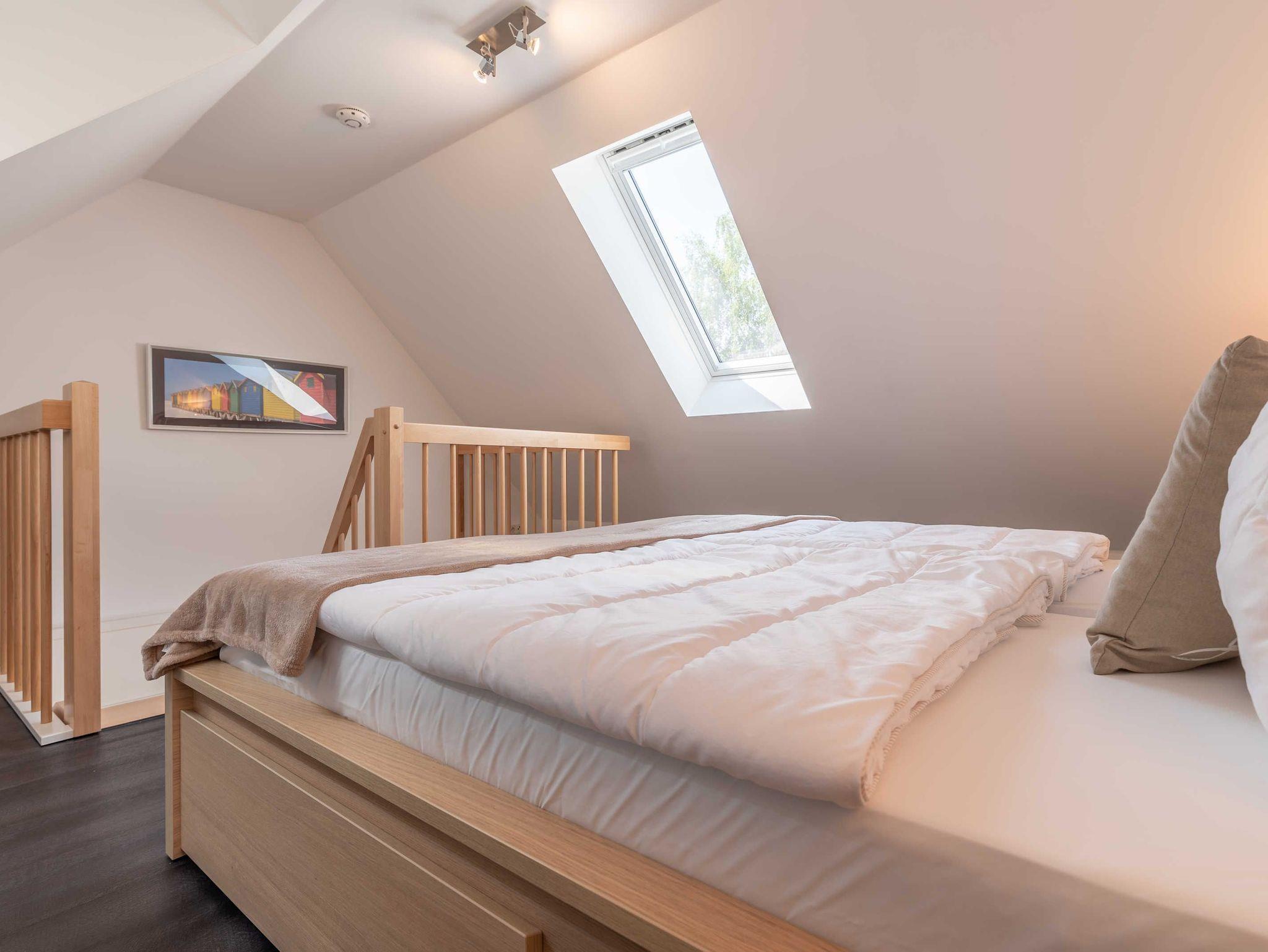 Über eine Treppe im Wohnbereich gelangt man in den Schlafbereich. Hier empfängen Sie ein Doppelbett (180 x 200 cm) mit integriertem Bettkasten (mitgetrennten Matratzen) und zwei Nachttischen. Zwei große Dachfenster ermöglichen ein gutes Durchlüften des Schlafzimmers. Die Fenster sind mit Spezialrollos ausgestattet, welche das Aufheizen des Raumes verhindern und den Raum sehr gut verdunkeln. Ein dritter Schlafplatz befindet sich im Wohnzimmer auf der großen Eckcouch. Hier ist es möglich, einen großen Hocker beizustellen, um eine geräumige Liegefläche zu schaffen. Der Schlafplatz eignet sich für eine Person bis ca. 16 Jahre.