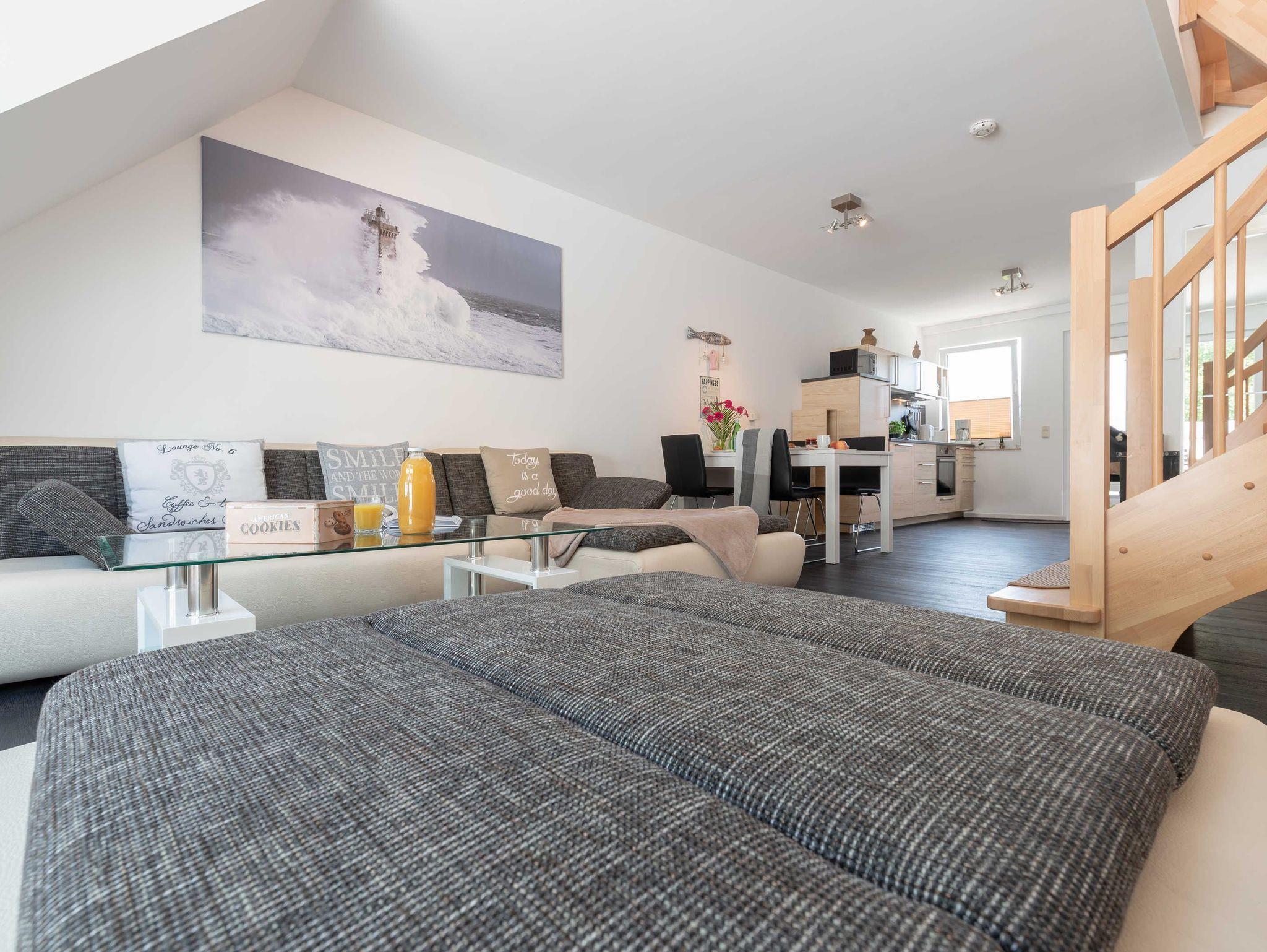 Nur etwa 500 m vom schönen Naturstrand entfernt und in ruhiger Lage, befindet sich das 2017 neuerbaute Ferienobjekt mit individuell eingerichteten Ferienwohnungen. Unsere Ferienwohnung liegt im ersten Obergeschoss und ist exklusiv über eine großzügige Gittertreppe erreichbar. Alle Räume sind mit einer Fußbodenheizung ausgestattet. Unsere Gäste finden hier zu jeder Jahreszeit Komfort und Behaglichkeit und dementsprechend die Gelegenheit zur Ruhe und Entspannung. Die hochwertige modern eingerichtete Ferienwohnung verfügt über eine Gesamtwohnfläche von ca. 55 Quadratmetern.