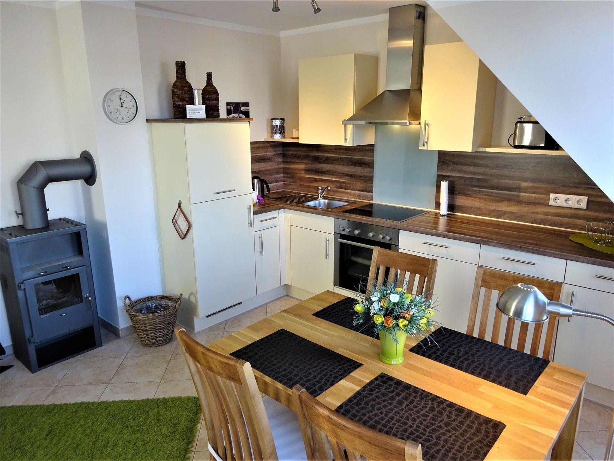 Genießen Sie in beiden Räumen jeweils auch einen voll möblierten Balkon, der eine mit Meerblick! Die hochwertige Wohnküche ist umfangreich ausgestattet. Ebenfalls auf dieser Ebene befindet sich das moderne Bad mit Dusche. Über eine bequeme Treppe gelangt man vom Flur in das Dachgeschoss zu einer gemütlichen Schlafgalerie mit zwei großen Einzelbetten (zusammenstellbar). Die in der gesamten Wohnung verlegte Fußbodenheizung und ein Kaminofen machen Ihren Urlaub auch im Winter traumhaft gemütlich (Kaminholz wird nicht gestellt.)
