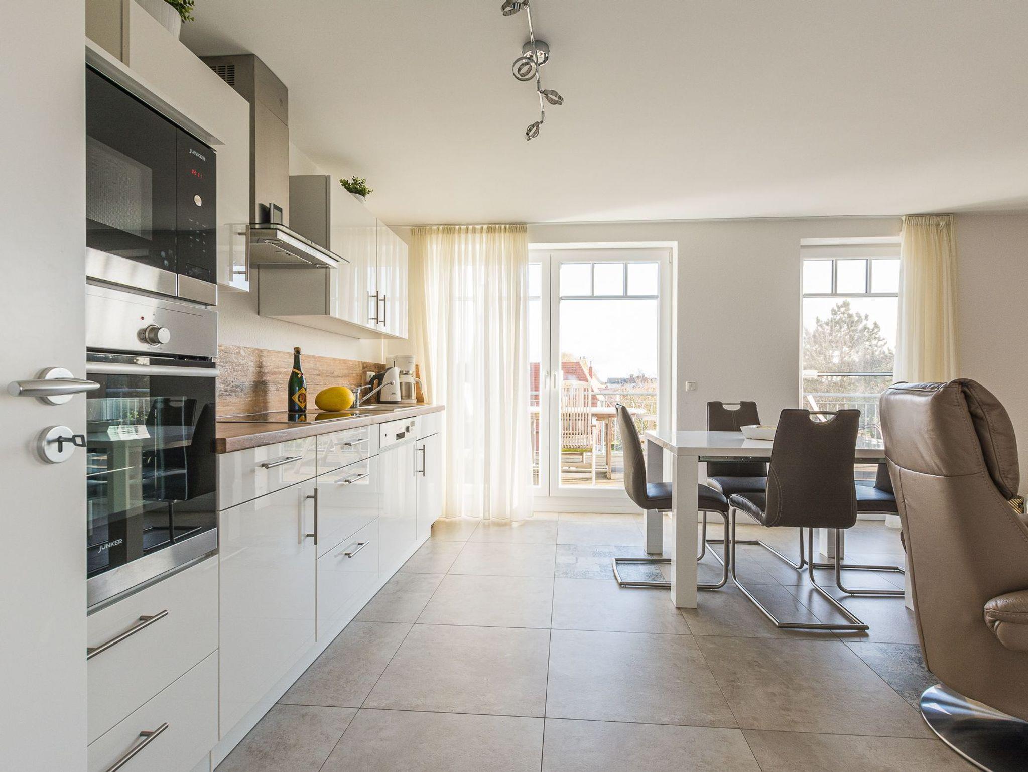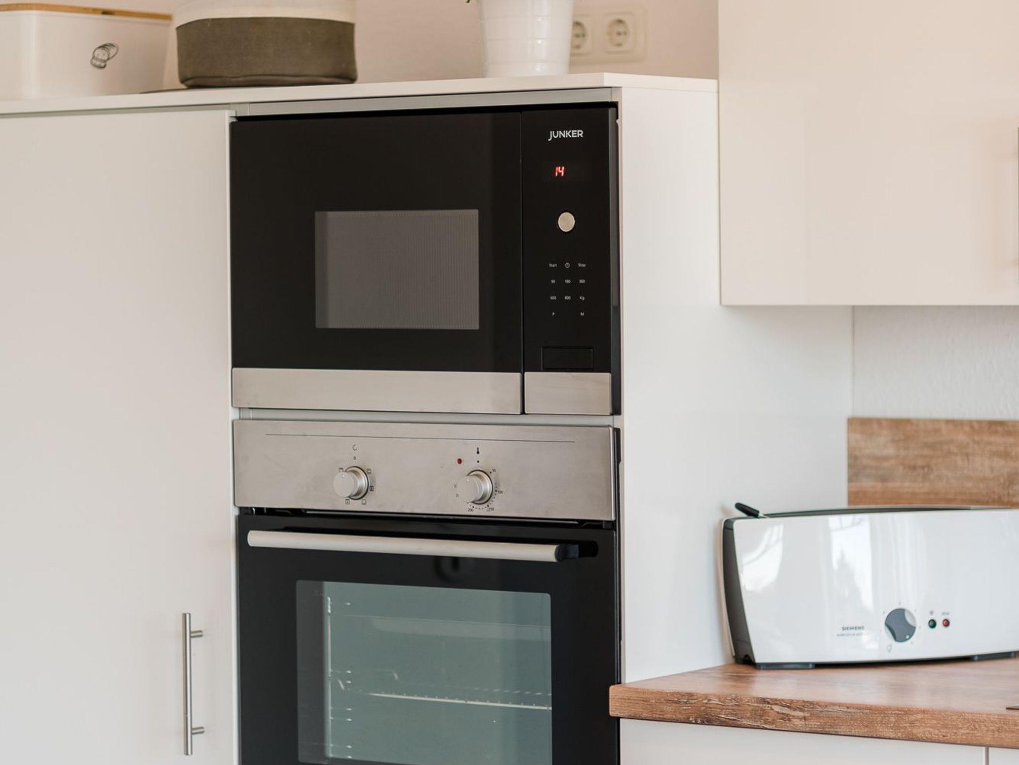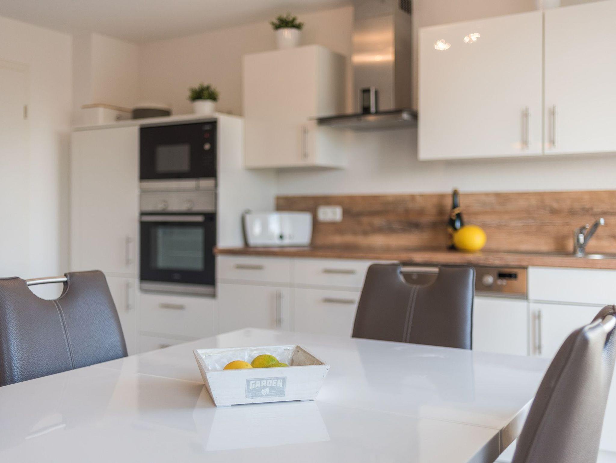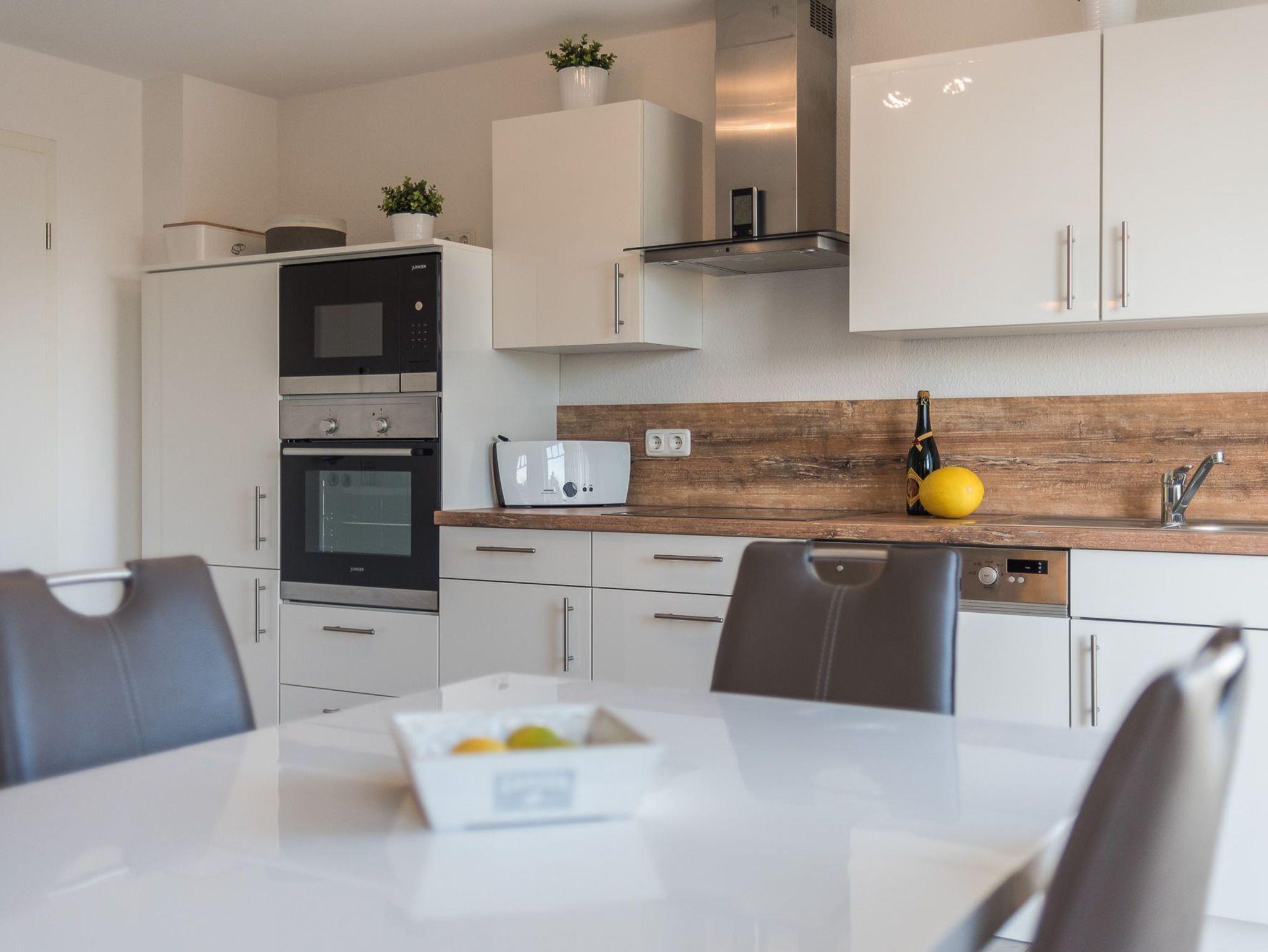 Im offenen Küchen- und Essbereich befindet sich die moderne komplett ausgestatte Küche mit Kühlschrank inkl. integriertem Tiefkühlfach, Geschirrspüler, Backofen, Mikrowelle, Ceran-Kochfeld, Kaffeemaschine, Wasserkocher sowie Toaster. Sie lässt also keine Wünsche offen.