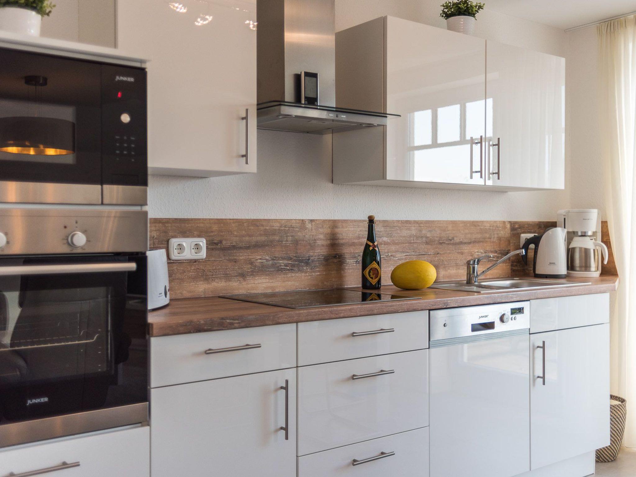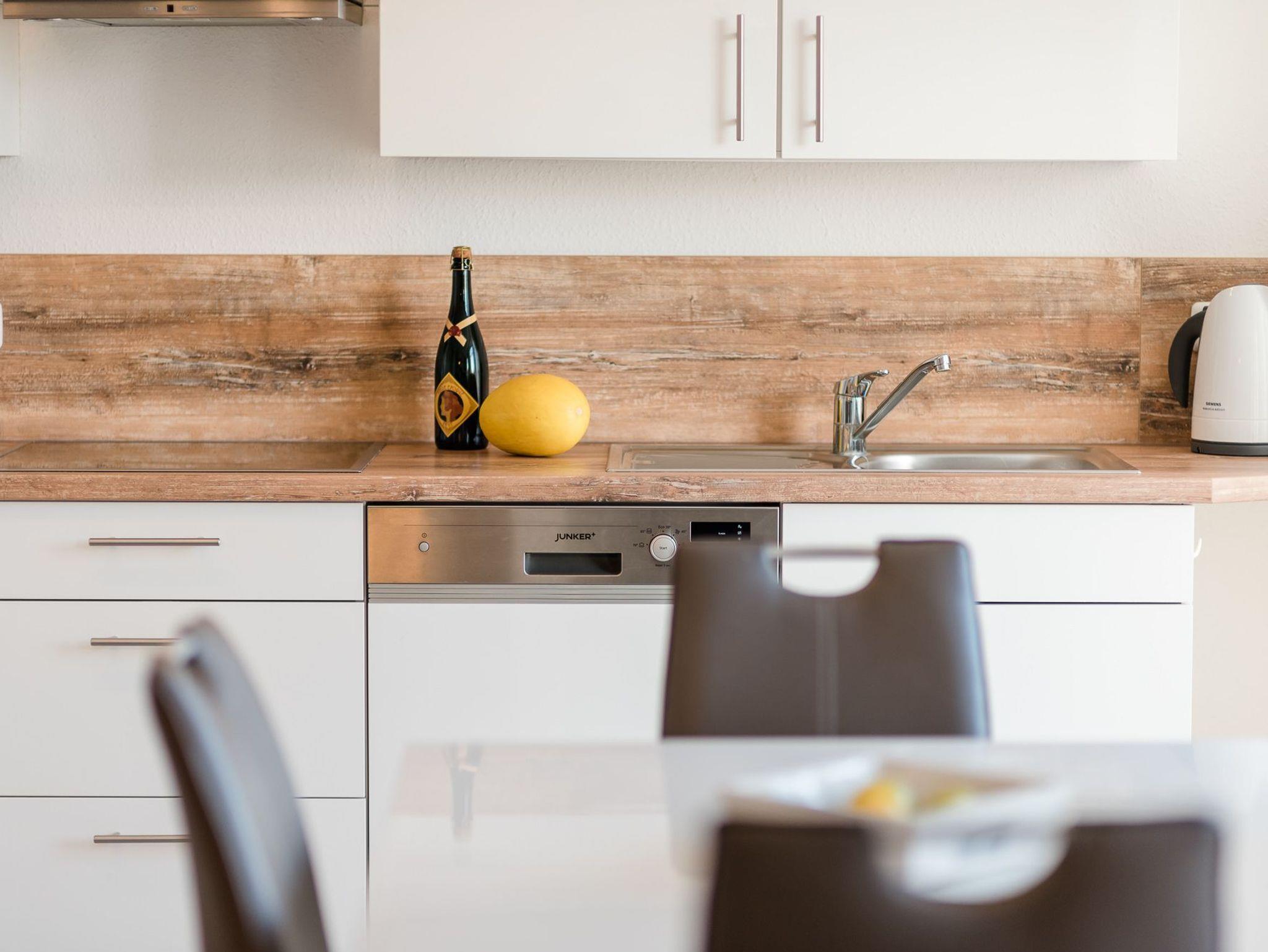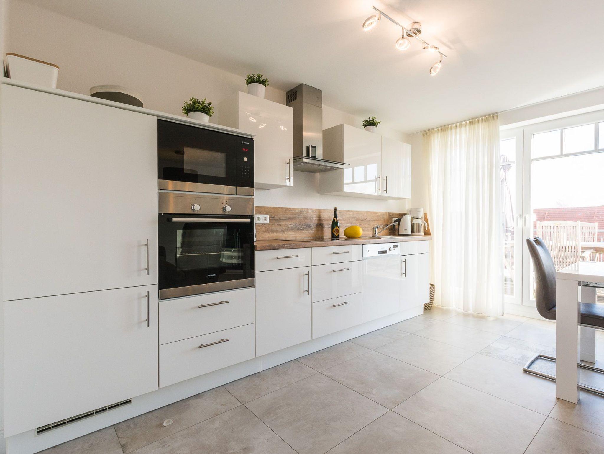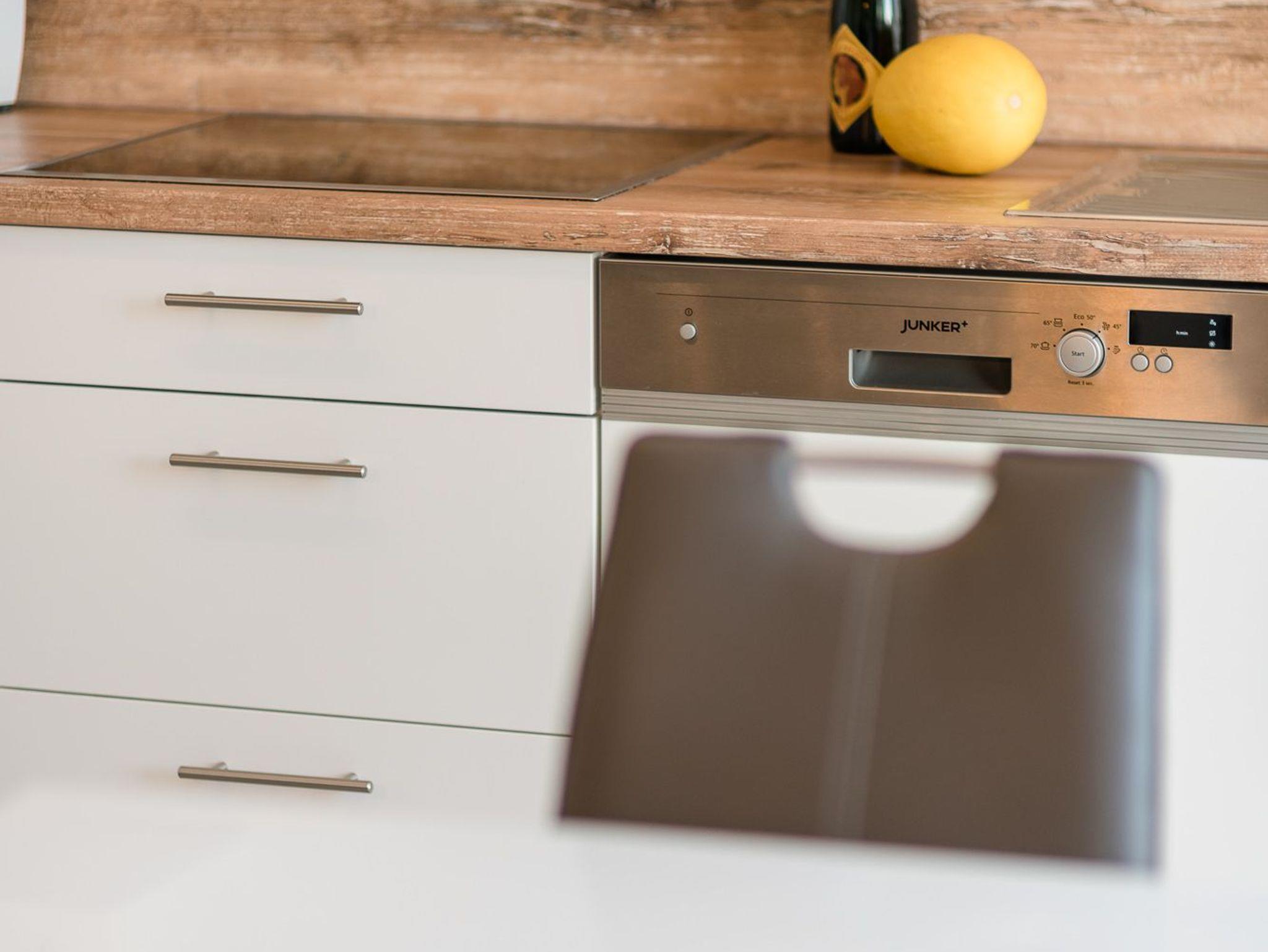 Im offenen Küchen- und Essbereich befindet sich die moderne komplett ausgestatte Küche mit Kühlschrank inkl. integriertem Tiefkühlfach, Geschirrspüler, Backofen, Mikrowelle, Ceran-Kochfeld, Kaffeemaschine, Wasserkocher sowie Toaster. Sie lässt also keine Wünsche offen.