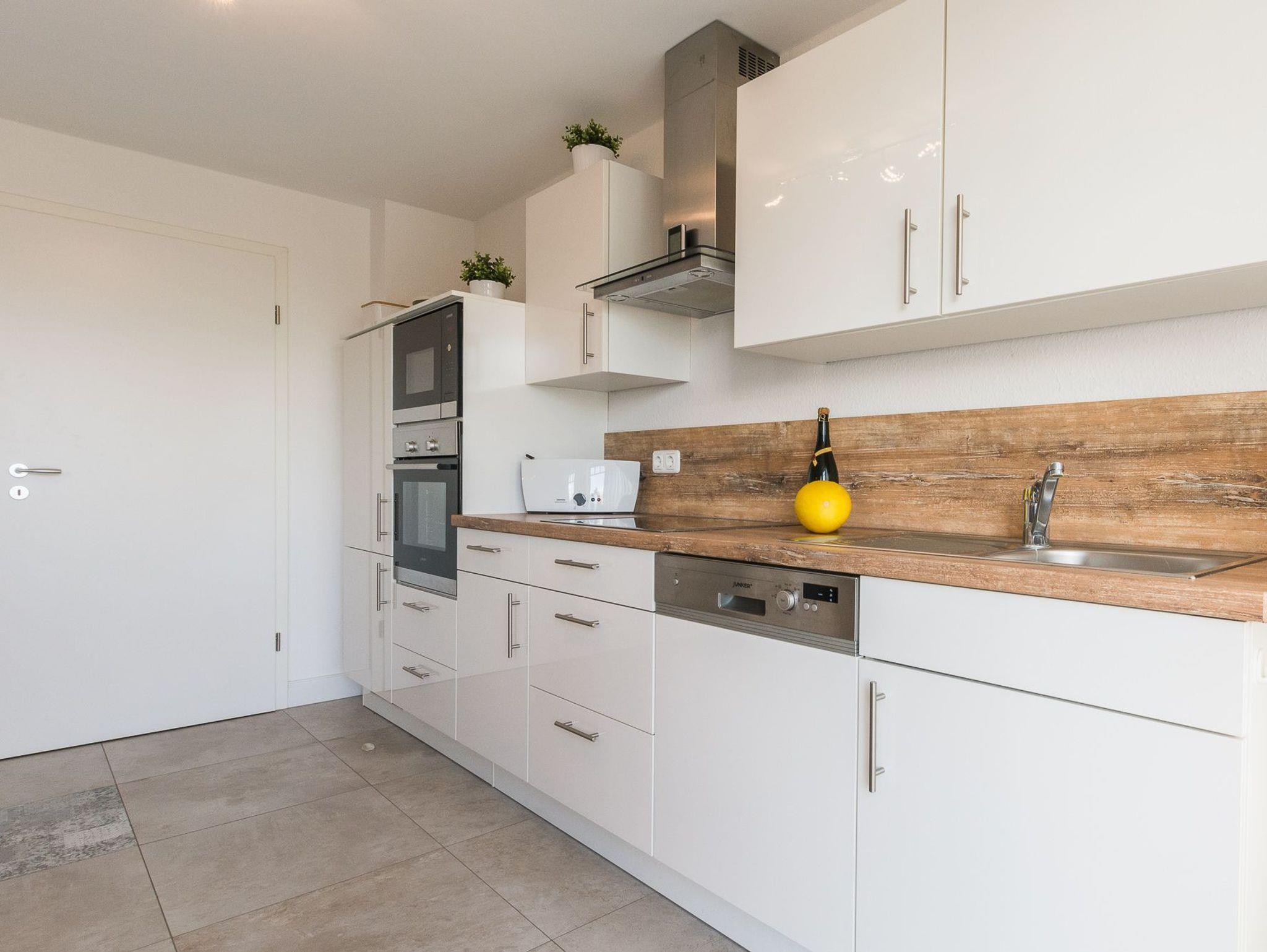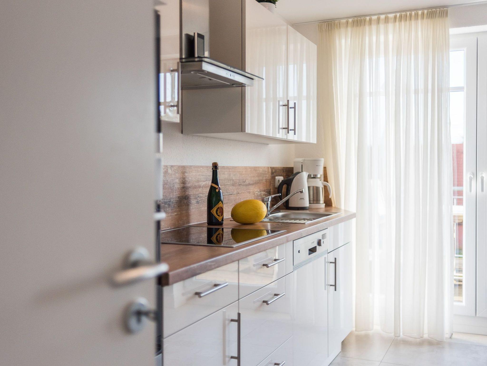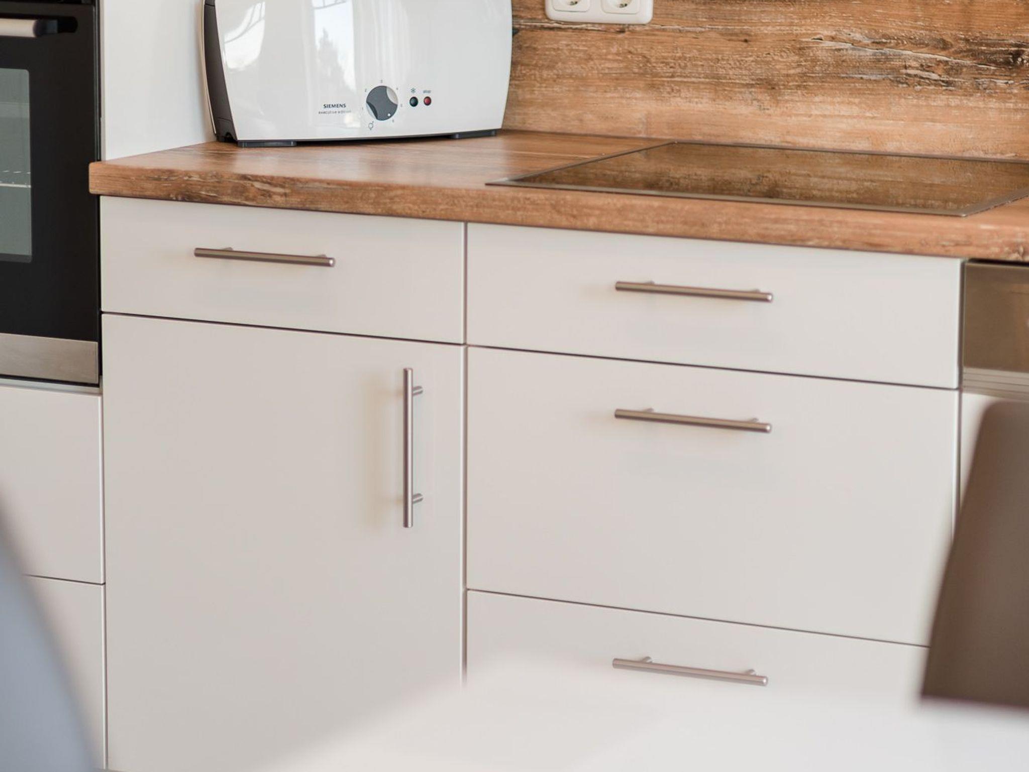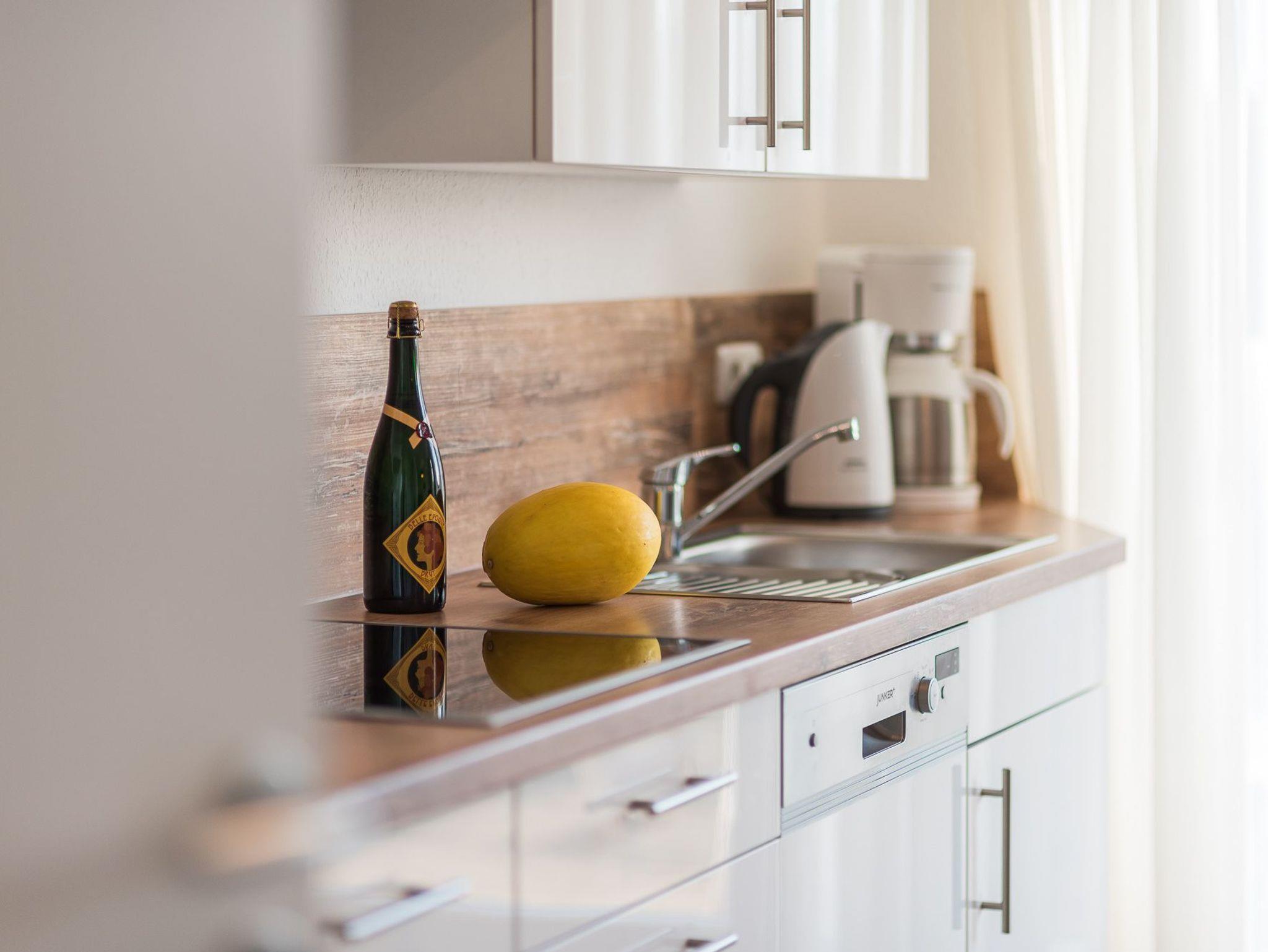 Im offenen Küchen- und Essbereich befindet sich die moderne komplett ausgestatte Küche mit Kühlschrank inkl. integriertem Tiefkühlfach, Geschirrspüler, Backofen, Mikrowelle, Ceran-Kochfeld, Kaffeemaschine, Wasserkocher sowie Toaster. Sie lässt also keine Wünsche offen.