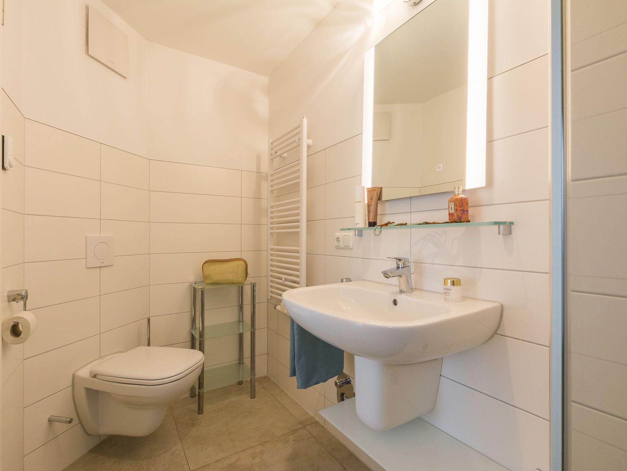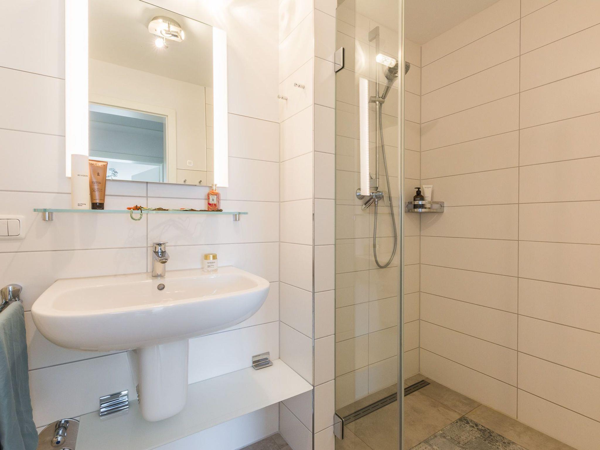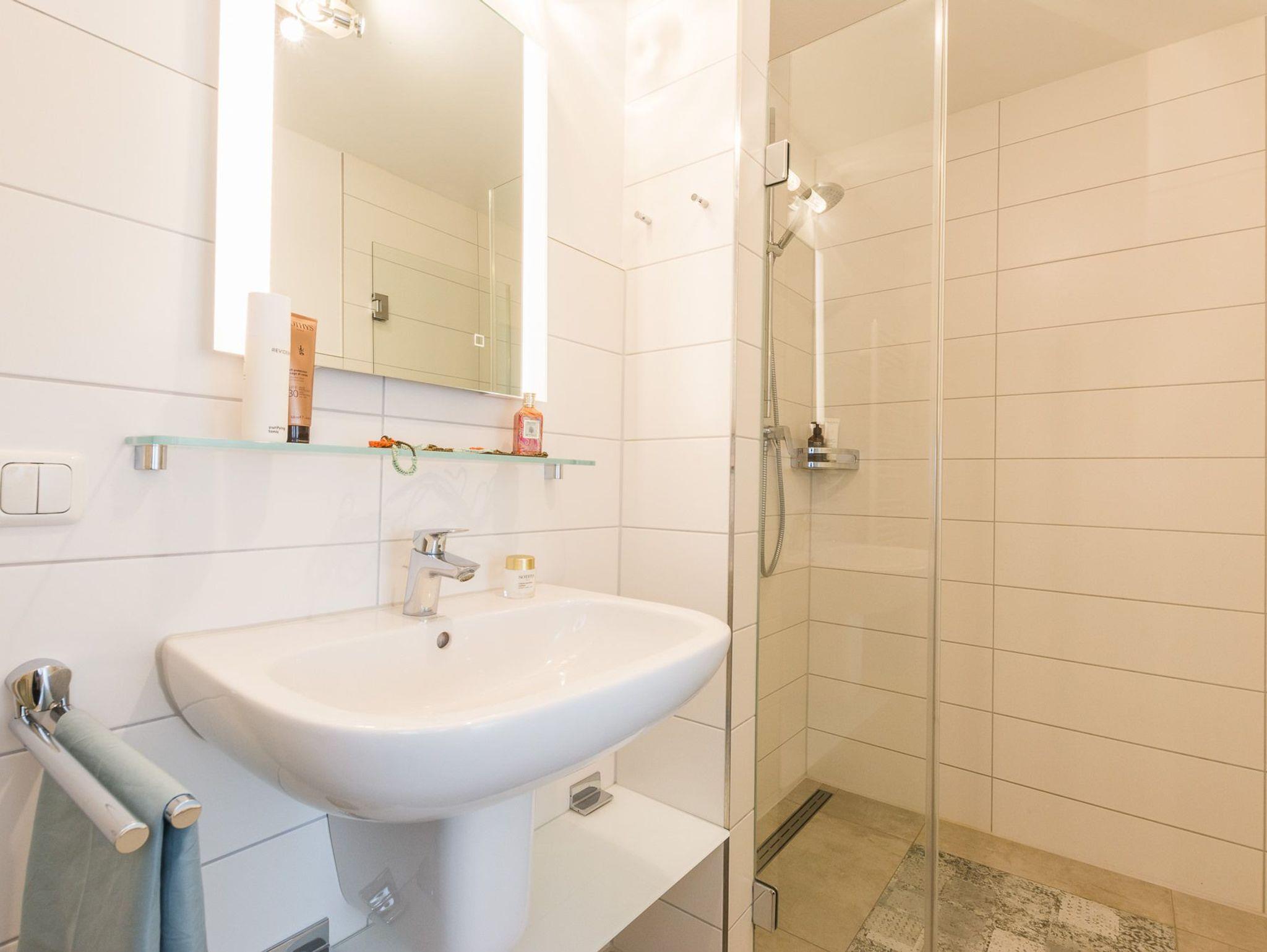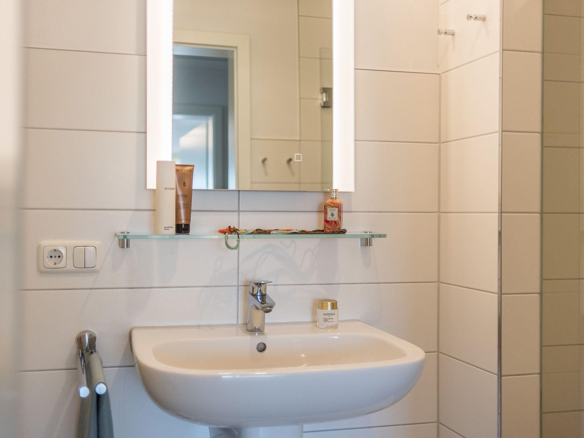 Das kleine, aber feine Bad bietet eine große ebenerdige Dusche, einen beheizbaren Handtuchhalter und ein Waschbecken mit beleuchtetem Wandspiegel sowie zusätzlicher Ablage.