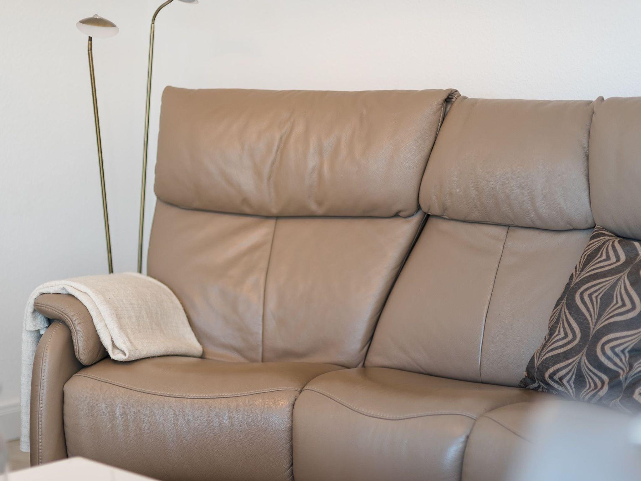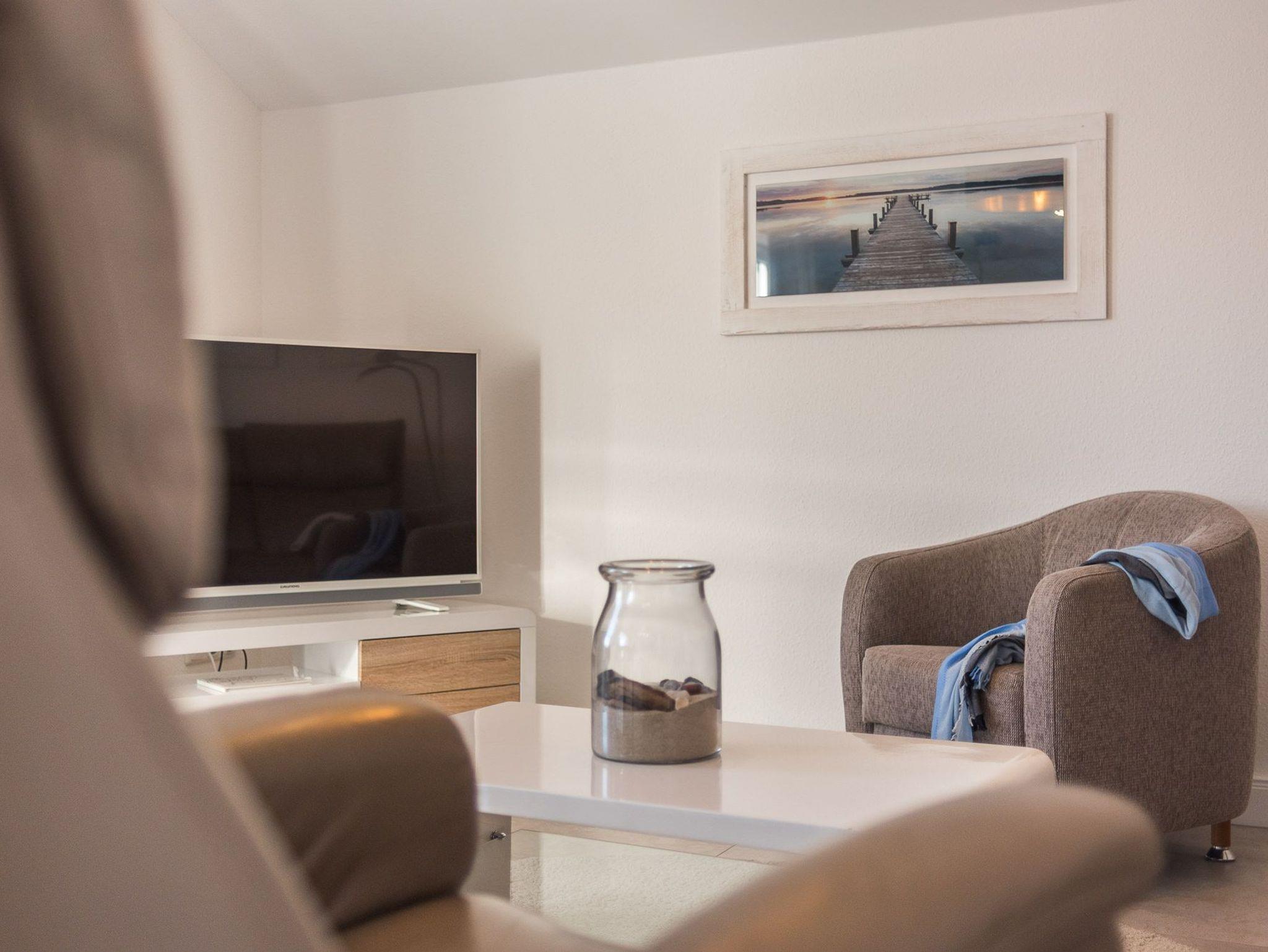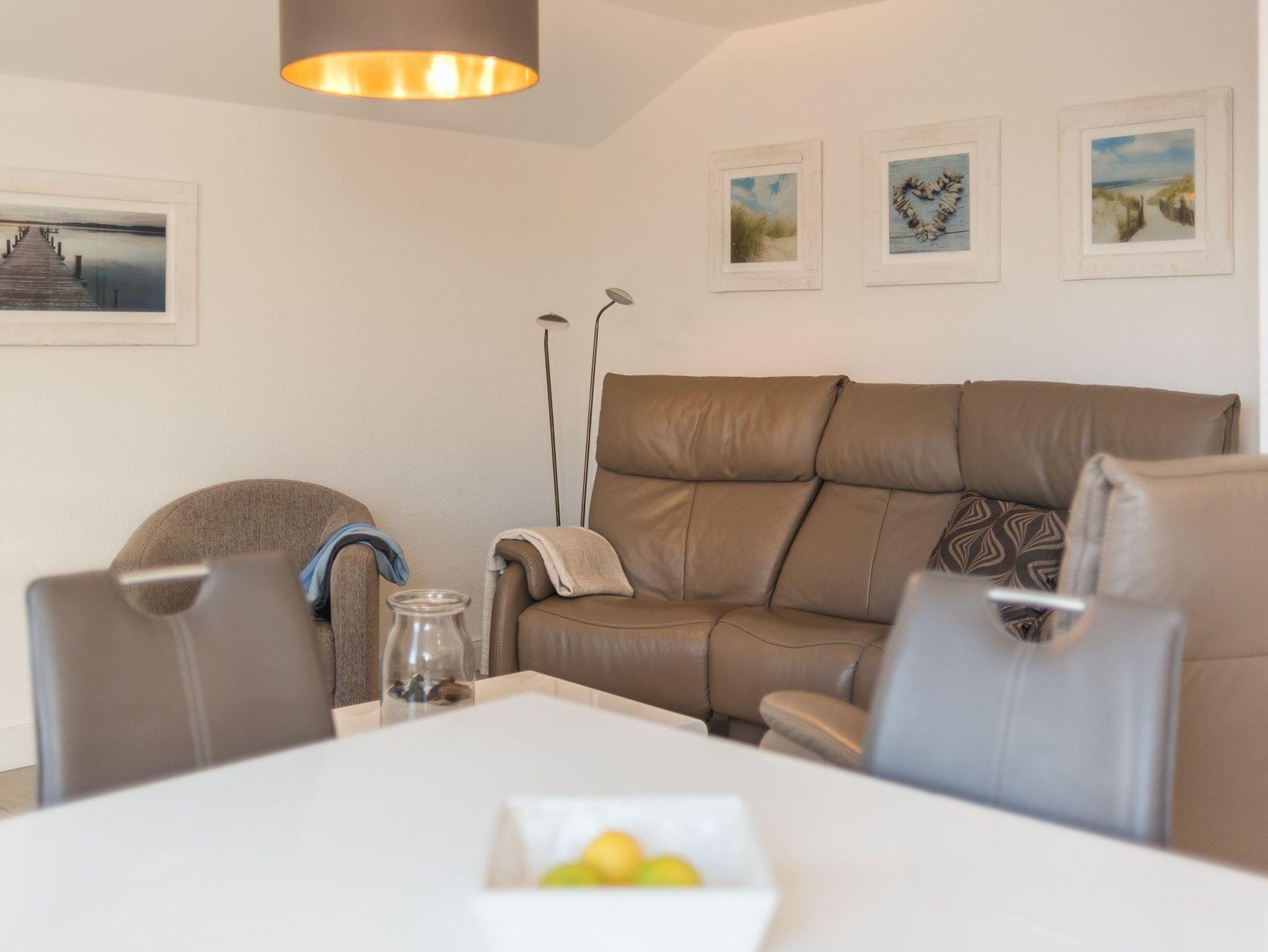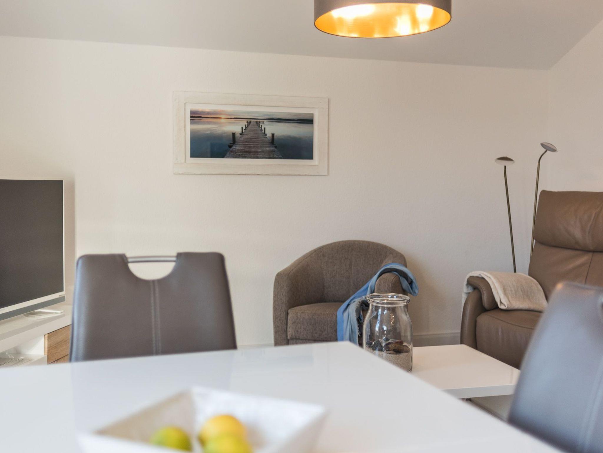 Der Wohn- und Essbereich mit Zugang zum Balkon ist hell und lichtdurchflutet. Er verfügt über eine moderne Wohnungseinrichtung. Nach einer anstrengenden Anreise haben Sie die Möglichkeit sich in den Relax Möbeln bei einem Glas Wein oder einer Tasse Kaffee zu entspannen. Ein Flatscreen TV bietet Ihnen sowohl die Möglichkeit nach Lust und Laune einen guten Film oder Nachrichten zu sehen als auch Musik zu hören. Insektenschutzgitter sind in der Wohnung vorhanden.
