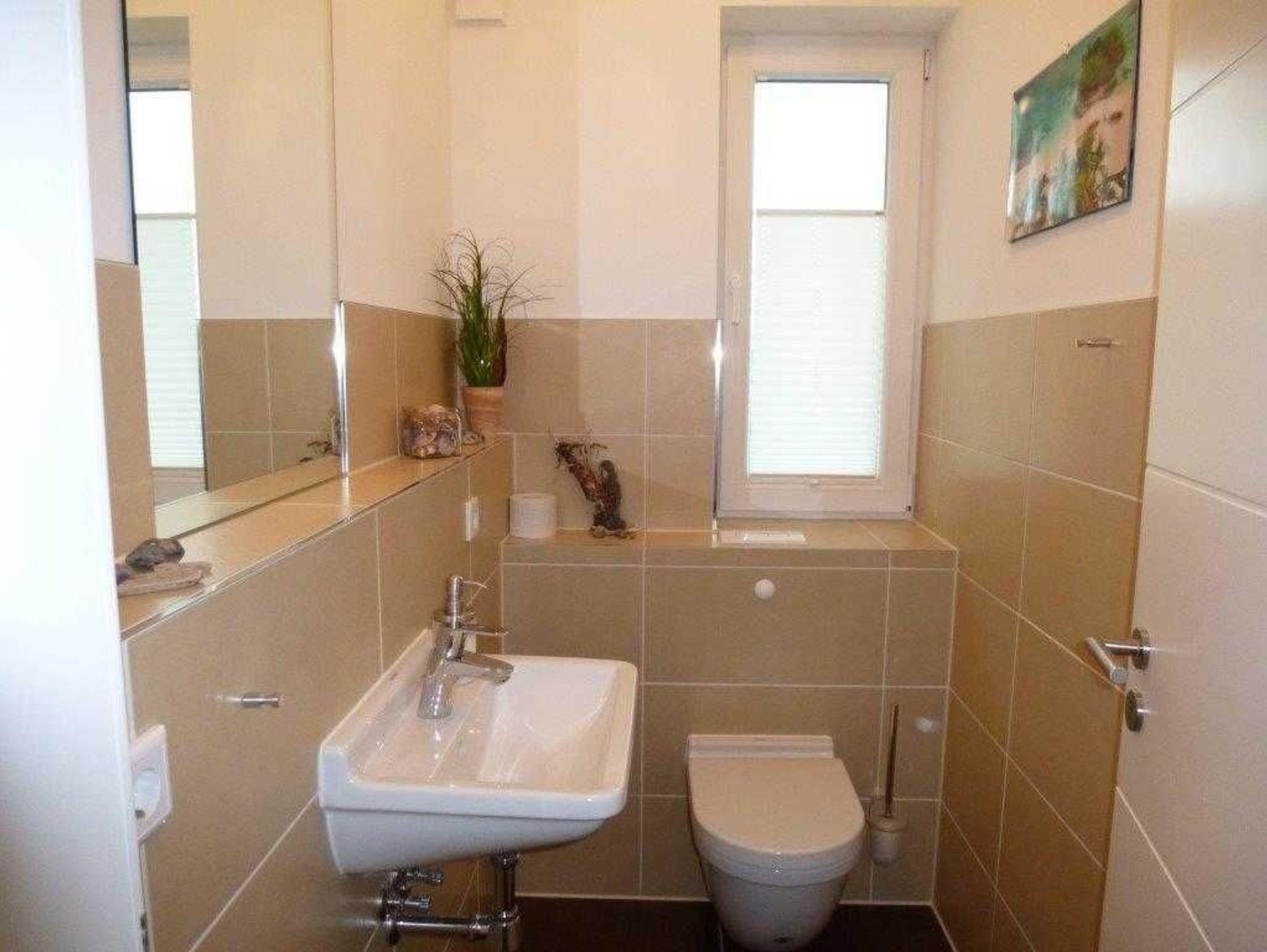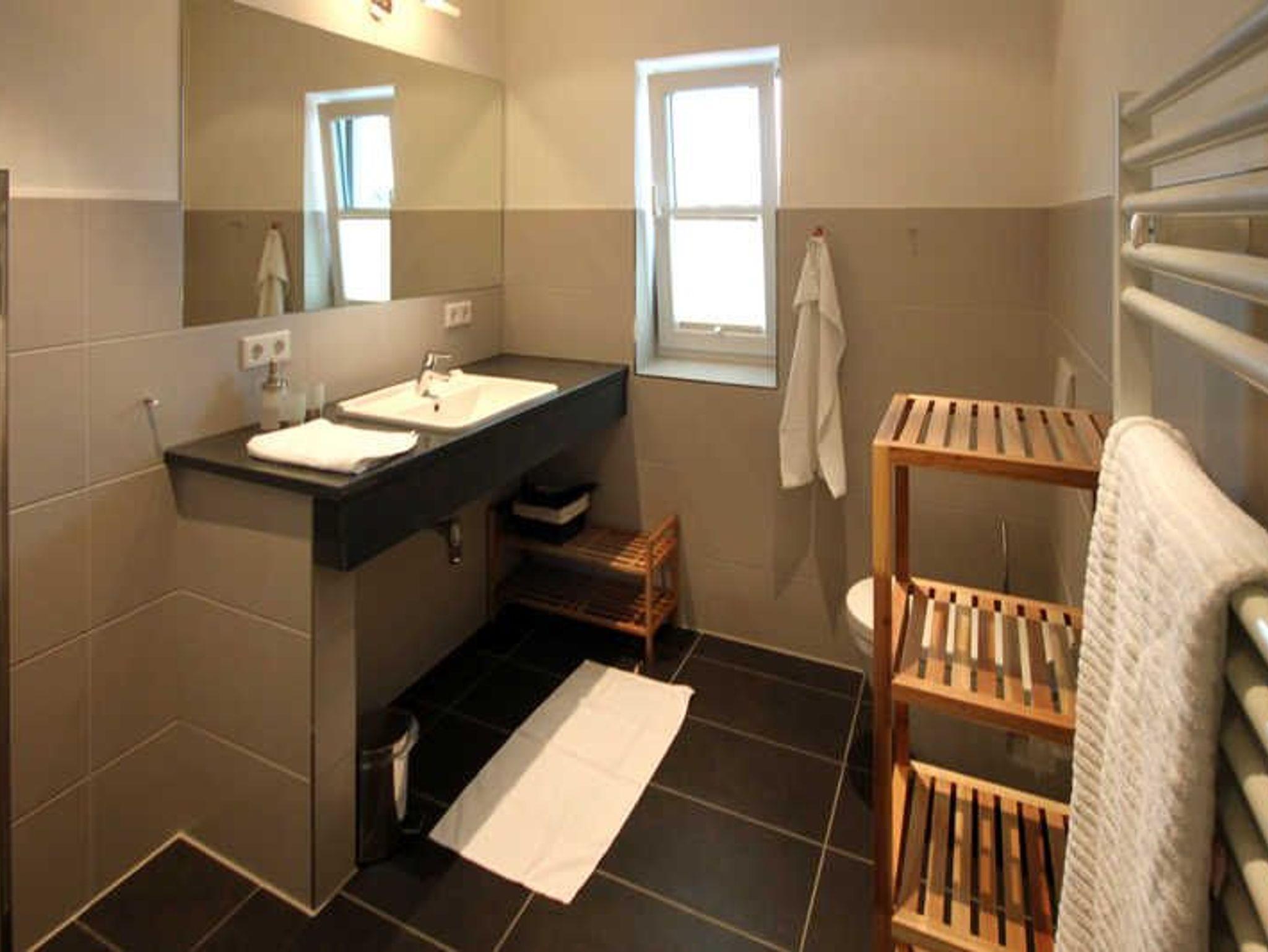 Das elegante Bad hat eine bodengleiche Dusche, beheizbaren Handtuchhalter, einen großzügigen Waschtisch mit breitem Spiegel und einen Föhn. Zusätzlich hat die Wohnung ein separates Gäste-WC.
