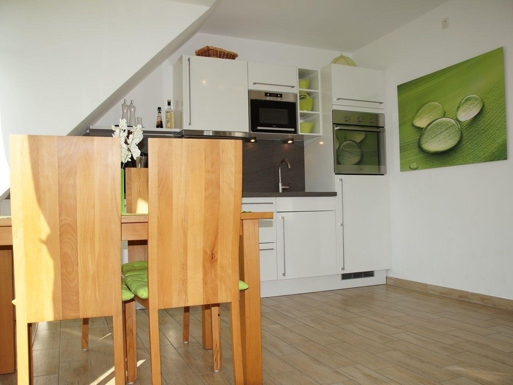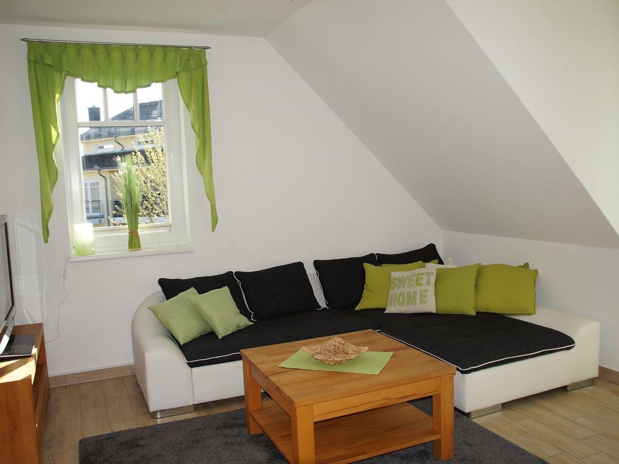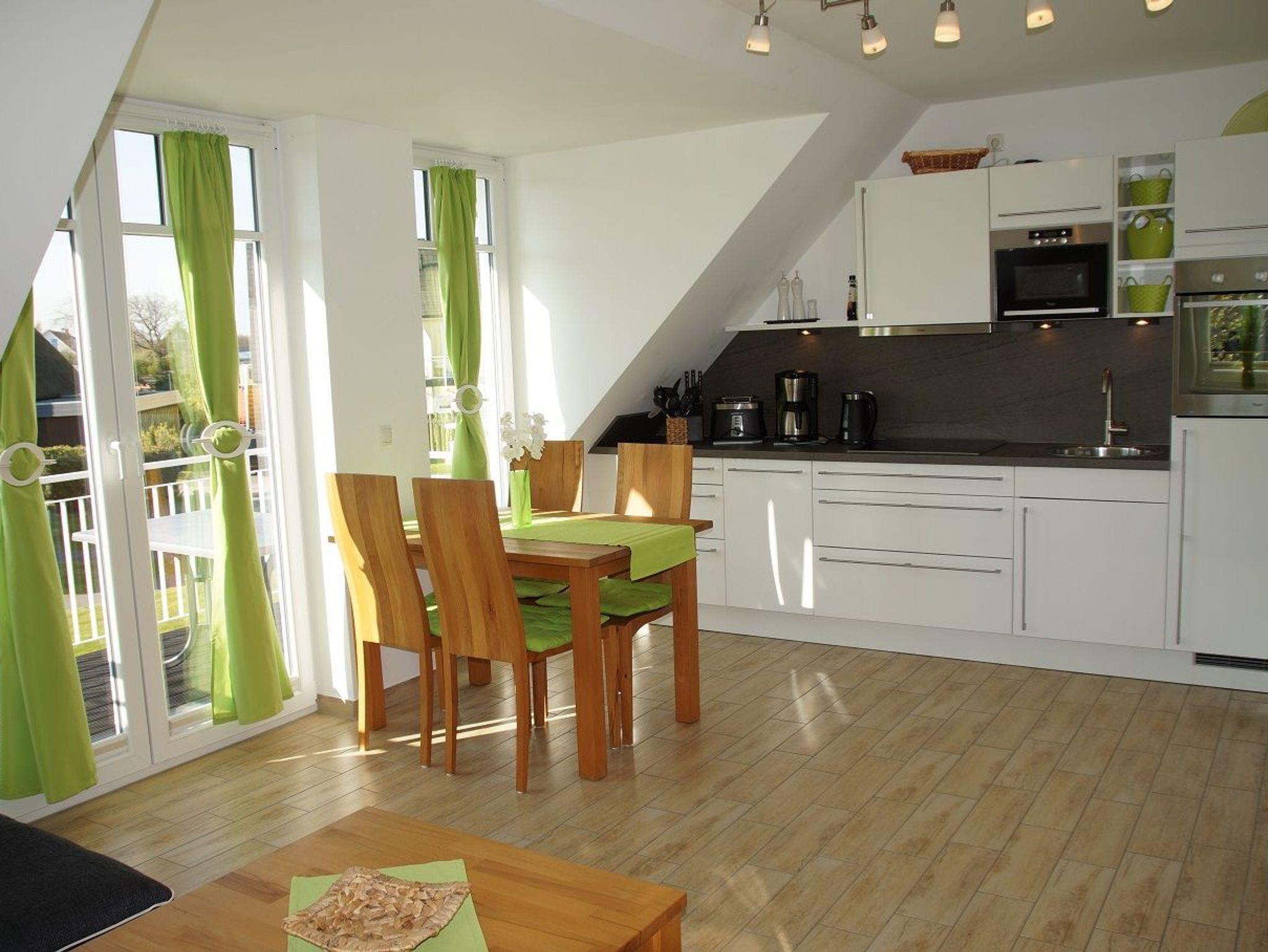 Der Wohn-/Essbereich empfängt bis zu vier Gäste mit einer offenen Wohnküche, einem freundlichen Essbereich, einer TV-Lounge mit Plasma TV (106 cm) sowie einem gemütlichen Ecksofa zum Relaxen. Die hochwertige Küche ist umfangreich ausgestattet. Ein Herd mit Cerankochfeld, ein Backofen, ein Kühlschrank mit Gefrierfach und eine Mikrowelle lassen das Herz eines jeden Hobbykochs höher schlagen. Die kleinen Küchenhelfer wie Toaster, Wasserkocher und Kaffeemaschine schaffen einen sorgenfreien Start in den Tag. Das moderne Tageslicht-Bad mit Dusche ist mit einem Handtuchheizkörper und einem Fön ausgestattet. Das Schlafzimmer mit Doppelbett verfügt über einen geräumigen Kleiderschrank sowie einen Fernseher. Außerdem wurden im Schlafbereich Vorhänge zum Abdunkeln angebracht. Von der lichtdurchfluteten, offenen Dachgalerie (ebenfalls mit Doppelbett) haben Sie einen traumhaften Blick auf die Ostsee. Die Fußbodenheizung in der gesamten Wohnung und ein Kaminofen machen Ihren Urlaub auch im Winter traumhaft gemütlich (Kaminholz muss selbst organisiert werden). Egal ob Morgensonne oder Sonnenuntergang - auf den beiden Balkonen in Süd- und Nordausrichtung können Sie diese genießen und dabei das Rauschen der Ostseewellen auf sich wirken lassen.