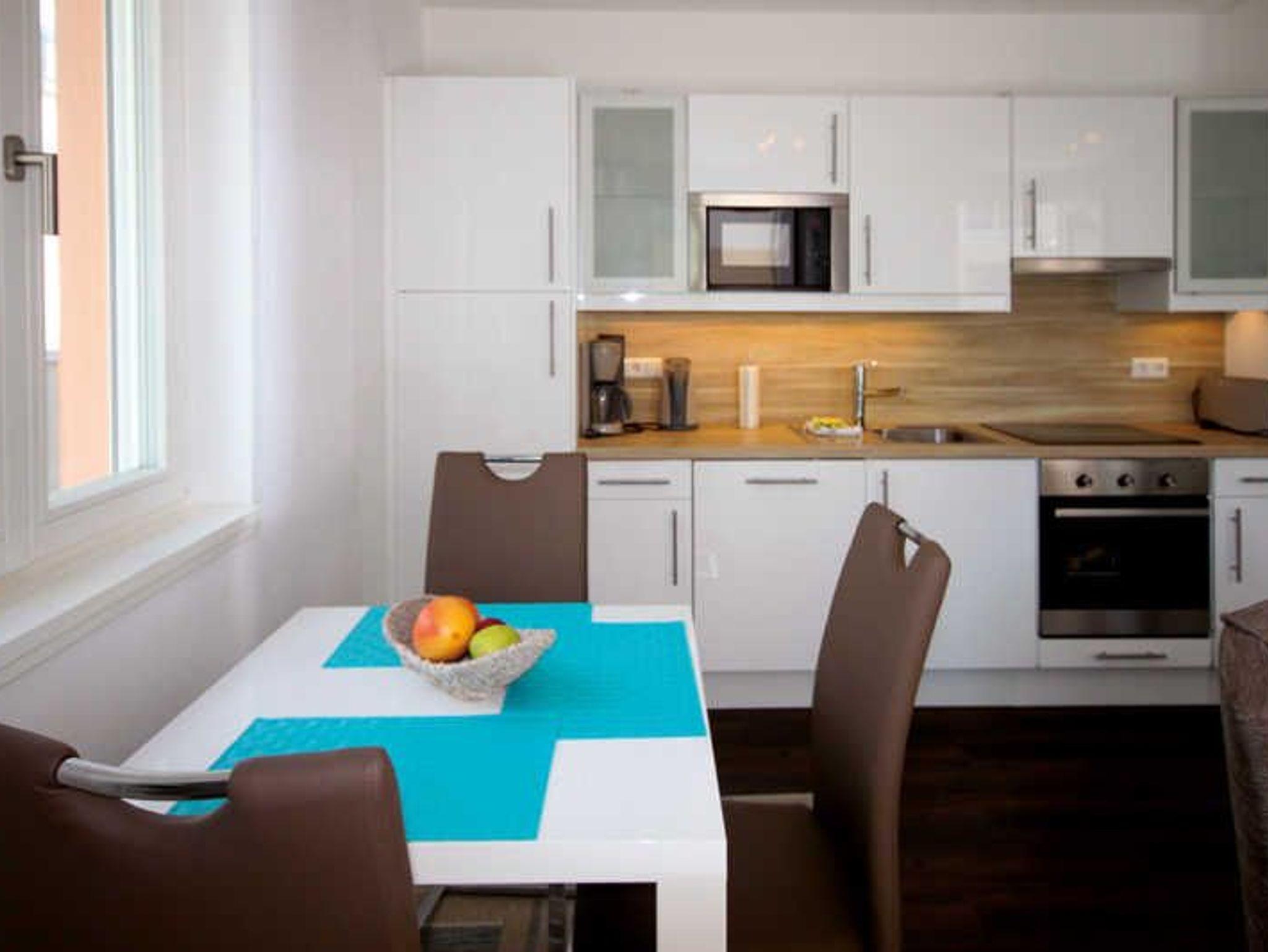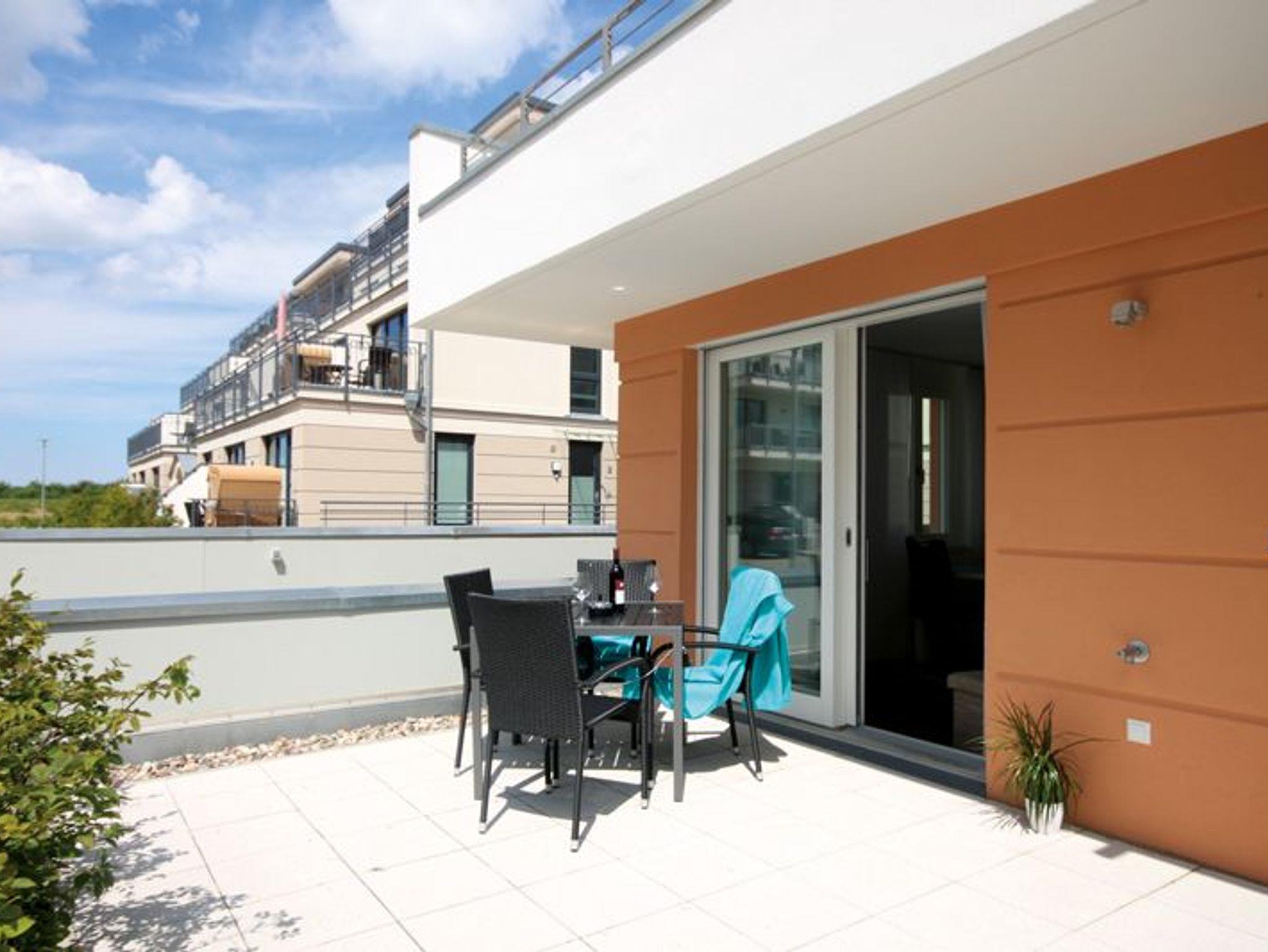 Die modern eingerichtete Zwei-Raumwohnung ist für max. zwei Erwachsene und ein Kind (bis 12 Jahre) ausgestattet. Der zur Küche hin offene Wohnbereich empfängt Sie mit einer großen Schlafcouch. Von dieser aus können Sie Sie sich News, Filme oder andere Sendungen im TV- Gerät anschauen. Oder Sie nutzen den vorhandenen DVD- Player und die Stereoanlage für weitere Unterhaltung. Zum Essen oder einem großen Spieleabend steht ein Esstisch mit vier Swing-Stühlen zur Verfügung. Die Küche selbst bietet, außer den Standardgeräten, ein Cerankochfeld (4 Platten), einen Backofen, eine Mikrowelle und einen Kühlschrank, inklusive Gefrierfach. So lässt sich auch mal das Lieblingsessen im Urlaub zubereiten. Für den erholsamen Urlaubsschlaf steht im Schlafraum ein Boxspringbett (durchgehende Matratze) zur Verfügung. Auch ein weiteres TV- Gerät ist hier vorhanden. Und für genügend Stauraum und knitterfreie Wäsche, sorgt der geräumige Kleiderschrank. Die Morgentoilette können Sie in der Dusche mit fußbodengleichem Einstieg ausgiebig vornehmen. Für die Pflege nach der Dusche steht im Duschbad ein moderner Waschtisch mit breitem Spiegel zur Verfügung. Zum Tagesabschluss geht es dann in die Sauna. Diese befindet sich gleich neben dem Schlafraum. Da die Sauna mit einem Münzautomaten betrieben wird, halten Sie bitte Münzen bereit. Für die Entspannung nach dem Strandtag sorgt eine Terrasse. Diese ist nach Süd-West ausgerichtet. Ein Terrassentisch mit vier entsprechenden Stühlen bietet genug Platz für eine Flasche Wein und etwas zum Naschen. Auf die Terrasse selbst gelangt man aus dem Wohnraum. Die Wohnung ist eine Nichtraucherwohnung. Haustiere sind nicht gestattet. Die kostenfreie WLAN-Verbindung in dieser Unterkunft ist ausschließlich für die Verwendung von Social Mediakanälen sowie den Austausch von Bildern mit Familie und Freunden gedacht. Eine Nutzung zum Streamen, z.B. von Filmen, ist nicht vorgesehen. Wäscheset, Kinderreisebett und Kinderhochstuhl können kostenpflichtig zugebucht werden. Eine Waschmaschine und Trockner stehen im Waschraum, der sich im Erdgeschoss befindet. Beide Geräte sind kostenpflichtig. Hier benötigen Sie 50 Cent Münzen. Zur Ferienwohnung gehört ein kostenfreier Tiefgaragenstellplatz. Bitte beachten Sie die Durchfahrtshöhe von max. 1,90 m. Überschreitet Ihr Fahrzeug die maximale Durchfahrtshöhe, können Sie auf einen kostenpflichtigen Parkplatz in unmittelbarer Nähe ausweichen. Außerdem befindet sich in der Tiefgarage ein abschließbarer Fahrradabstellraum. Und noch einen Hinweis: Sichern Sie sich zusätzlich den Anspruch auf einen der begehrten Strandkörbe nur ein paar Meter entfernt von den rauschenden Wellen der Ostsee (Anfang Mai - Ende August) und buchen Sie jetzt zu besonderen Konditionen (12,00 € pro Tag oder 75,00 € pro Woche.)