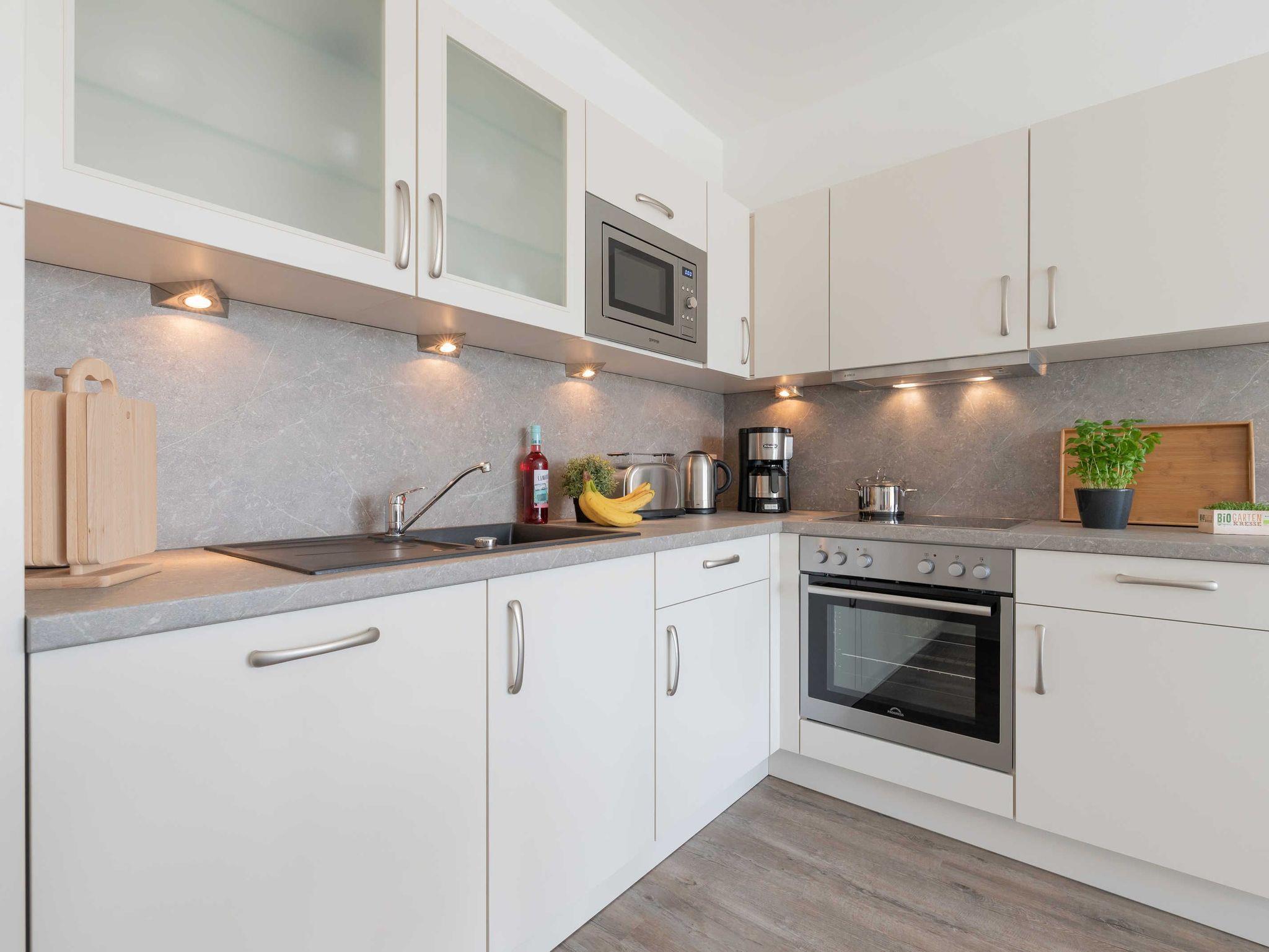 Die Wohnung verfügt über einen Wohn-/Essbereich mit integrierter Küchenzeile inkl. Kühlschrank, Ceranfeld, Backofen, Mikrowelle, Geschirrspüler und Dunstabzugshaube. Der große Esstisch lädt zu gemeinsamen Mahlzeiten und fröhlichen Spieleabenden ein. Das helle freundliche Bad[nbsp] besticht mit einer ebenerdigen Dusche und einer Waschmaschine. In den Schlafräumen erwarten Sie ein Doppelbett (180 x 200 cm) und zwei Einzelbetten (je 100 x 200 cm). Im Wohnbereich und im Schlafraum mit den zwei Einzelbetten sind Flachbildfernseher installiert.