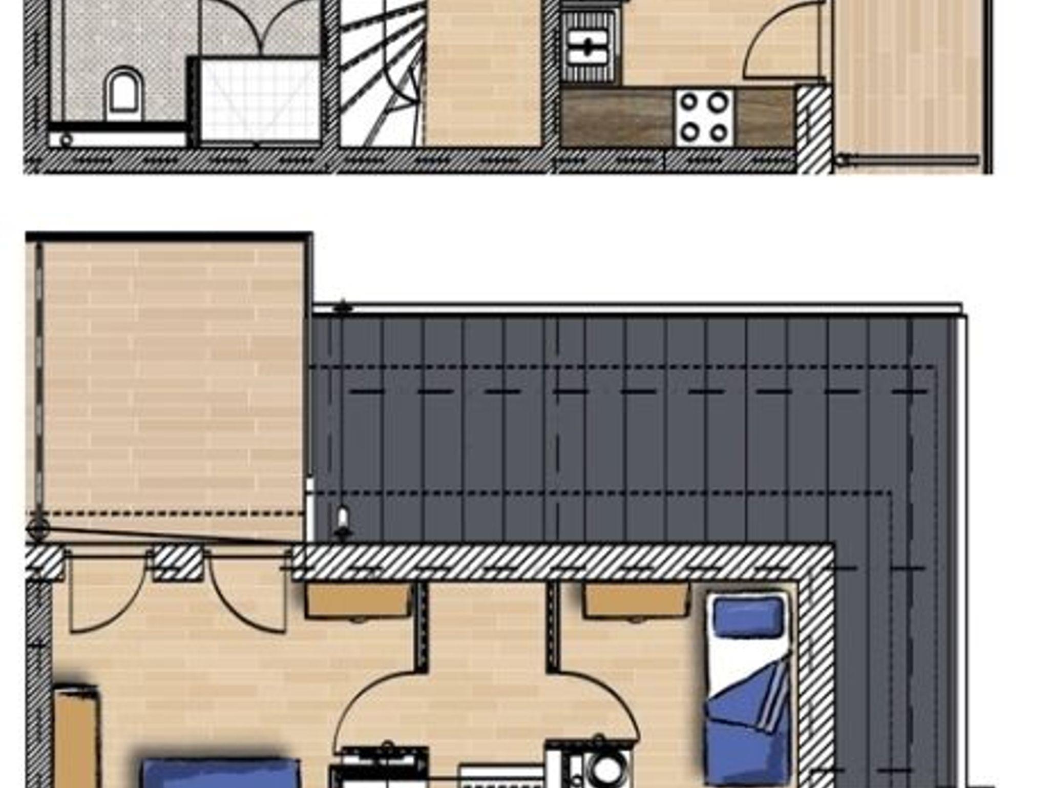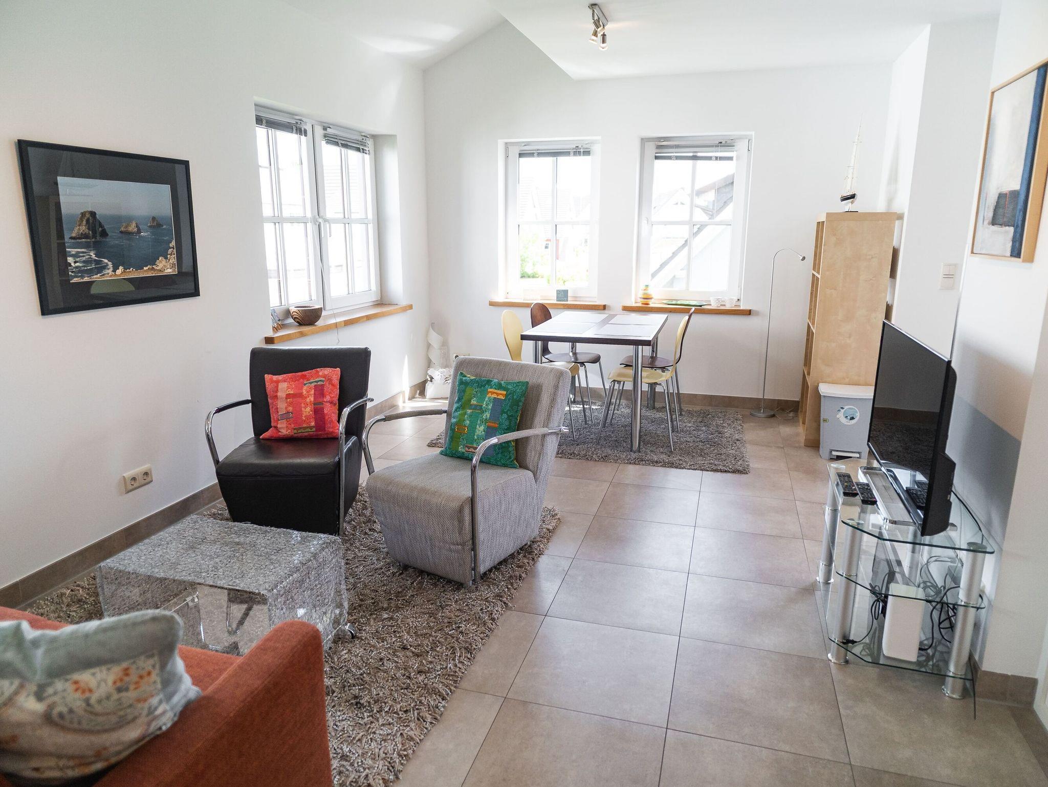 Das offene Wohn-/ Esszimmer empfängt Sie mit einer gemütlichen Sitzecke und farbenfrohen Akzenten. Die Couch kann zum Schlafen ausklappt werden (140 x 200 cm) und bietet Platz für eine vierte Person. Zudem erwarten Sie ein großes Schlafzimmer mit Doppelbett sowie ein kleines Schlafzimmer mit Einzelbett und geräumigen Kleiderschränken im Dachgeschoss der Unterkunft. Der große Esstisch im Wohnraum lädt neben gemeinsamen Mahlzeiten auch zu geselligen Spieleabenden ein. Ein Flatscreen-TV und ein Musikradio gehören zum technischen Zubehör des Raums.