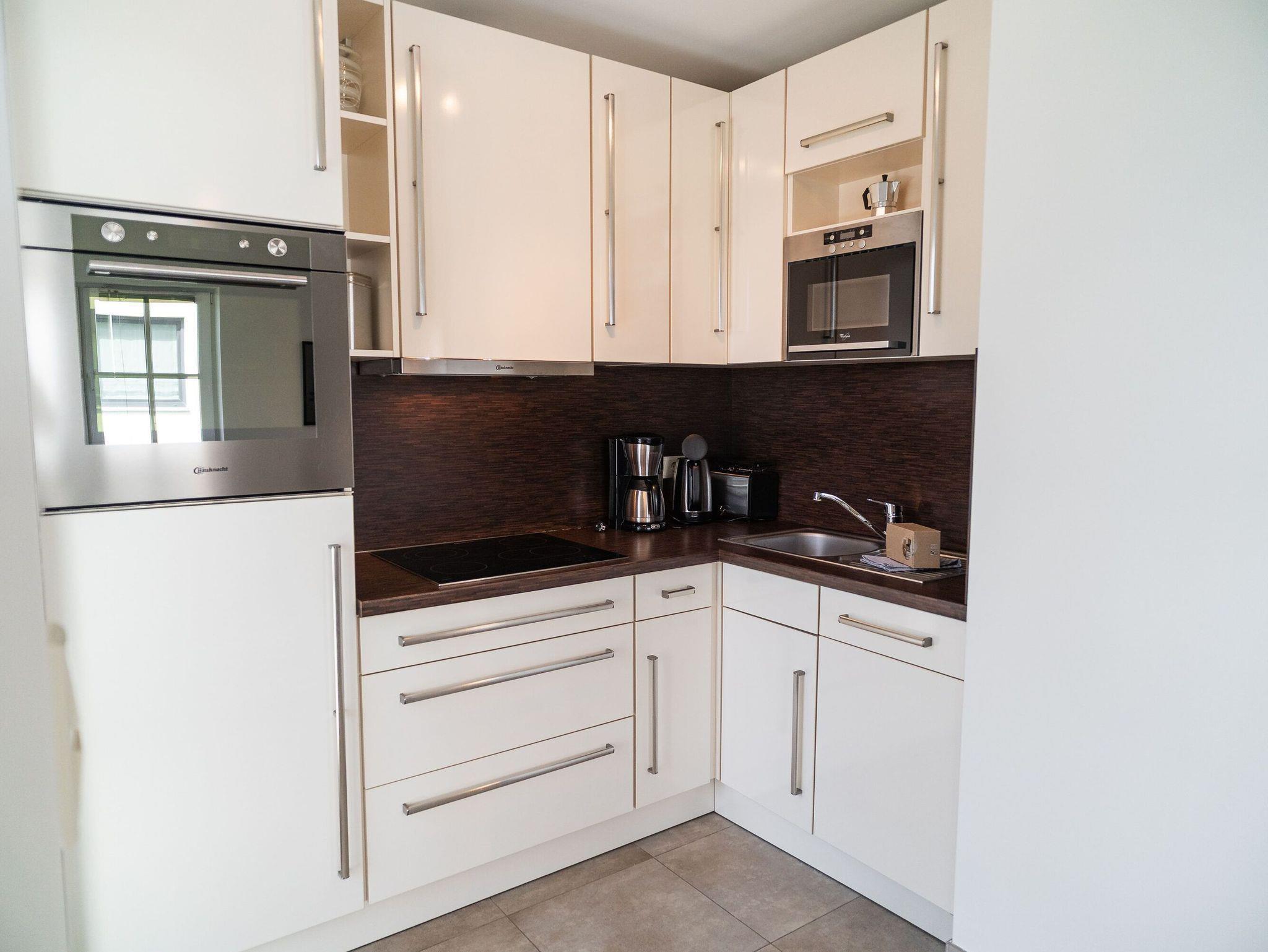 Damit Sie für Ihren Urlaub bestens versorgt sind, bietet die Ferienwohnung viele Annehmlichkeiten. Die integrierte Einbauküche ist rundum ausgestattet mit Geschirrspüler, Kühl-/Gefrierkombi, Ceranfeld, Backofen, Kaffeemaschine, Wasserkocher, Toaster sowie den erforderlichen Küchenutensilien. Das Badezimmer besticht mit einer ebenerdigen Dusche, einer Waschmaschine und einem Trockner. Ein kleiner separater Abstellraum bietet weiterhin Platz für Ihre Koffer und andere Mitbringsel. Für Ausflüge zu den Golfplätzen der Umgebung stehen zudem drei Golfsets zur Verfügung.