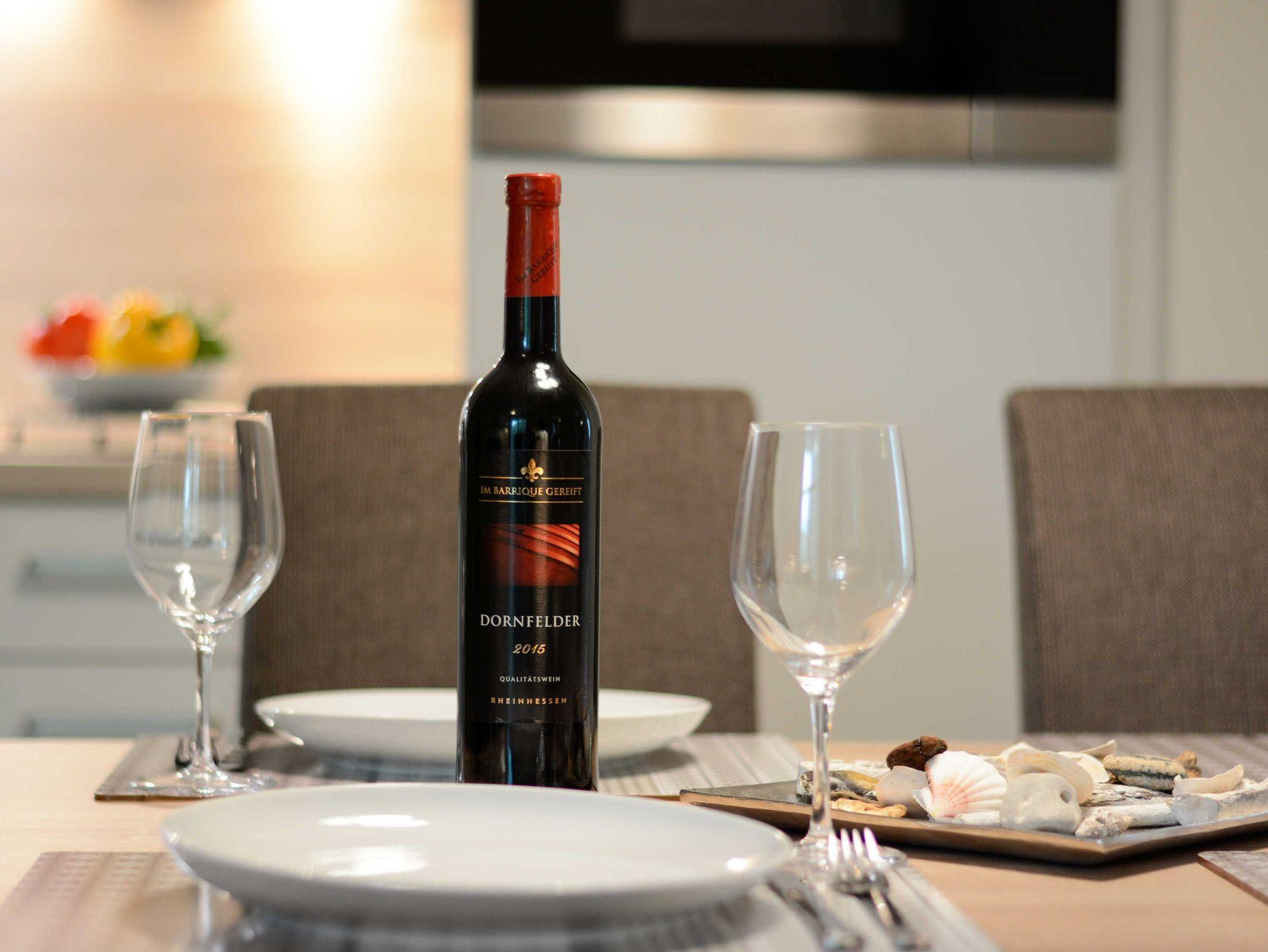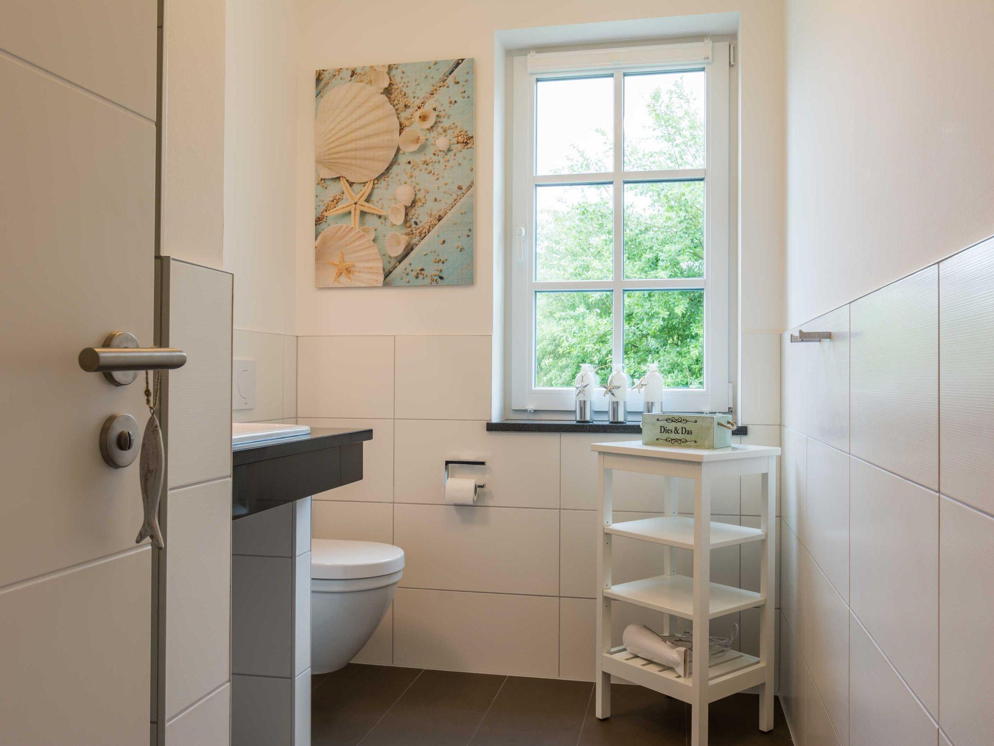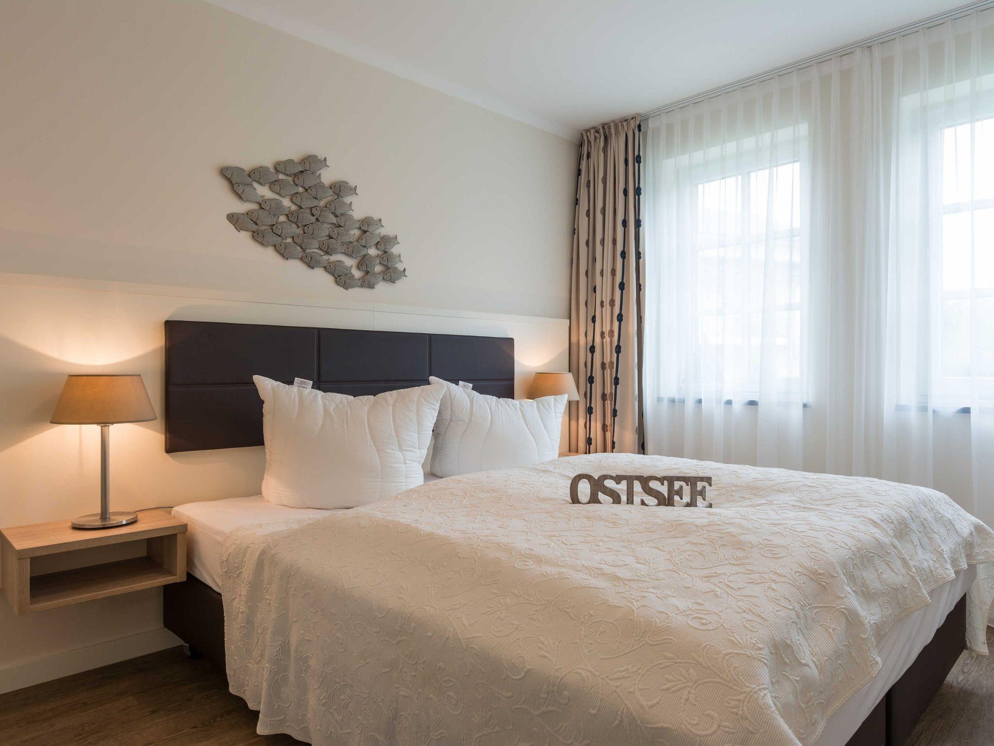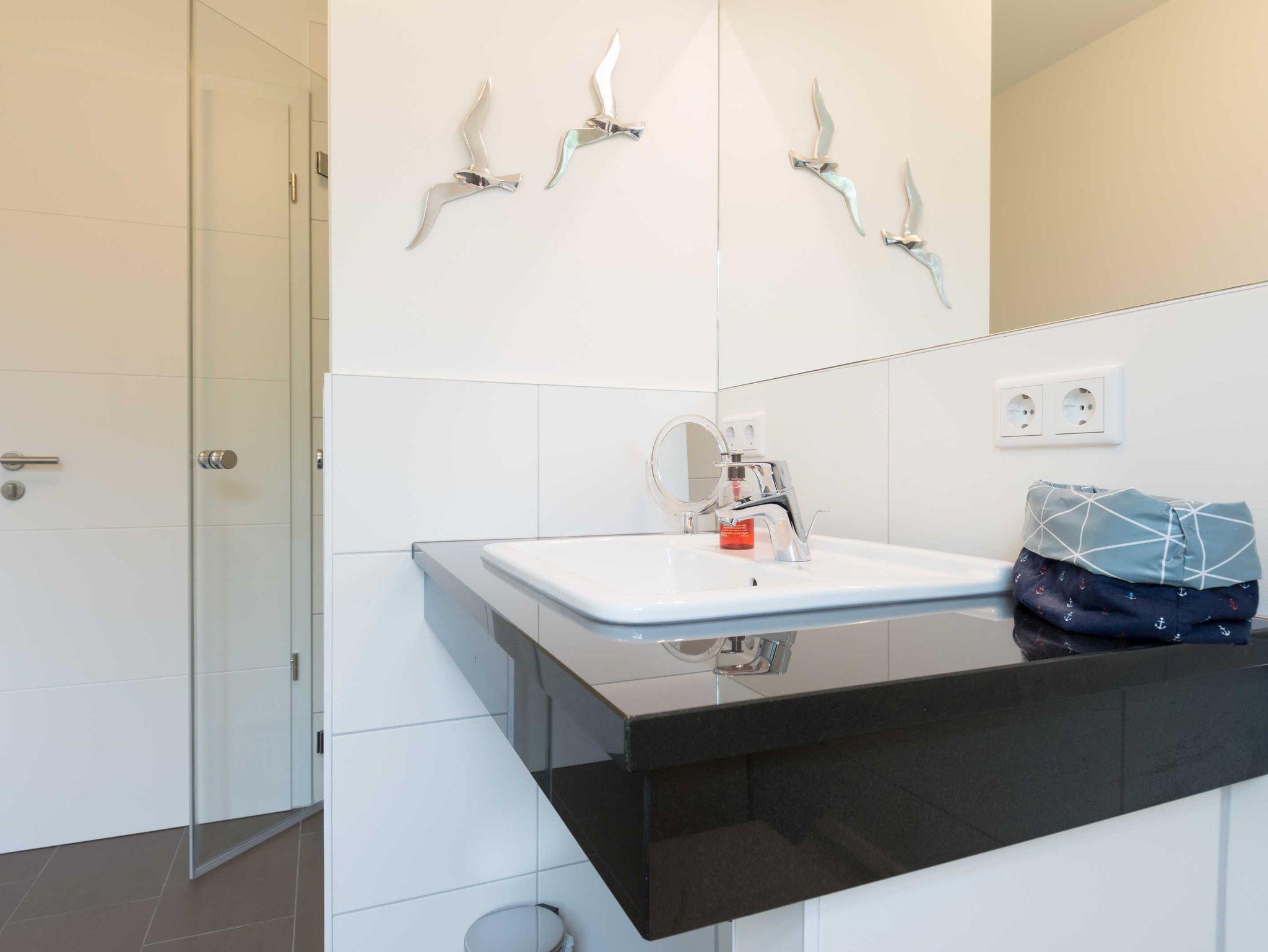 Der Wohnbereich ist modern und zeitlos im maritimen Stil ausgestattet und verfügt über eine gemütliche Schlafcouch inkl. Sessel und Hocker, einen Couchtisch, einen Esstisch mit 4 Stühlen sowie einen LED-TV, einen DVD-Player und eine Musikanlage. Im großen Schlafzimmer finden Sie neben einem weiteren LED-TV ein komfortables BoxSpringbett (1,80 x 2,00 m mit zwei einzelnen Matratzen) und einen geräumigen Kleiderschrank vor. Das kleinere Schlafzimmer ist mit einer Schlafcouch (1,50 x 2,00 m) und einen weiteren Kleiderschrank ausgestattet. Die hochwertige Einbauküche lässt keine Wünsche offen. Sie verfügt über Geschirrspüler, Kühlschrank mit Gefrierfach, Kaffeemaschine, Nespressomaschine, Wasserkocher, Toaster, ausreichend Geschirr und Besteck, 2-Platten-Herd (Ceran) und eine Mikrowelle mit Grillfunktion. Das Badezimmer ist mit einer bodengleichen Dusche, einem großen Waschtisch, einem Fön, einem Wandspiegel und einem Fenster ausgestattet. An Herbst- und Wintertagen sorgt in allen Räumen eine Fußbodenheizung für Wärme und Gemütlichkeit. Auf der mit Tisch und vier Stühlen möblierten Terrasse (süd-westliche Ausrichtung) lassen sich gemütliche Sonnen- und Abendstunden verbringen.