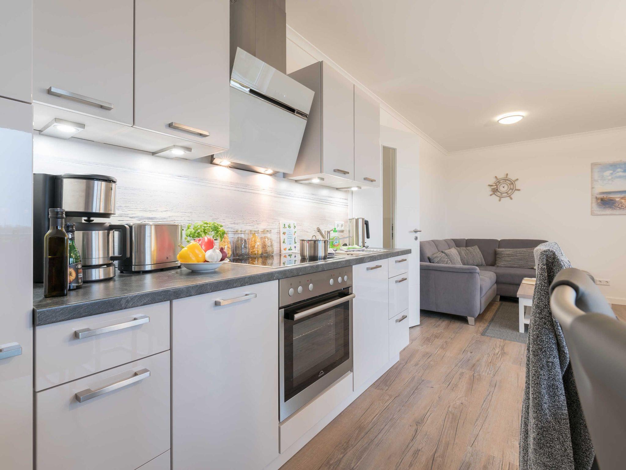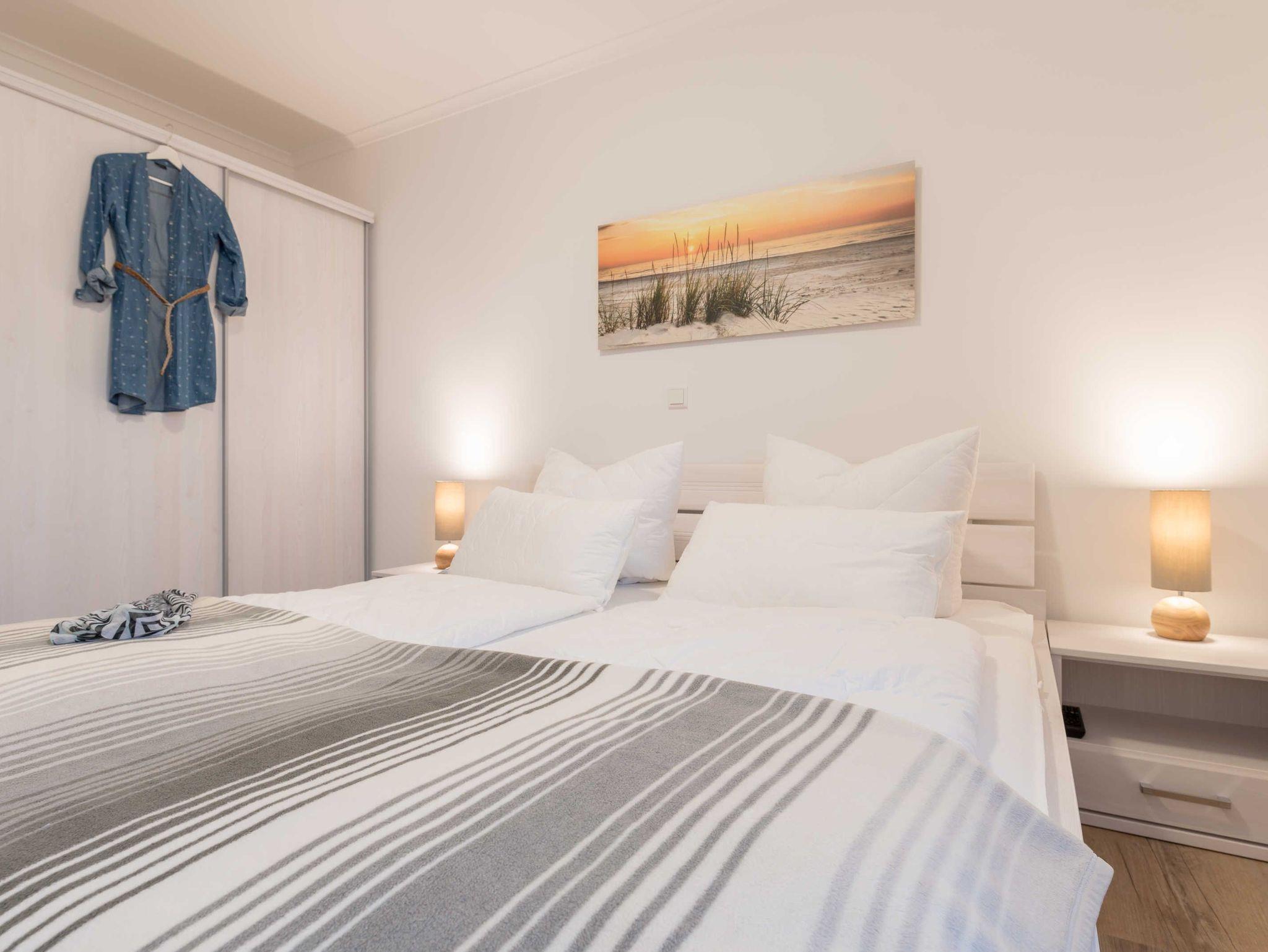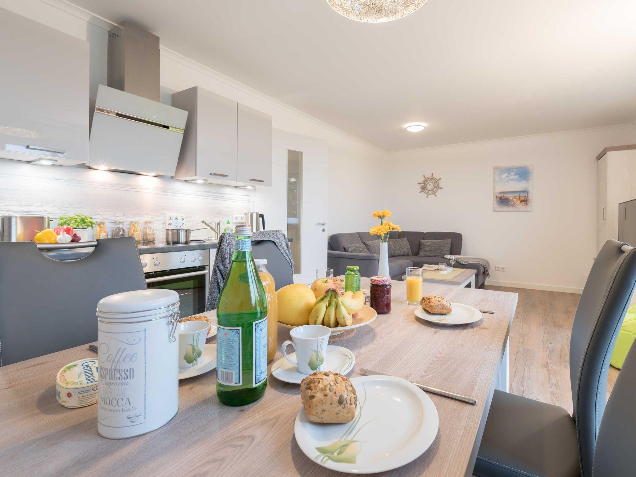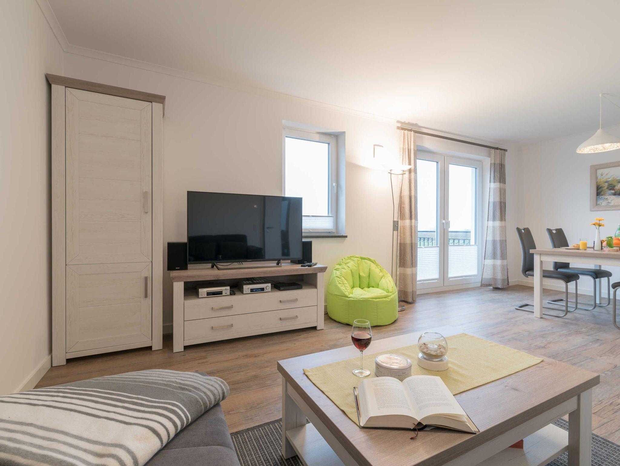 Die im maritimen Stil eingerichtete 3-Zimmer Wohnung besteht aus großzügigem Schlafzimmer, einem zweiten Schlafraum, einem kombiniertem Wohn-Esszimmer mit offener Einbauküche, einem Bad mit ebenerdiger Dusche sowie einem Abstellraum. Im hell eingerichteten Wohnzimmer laden eine gemütliche Couch sowie ein großer Esstisch, der vier Personen bequem Platz bietet, zum Verweilen ein. Die bodentiefen Fensterelemente sorgen für lichtdurchfluteten Wohngenuss und bieten Zugang zum Balkon. Die Fußbodenheizung und die einstellbare Lüftung sorgen in allen Jahreszeiten für ein angenehmes Raumklima und Gemütlichkeit. Weiterhin verfügt die Ferienwohnung über zwei separate Schlafräume. Im größeren Schlafzimmer stehen ein Doppelbett (1,90 m x 2,00 m) und ein geräumiger Kleiderschrank. Im zweiten Schlafzimmer befinden sich ein Duobett mit ausziehbarem Unterbett (0,90 m x 2,00 m) sowie ein weiterer Kleiderschrank. Die Flatscreen-TV´s in Wohn- und Schlafzimmer, ein Blu-Ray-Player und eine Stereo-Anlage gehören zur modernen Ausstattung dieser Ferienwohnung. Die Einbauküche verfügt über einen Geschirrspüler, einen Kühlschrank mit Gefrierfach, einen Backofen, ein Cerankochfeld, eine Mikrowelle, einen Toaster, eine Kaffeemaschine, einen Wasserkocher und vom Kochtopf bis zum Eierbecher über eine komplette Küchenausstattung. Das helle Badezimmer mit Fenster und ebenerdiger Dusche ist ausgestattet mit einem Waschtisch inklusive großem Spiegel, einem Haartrockner und Abstellmöglichkeiten für Ihre Waschutensilien. Im Abstellraum der Wohnung finden Sie eine Waschmaschine (4 kg), ein Wäschegestell, einen Staubsauger und haben Platz zur Lagerung.