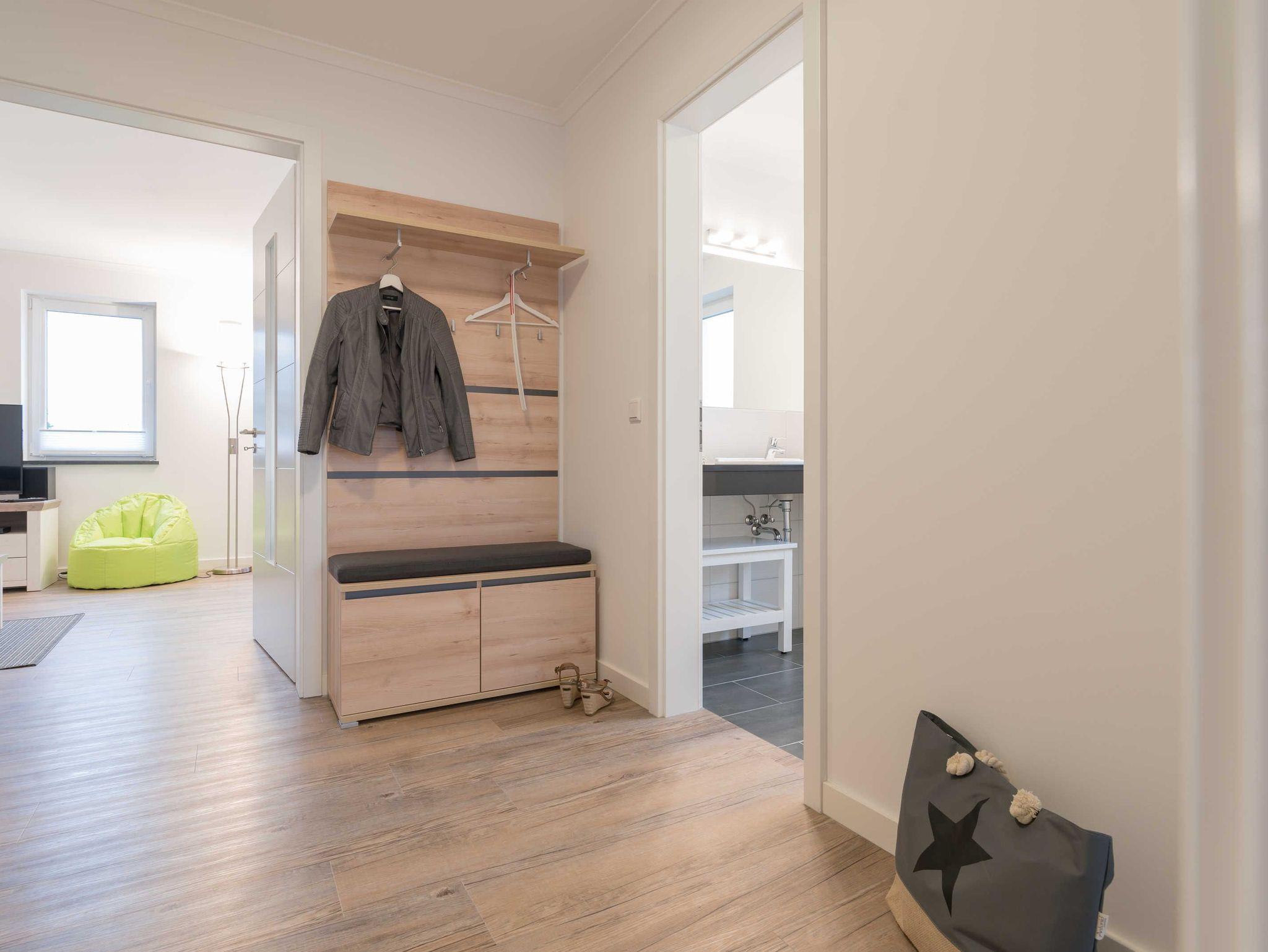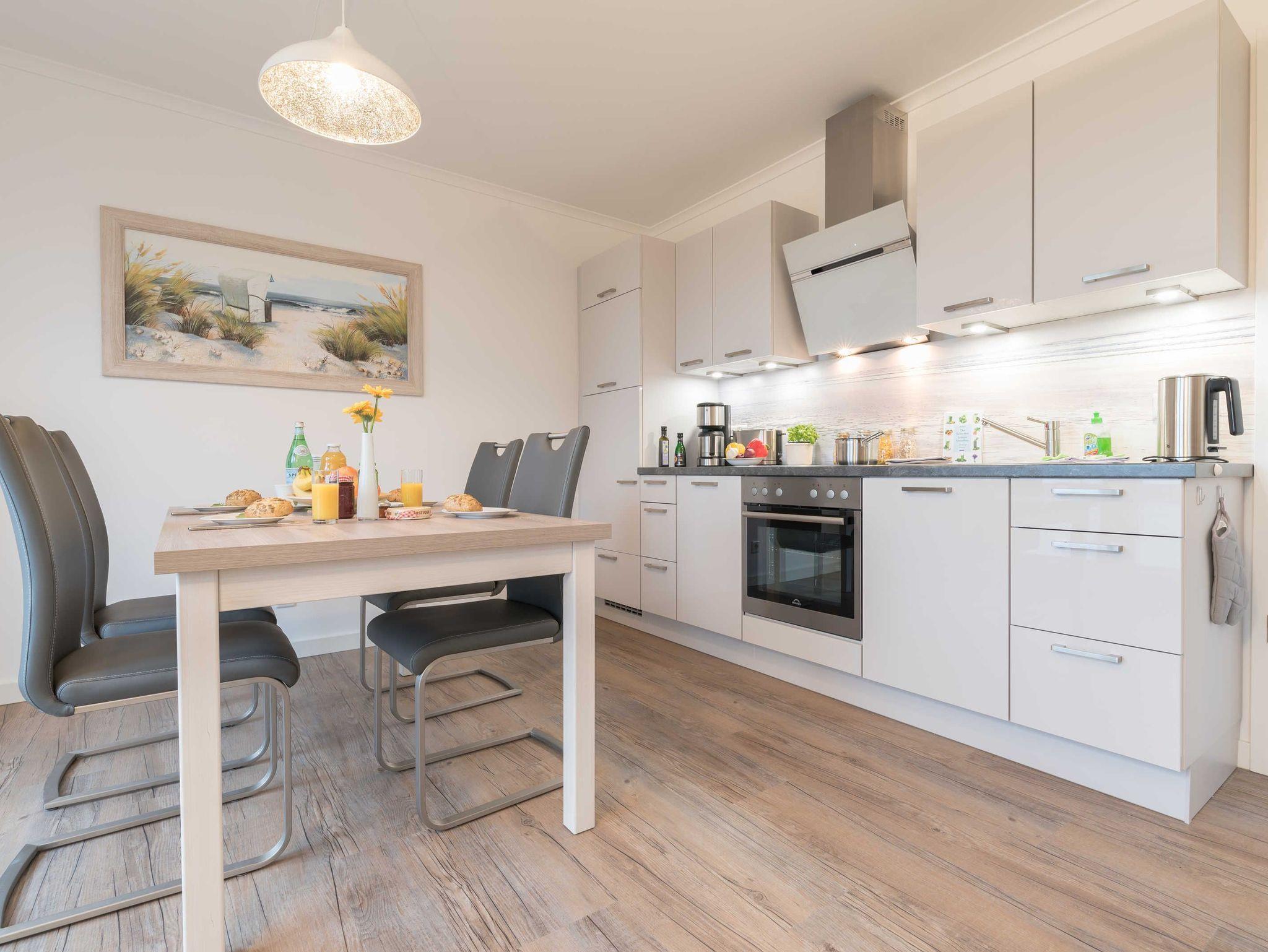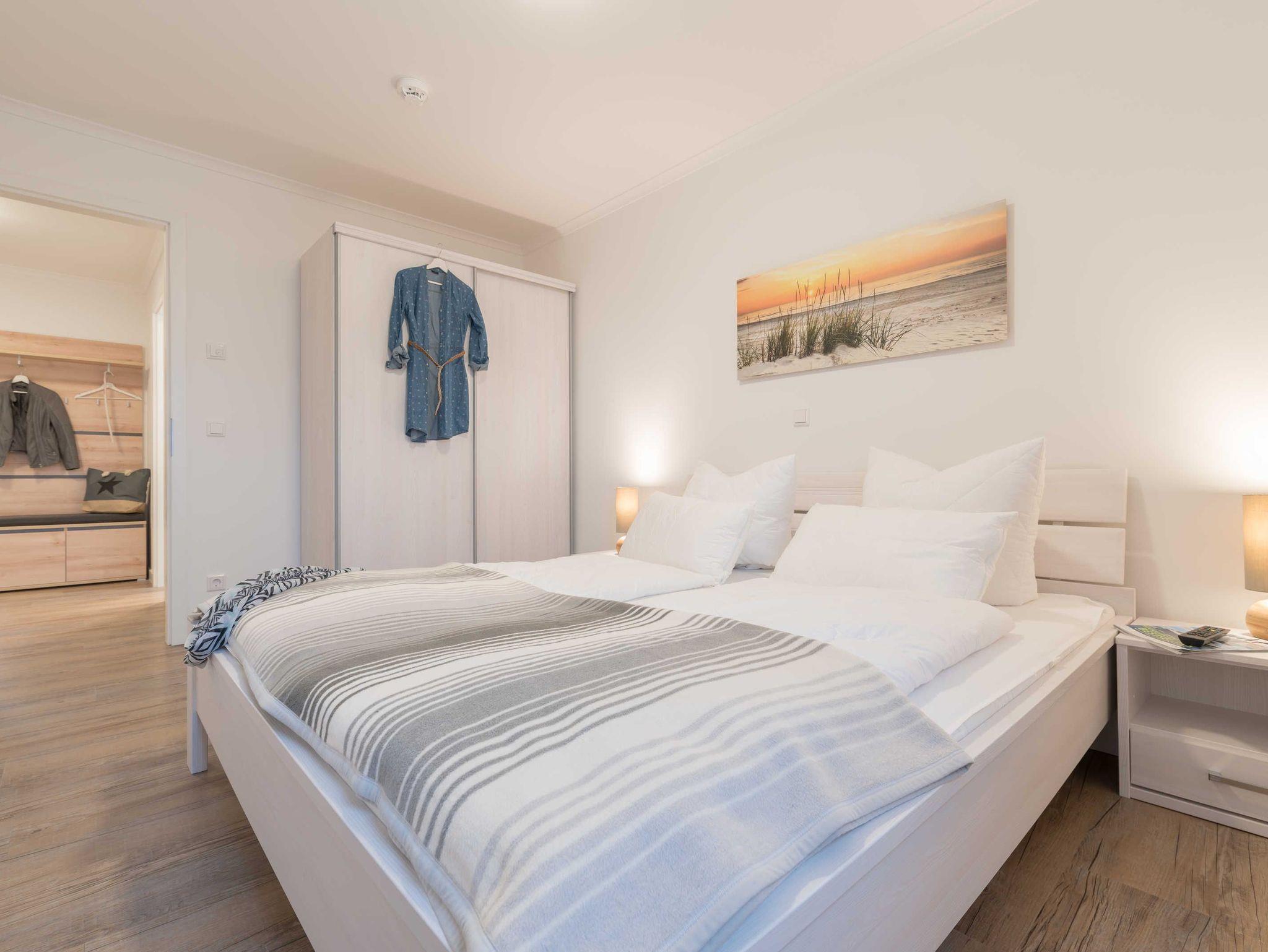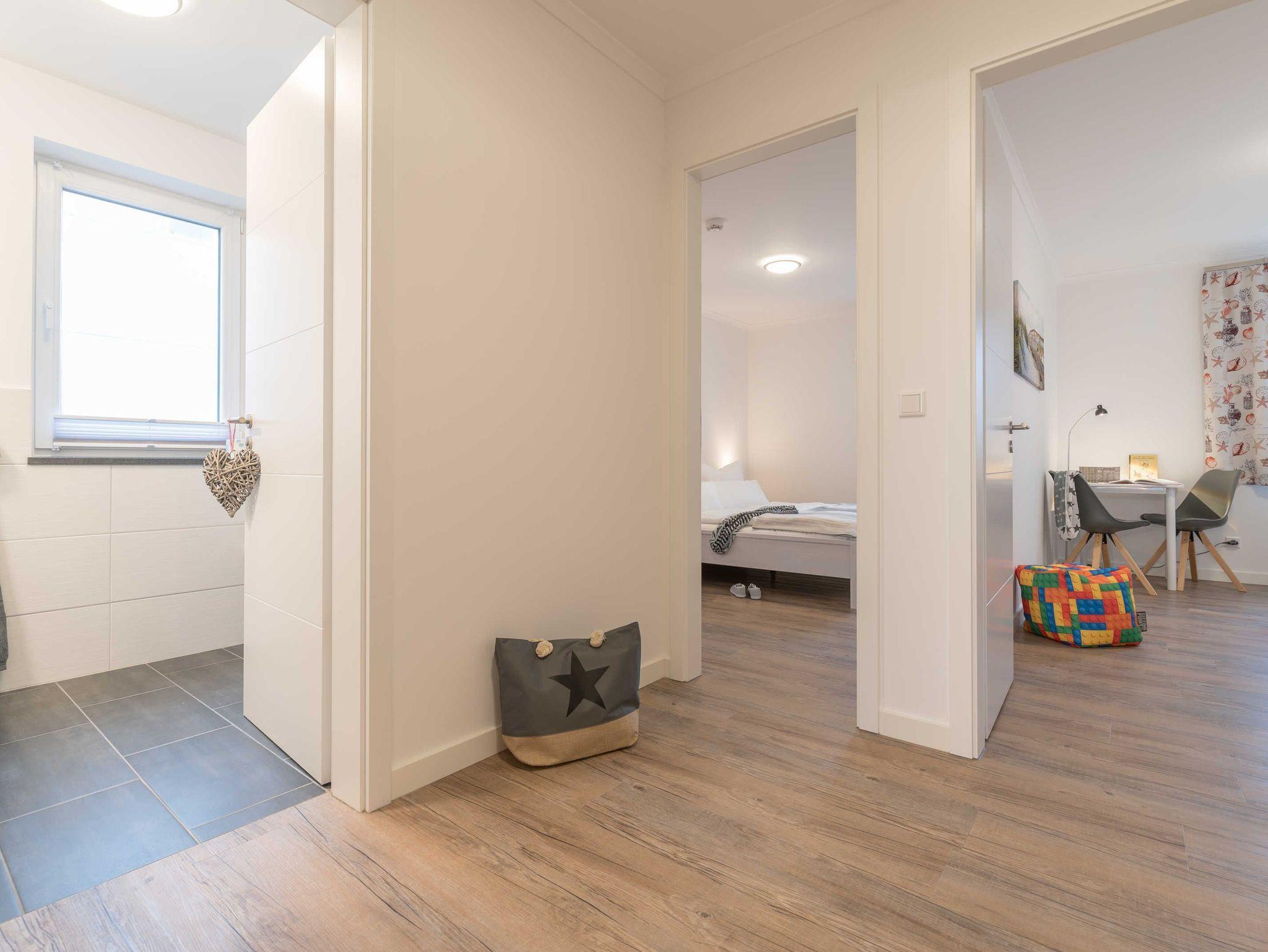 Die im maritimen Stil eingerichtete 3-Zimmer Wohnung besteht aus großzügigem Schlafzimmer, einem zweiten Schlafraum, einem kombiniertem Wohn-Esszimmer mit offener Einbauküche, einem Bad mit ebenerdiger Dusche sowie einem Abstellraum. Im hell eingerichteten Wohnzimmer laden eine gemütliche Couch sowie ein großer Esstisch, der vier Personen bequem Platz bietet, zum Verweilen ein. Die bodentiefen Fensterelemente sorgen für lichtdurchfluteten Wohngenuss und bieten Zugang zum Balkon. Die Fußbodenheizung und die einstellbare Lüftung sorgen in allen Jahreszeiten für ein angenehmes Raumklima und Gemütlichkeit. Weiterhin verfügt die Ferienwohnung über zwei separate Schlafräume. Im größeren Schlafzimmer stehen ein Doppelbett (1,90 m x 2,00 m) und ein geräumiger Kleiderschrank. Im zweiten Schlafzimmer befinden sich ein Duobett mit ausziehbarem Unterbett (0,90 m x 2,00 m) sowie ein weiterer Kleiderschrank. Die Flatscreen-TV´s in Wohn- und Schlafzimmer, ein Blu-Ray-Player und eine Stereo-Anlage gehören zur modernen Ausstattung dieser Ferienwohnung. Die Einbauküche verfügt über einen Geschirrspüler, einen Kühlschrank mit Gefrierfach, einen Backofen, ein Cerankochfeld, eine Mikrowelle, einen Toaster, eine Kaffeemaschine, einen Wasserkocher und vom Kochtopf bis zum Eierbecher über eine komplette Küchenausstattung. Das helle Badezimmer mit Fenster und ebenerdiger Dusche ist ausgestattet mit einem Waschtisch inklusive großem Spiegel, einem Haartrockner und Abstellmöglichkeiten für Ihre Waschutensilien. Im Abstellraum der Wohnung finden Sie eine Waschmaschine (4 kg), ein Wäschegestell, einen Staubsauger und haben Platz zur Lagerung.