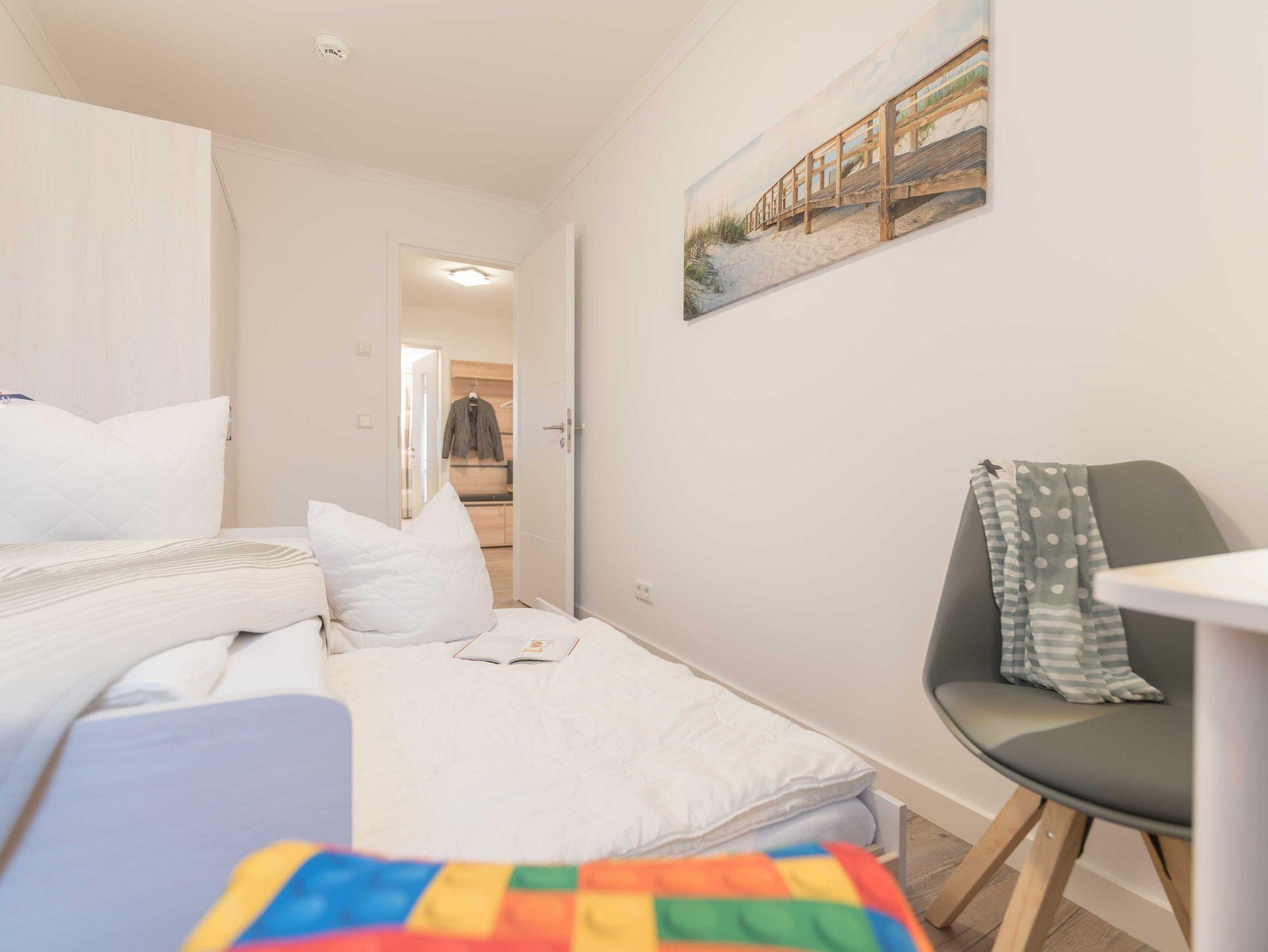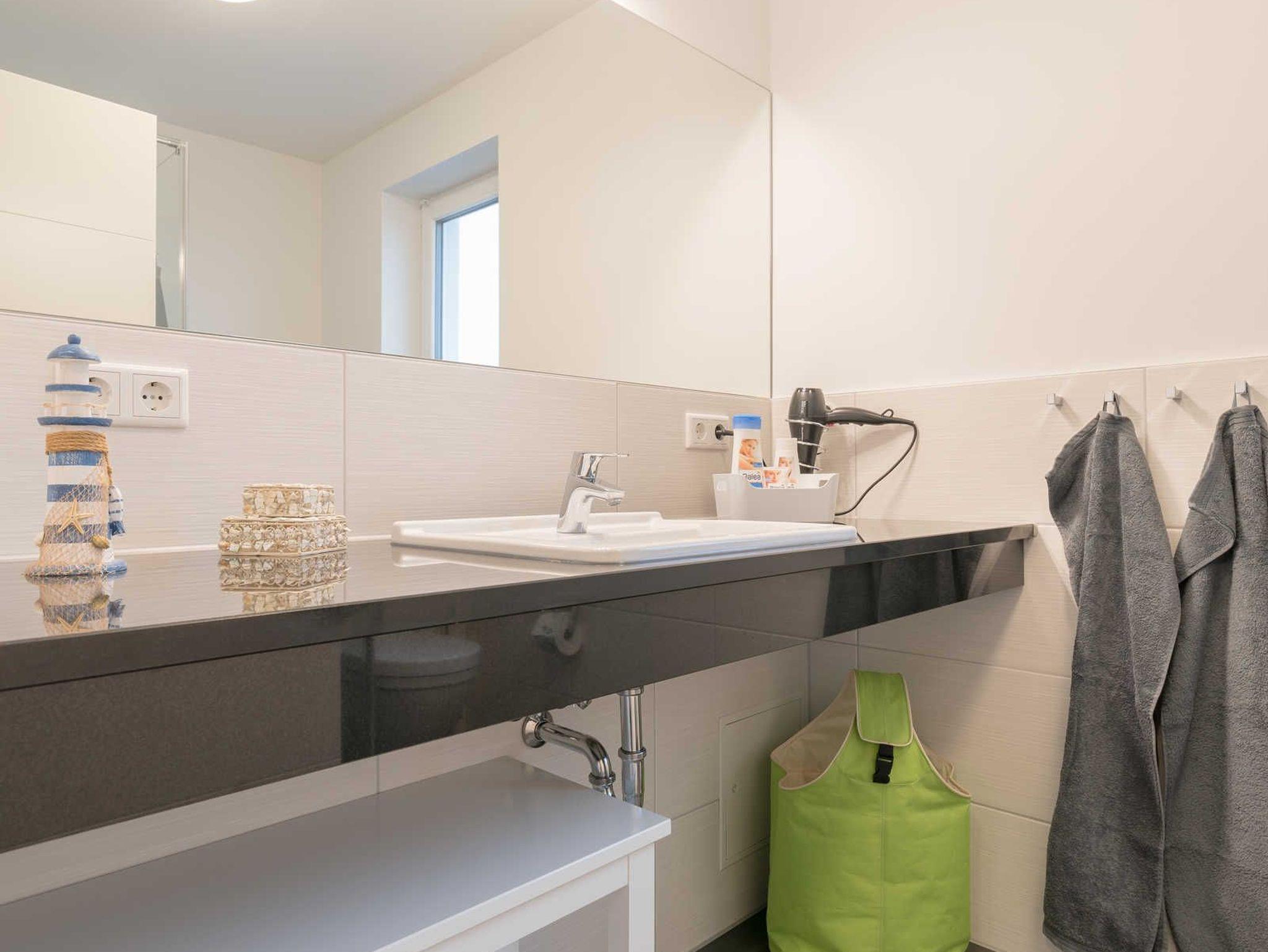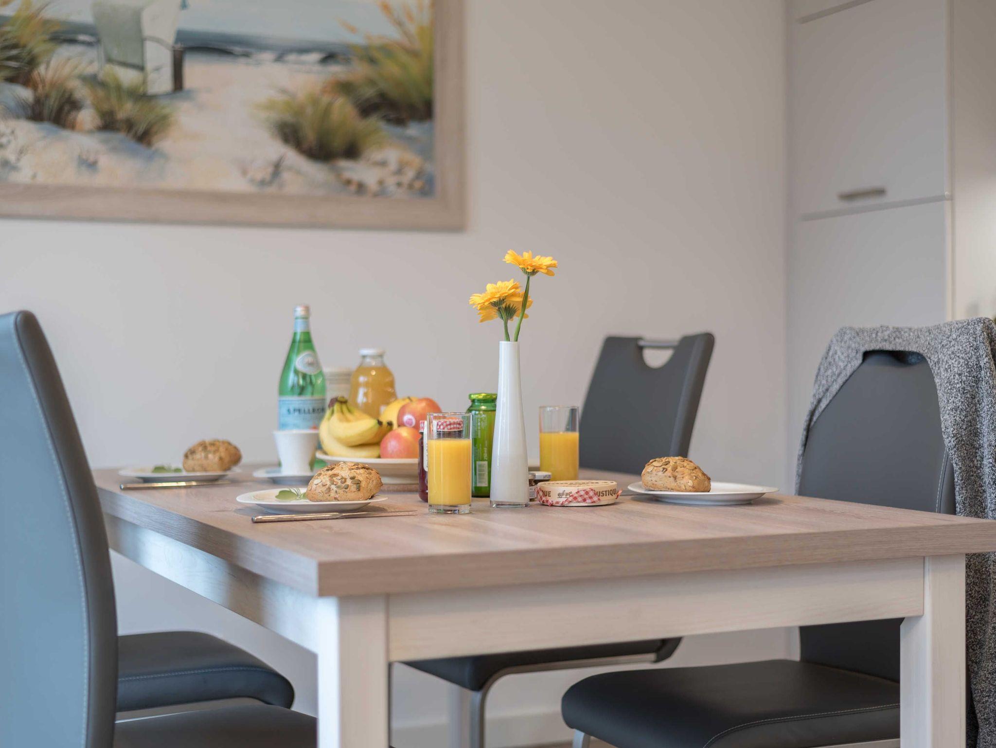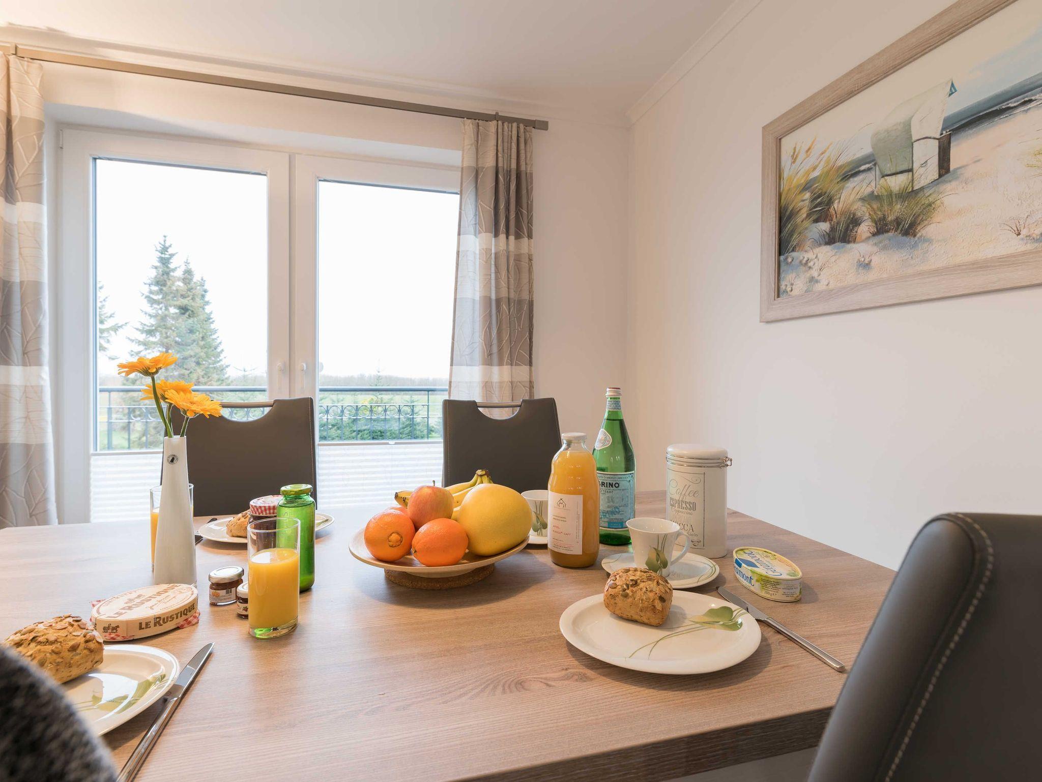 Die im maritimen Stil eingerichtete 3-Zimmer Wohnung besteht aus großzügigem Schlafzimmer, einem zweiten Schlafraum, einem kombiniertem Wohn-Esszimmer mit offener Einbauküche, einem Bad mit ebenerdiger Dusche sowie einem Abstellraum. Im hell eingerichteten Wohnzimmer laden eine gemütliche Couch sowie ein großer Esstisch, der vier Personen bequem Platz bietet, zum Verweilen ein. Die bodentiefen Fensterelemente sorgen für lichtdurchfluteten Wohngenuss und bieten Zugang zum Balkon. Die Fußbodenheizung und die einstellbare Lüftung sorgen in allen Jahreszeiten für ein angenehmes Raumklima und Gemütlichkeit. Weiterhin verfügt die Ferienwohnung über zwei separate Schlafräume. Im größeren Schlafzimmer stehen ein Doppelbett (1,90 m x 2,00 m) und ein geräumiger Kleiderschrank. Im zweiten Schlafzimmer befinden sich ein Duobett mit ausziehbarem Unterbett (0,90 m x 2,00 m) sowie ein weiterer Kleiderschrank. Die Flatscreen-TV´s in Wohn- und Schlafzimmer, ein Blu-Ray-Player und eine Stereo-Anlage gehören zur modernen Ausstattung dieser Ferienwohnung. Die Einbauküche verfügt über einen Geschirrspüler, einen Kühlschrank mit Gefrierfach, einen Backofen, ein Cerankochfeld, eine Mikrowelle, einen Toaster, eine Kaffeemaschine, einen Wasserkocher und vom Kochtopf bis zum Eierbecher über eine komplette Küchenausstattung. Das helle Badezimmer mit Fenster und ebenerdiger Dusche ist ausgestattet mit einem Waschtisch inklusive großem Spiegel, einem Haartrockner und Abstellmöglichkeiten für Ihre Waschutensilien. Im Abstellraum der Wohnung finden Sie eine Waschmaschine (4 kg), ein Wäschegestell, einen Staubsauger und haben Platz zur Lagerung.