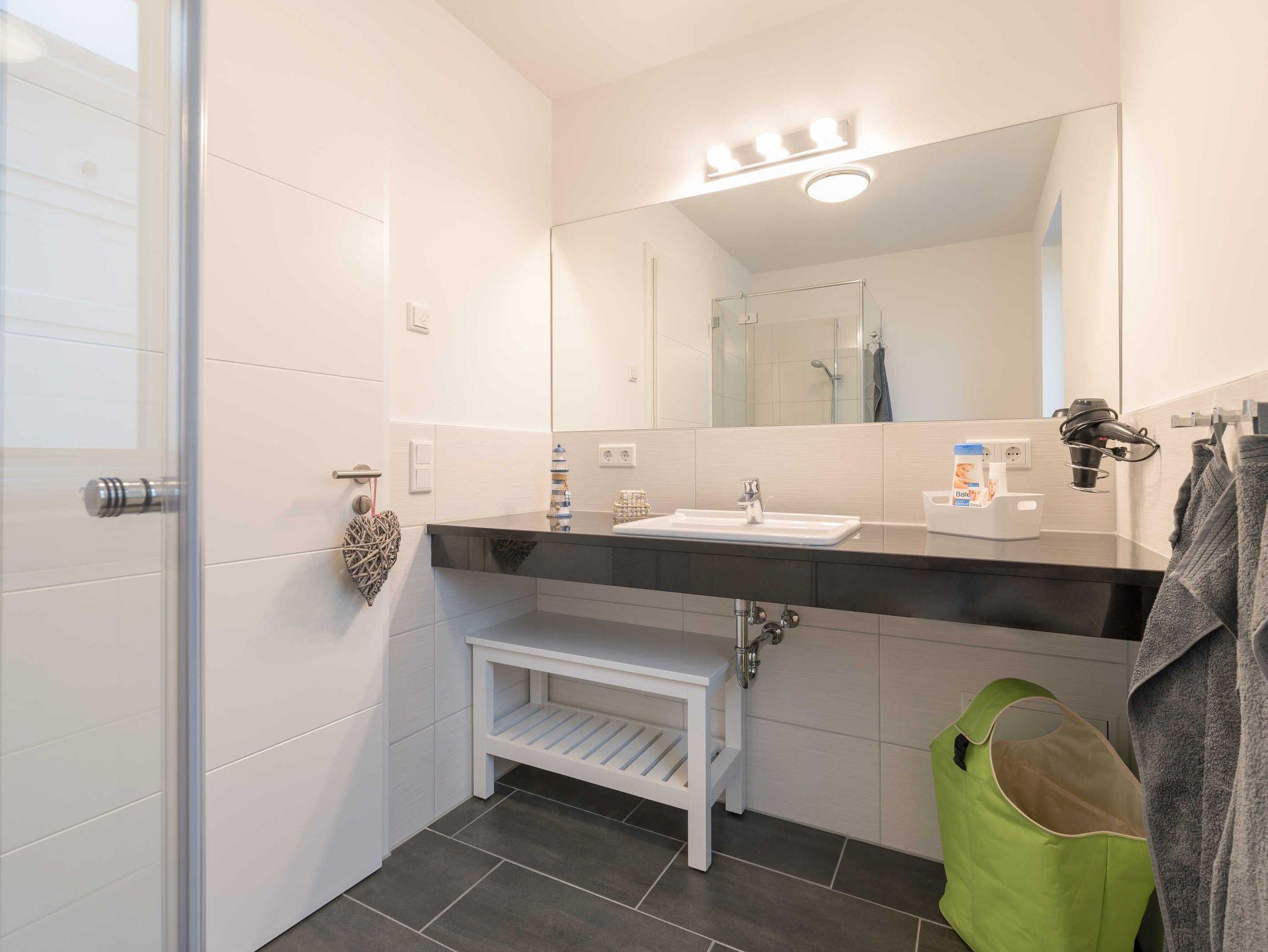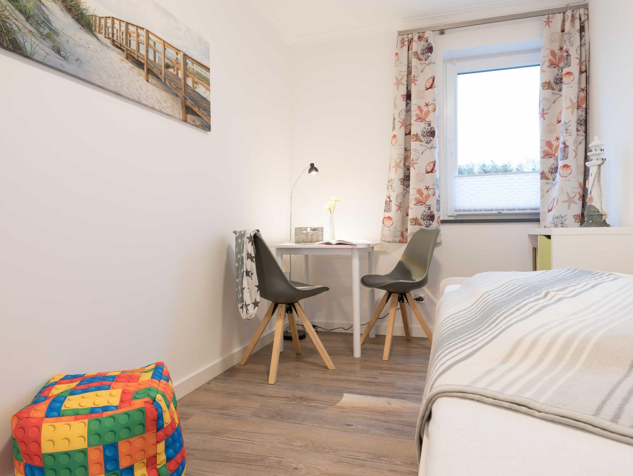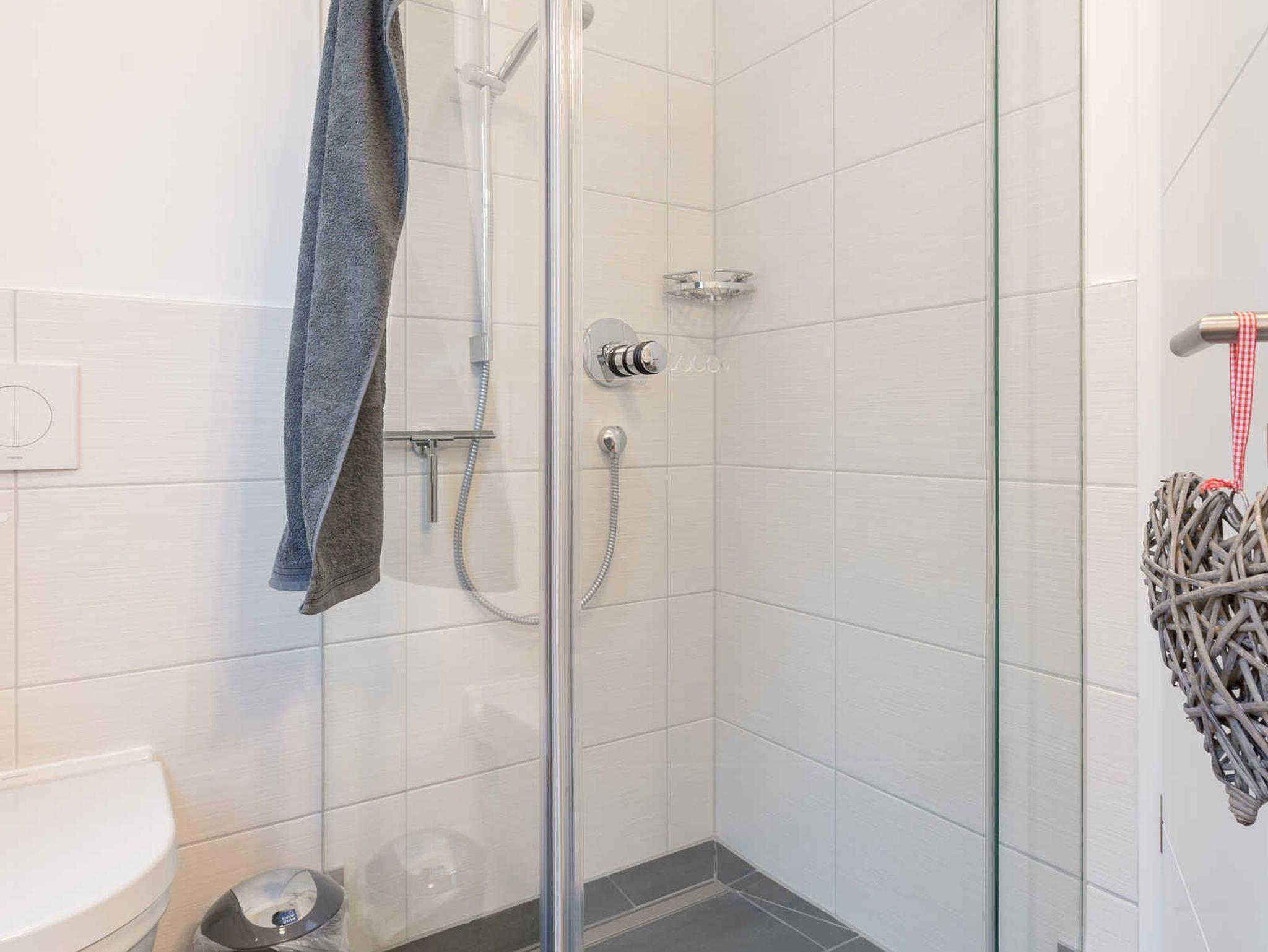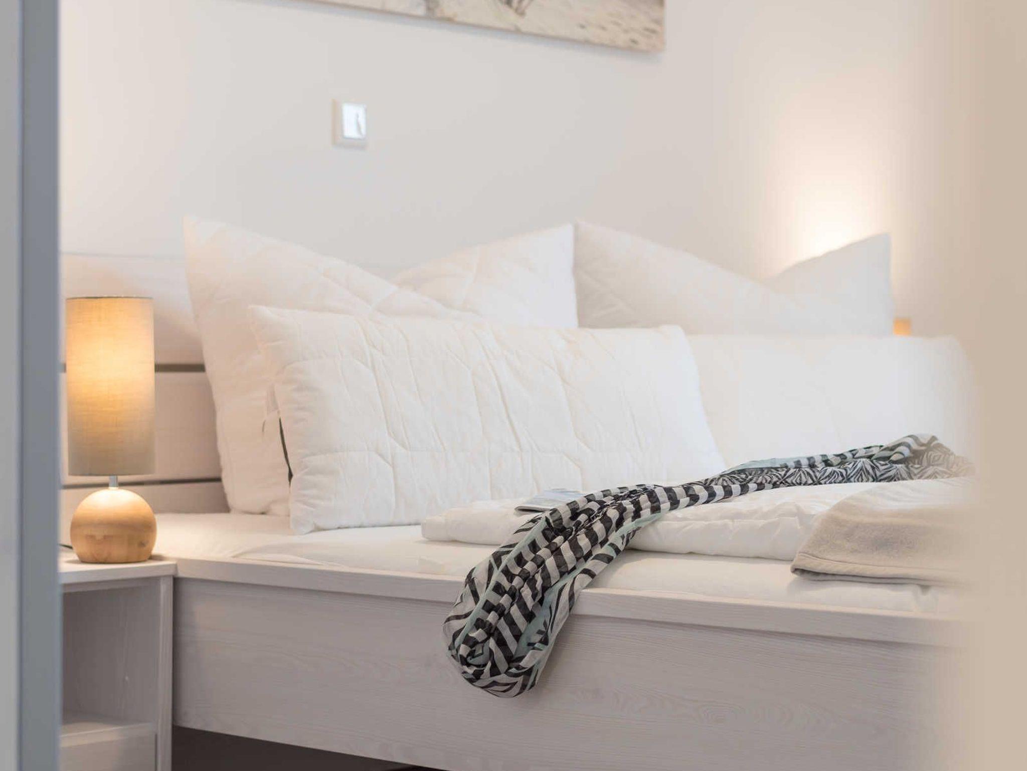 Die im maritimen Stil eingerichtete 3-Zimmer Wohnung besteht aus großzügigem Schlafzimmer, einem zweiten Schlafraum, einem kombiniertem Wohn-Esszimmer mit offener Einbauküche, einem Bad mit ebenerdiger Dusche sowie einem Abstellraum. Im hell eingerichteten Wohnzimmer laden eine gemütliche Couch sowie ein großer Esstisch, der vier Personen bequem Platz bietet, zum Verweilen ein. Die bodentiefen Fensterelemente sorgen für lichtdurchfluteten Wohngenuss und bieten Zugang zum Balkon. Die Fußbodenheizung und die einstellbare Lüftung sorgen in allen Jahreszeiten für ein angenehmes Raumklima und Gemütlichkeit. Weiterhin verfügt die Ferienwohnung über zwei separate Schlafräume. Im größeren Schlafzimmer stehen ein Doppelbett (1,90 m x 2,00 m) und ein geräumiger Kleiderschrank. Im zweiten Schlafzimmer befinden sich ein Duobett mit ausziehbarem Unterbett (0,90 m x 2,00 m) sowie ein weiterer Kleiderschrank. Die Flatscreen-TV´s in Wohn- und Schlafzimmer, ein Blu-Ray-Player und eine Stereo-Anlage gehören zur modernen Ausstattung dieser Ferienwohnung. Die Einbauküche verfügt über einen Geschirrspüler, einen Kühlschrank mit Gefrierfach, einen Backofen, ein Cerankochfeld, eine Mikrowelle, einen Toaster, eine Kaffeemaschine, einen Wasserkocher und vom Kochtopf bis zum Eierbecher über eine komplette Küchenausstattung. Das helle Badezimmer mit Fenster und ebenerdiger Dusche ist ausgestattet mit einem Waschtisch inklusive großem Spiegel, einem Haartrockner und Abstellmöglichkeiten für Ihre Waschutensilien. Im Abstellraum der Wohnung finden Sie eine Waschmaschine (4 kg), ein Wäschegestell, einen Staubsauger und haben Platz zur Lagerung.