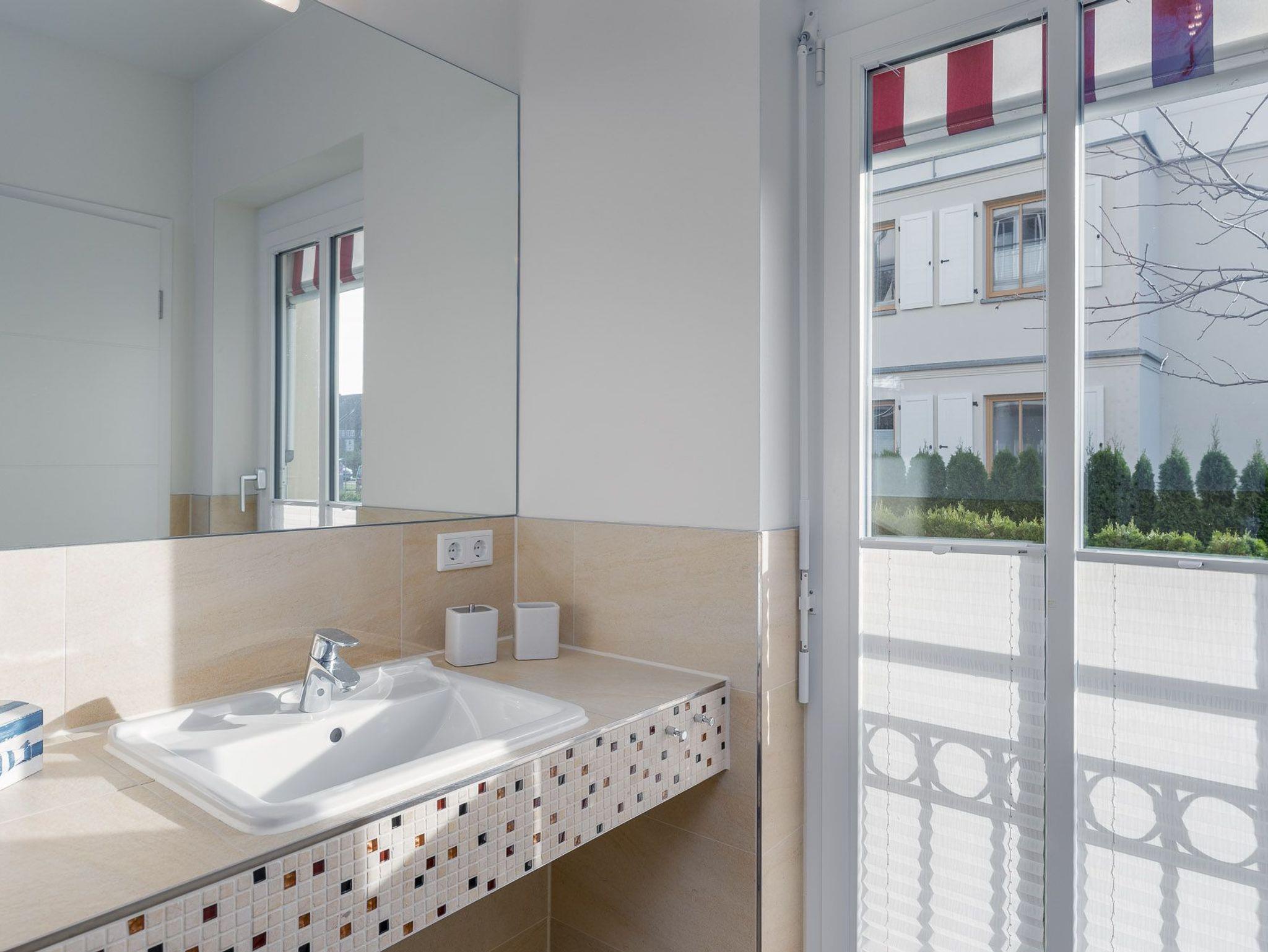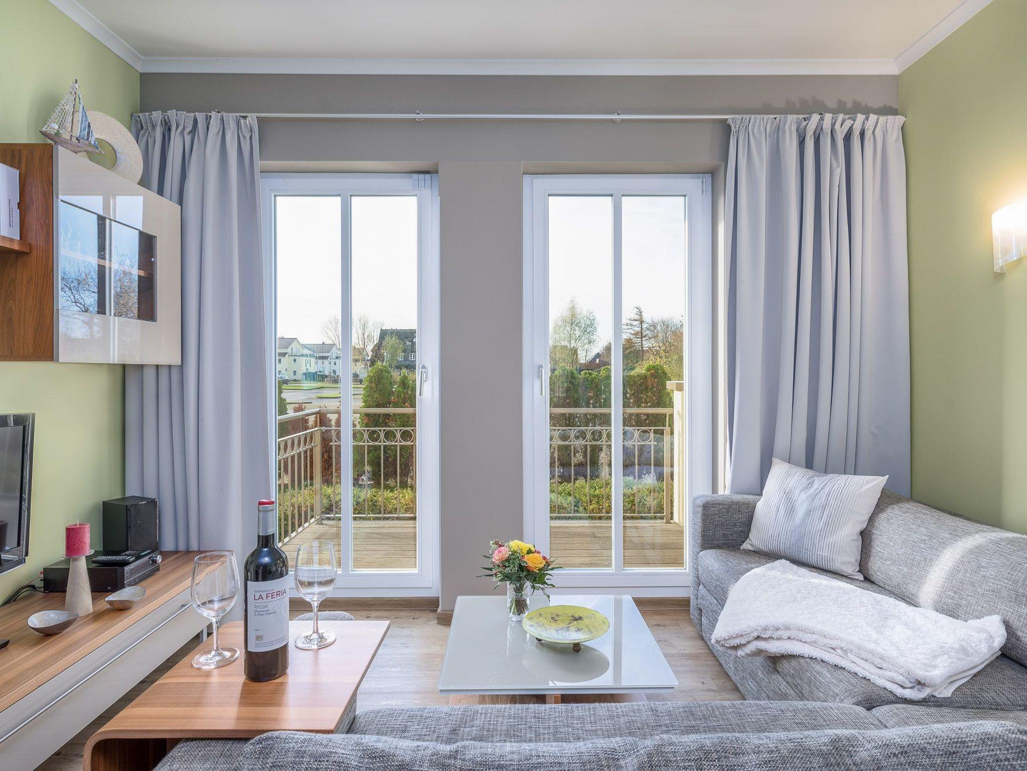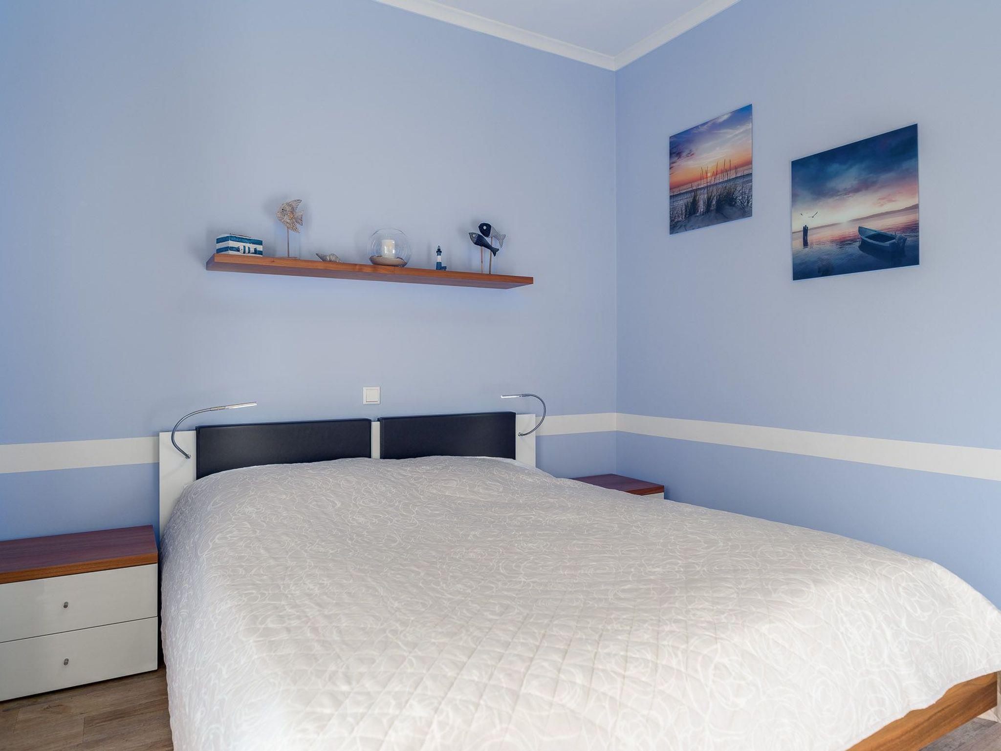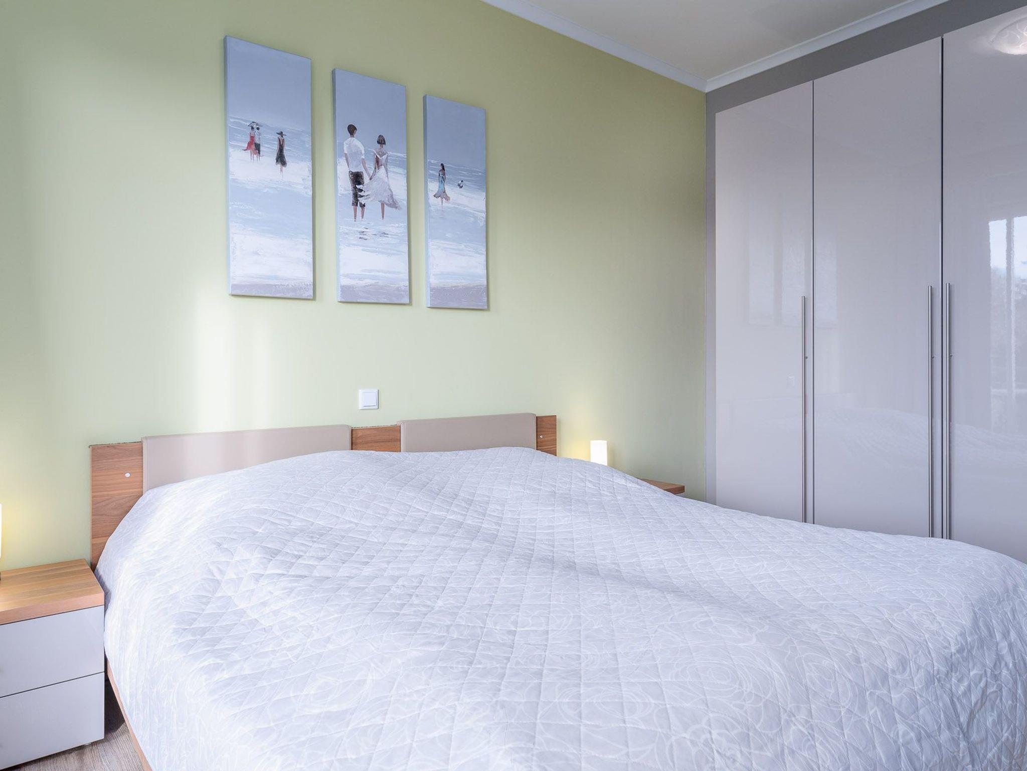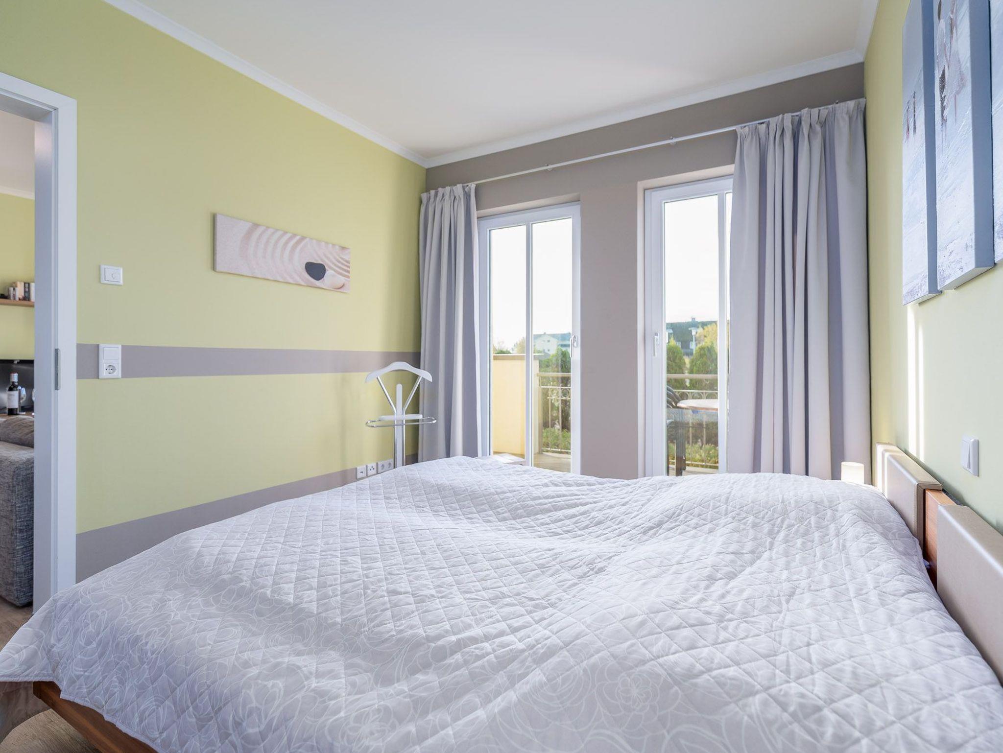 Es empfängt Sie ein heller und lichtdurchfluteter Wohn- und Essbereich. Das bequeme Ecksofa lädt zum Verweilen und Ausruhen ein. Ergänzt wird die Wohlfühlatmosphäre mit einem hyggeligen Kaminofen, einem TV-Gerät mit DVD-Player und einem CD-Radio. Holz für den Kamin kann nicht bereitgestellt werden. Bücher und Gesellschaftsspiele für ruhige Stunden sind ebenfalls vorhanden. Der großzügige Essbereich mit mehreren Stühlen und einer Sitzbank bietet ausreichend Raum zum gemeinsamen Essen und zum Spielen für bis zu sieben Personen. Den Zugang zum Balkon haben Sie über den Wohnbereich. Der Balkon hat eine ideale Süd-West-Ausrichtung. Hier können Sie den Tag bis zur Abendsonne genießen. Lauschen Sie bei einer guten Flasche Wein dem Rauschen des Meeres. Die Balkonmöbel dafür stehen bereit. Die separat gelegene und helle Küche verfügt über ein eigenes Fenster. Sie ist umfangreich ausgestattet mit Kühlschrank, inklusive Tiefkühlfach, Geschirrspüler, Backofen, Ceran-Kochfeld, Mikrowelle, Kaffeemaschine, Kaffeepad Maschine von Tassimo, Toaster sowie Wasserkocher. Es sollten in dieser Beziehung keine Wünsche offenbleiben. In einem der Schlafzimmer wurde ein raumhoher Kleiderschrank eingebaut. Beide Schlafräume verfügen über Doppelbetten (1,80 x 2,00/ 1,60 x 2,00/ beide mit getrennten Matratzen). Die eleganten Bäder präsentieren sich jeweils als Wohlfühloase mit großer, ebenerdiger Dusche und zusätzlicher Regenkopfbrause, Handtuchtrockner, Waschtisch, Föhn sowie weiteren Extras. Zusätzlich finden Sie einen kleinen Abstellraum mit Safe für Ihre Wertsachen in der Wohnung vor. Zur Unterkunft gehört ein kostenfreier Parkplatz direkt am Objekt. Ihre Fahrräder können Sie zudem in der Tiefgarage der Villa abstellen. Hier noch einige Hinweise: Es handelt sich um eine Nichtraucherwohnung. Es sind keine Haustiere erlaubt. Das kostenfreie WLAN in der Unterkunft ist ausschließlich für die Verwendung von Social Media und den Austausch von Bildern mit Familie und Freunden gedacht. Die Nutzung zum Streamen von Filmen ist nicht vorgesehen. Eine Waschmaschine und ein Trockner stehen im separaten Hauswirtschaftsraum im Untergeschoss der Villa zu Ihrer Verfügung (gegen Gebühr / 1,00 € Münzen). Wäschesets, Kinderreisebett und Kinderhochstuhl können kostenpflichtig zugebucht werden. Sichern Sie sich einen der begehrten Strandkörbe nur ein paar Meter entfernt von den rauschenden Wellen der Ostsee (Anfang Mai - Ende August) und buchen Sie jetzt zu besonderen Konditionen (12,00 € pro Tag oder 75,00 € pro Woche).