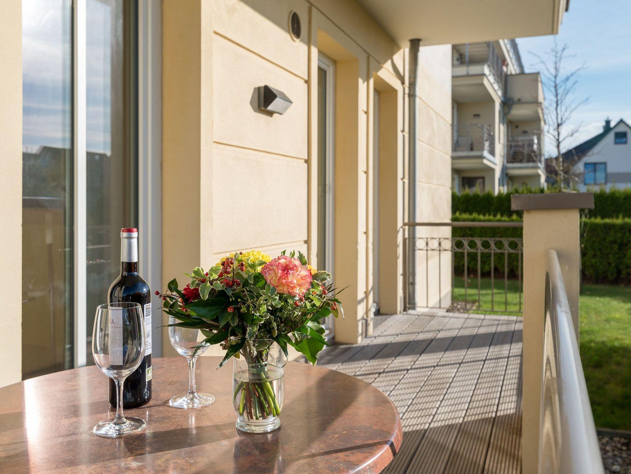 Strandnahe 3-Raumwohnung für max. 5 Erwachsene und 1 Kleinkind, 2 Bäder, 2 Schlafzimmer und Balkon im EG.