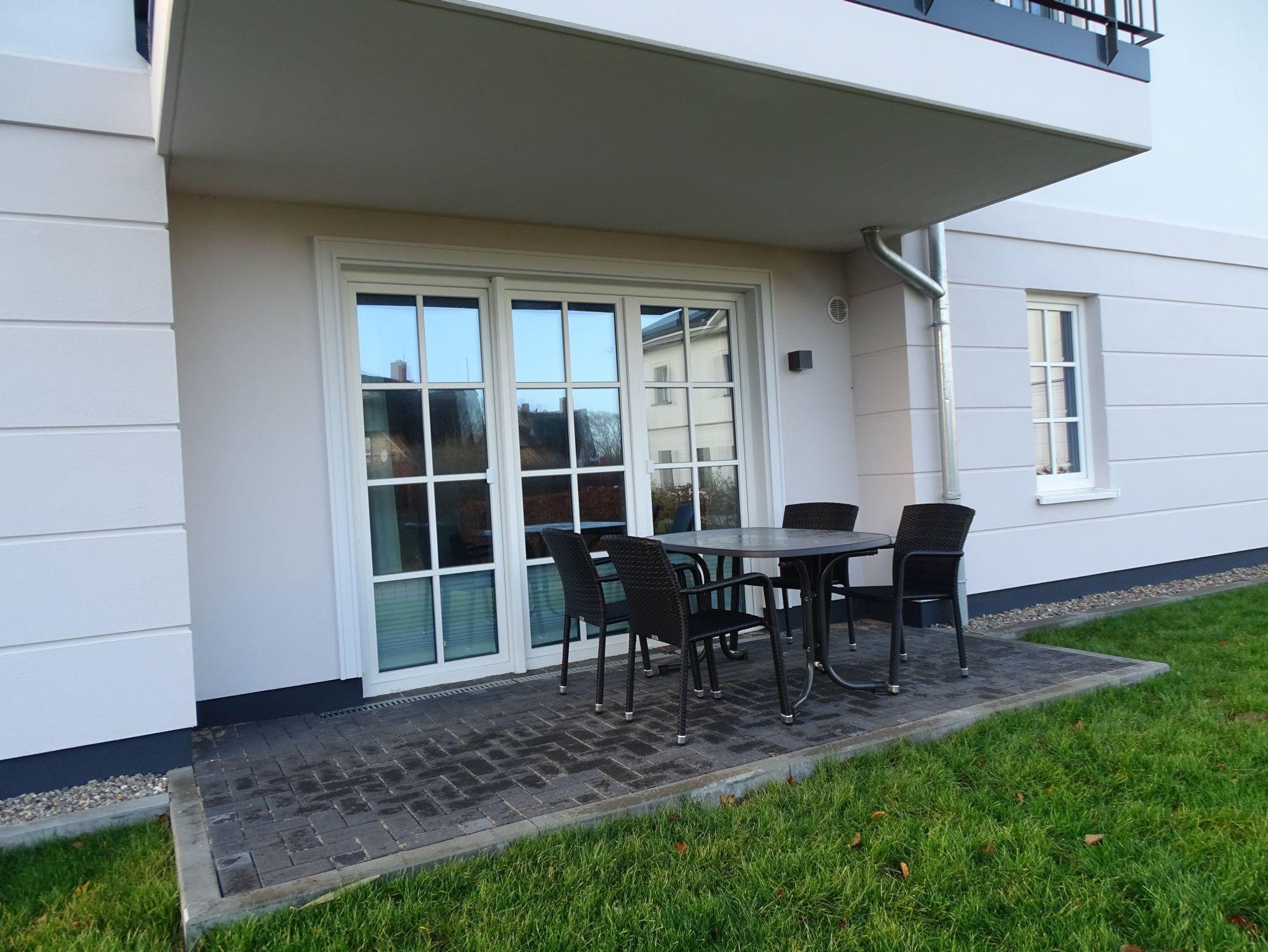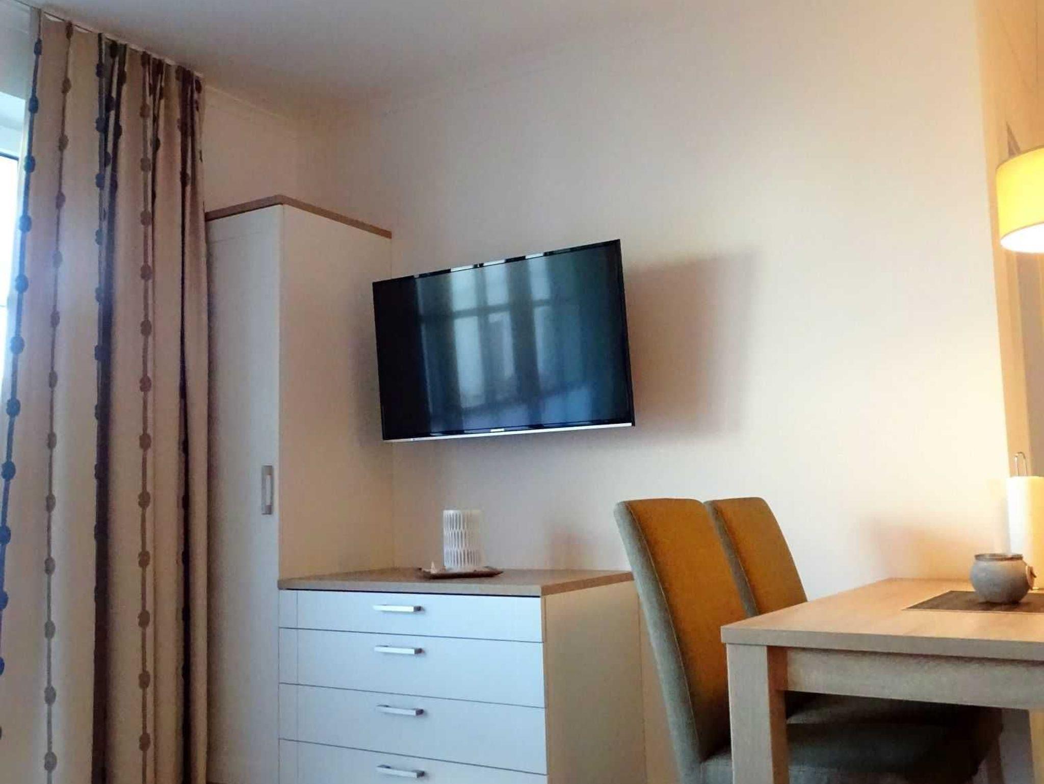 Das 58 m² große Ferienapartment verfügt über eine voll ausgestattete offene Küche mit Geschirrspüler, Kaffeemaschine, Toaster, Wasserkocher, Backofen, Kühlschrank inklusive Gefrierfach sowie über einen Essbereich für vier Personen. Der Wohnbereich empfängt Sie mit einer gemütlichen Doppelschlafcouch (1,40 x 2,00 m), einem Flatscreen-TV und einem komfortablen Sessel mit Fußhocker. Das erste Schlafzimmer ist mit einem modernen Boxspringbett (1,80 x 2,10 m), einem Flatscreen-TV, einem geräumigen Kleiderschrank und einem Safe für Ihre Wertsachen ausgestattet. Im kleineren zweiten Schlafzimmer befinden sich ebenfalls ein Boxspringbett (1,40 x 2,10 m), ein Flascreen-TV und ein Kleiderschrank. Das Tageslicht durchflutete Badezimmer besticht mit einer begehbaren Dusche. Über dem modernen Waschtisch ist ein großer mit indirektem Licht beleuchteter Spiegel installiert. Ein Regal für Ihre persönlichen Dinge und ein Föhn stehen im Bad ebenfalls zur Verfügung. Nach einem erholsamen Urlaubstag am nahgelegenen Naturstrand lässt es sich auf der mit Balkonmöbeln ausgestatteten Terrasse gemütlich entspannen.